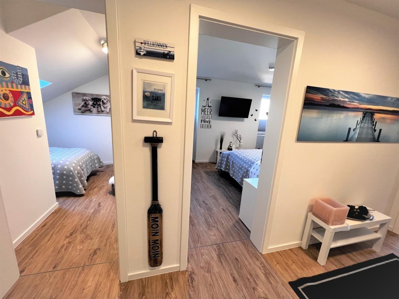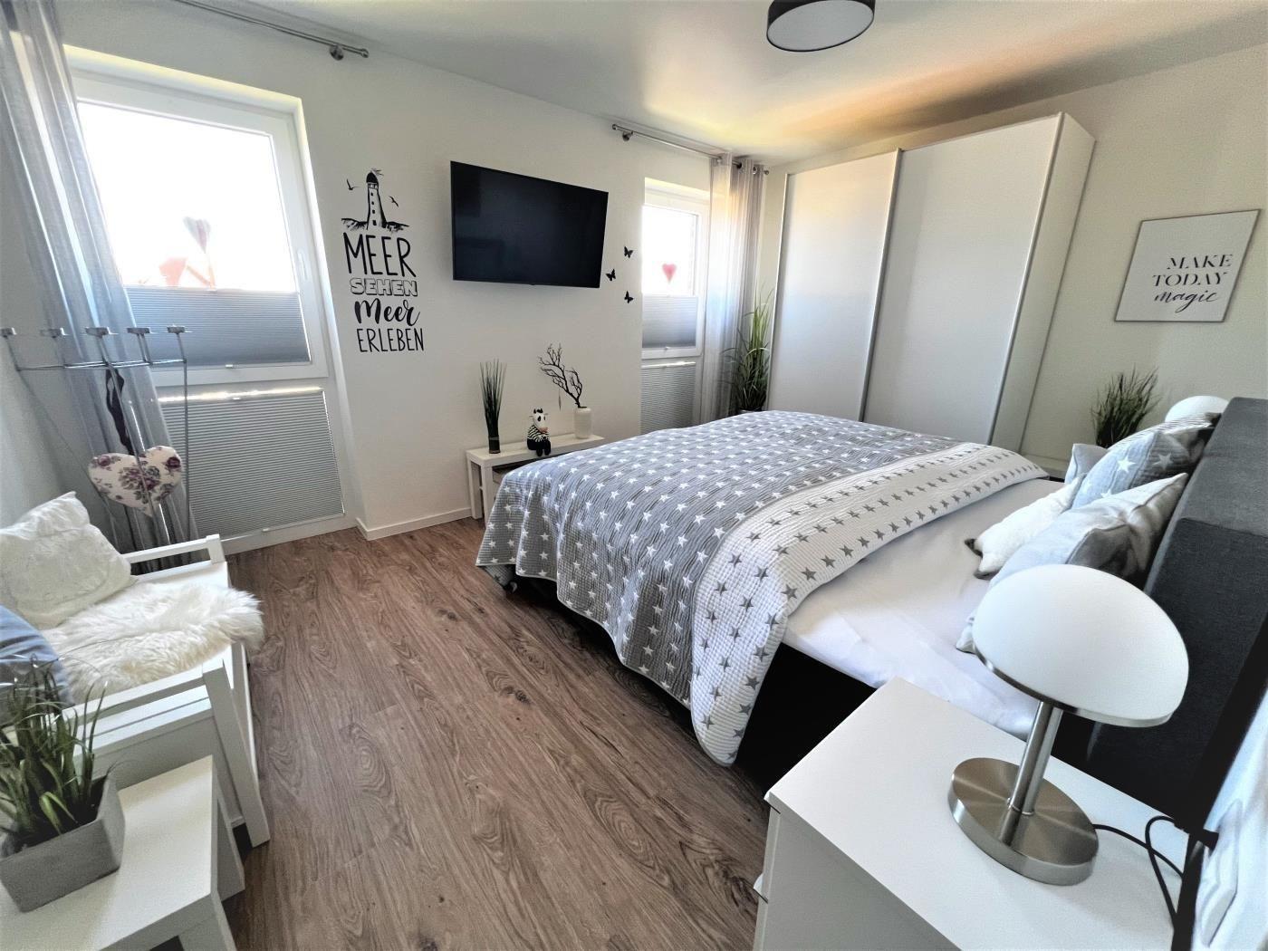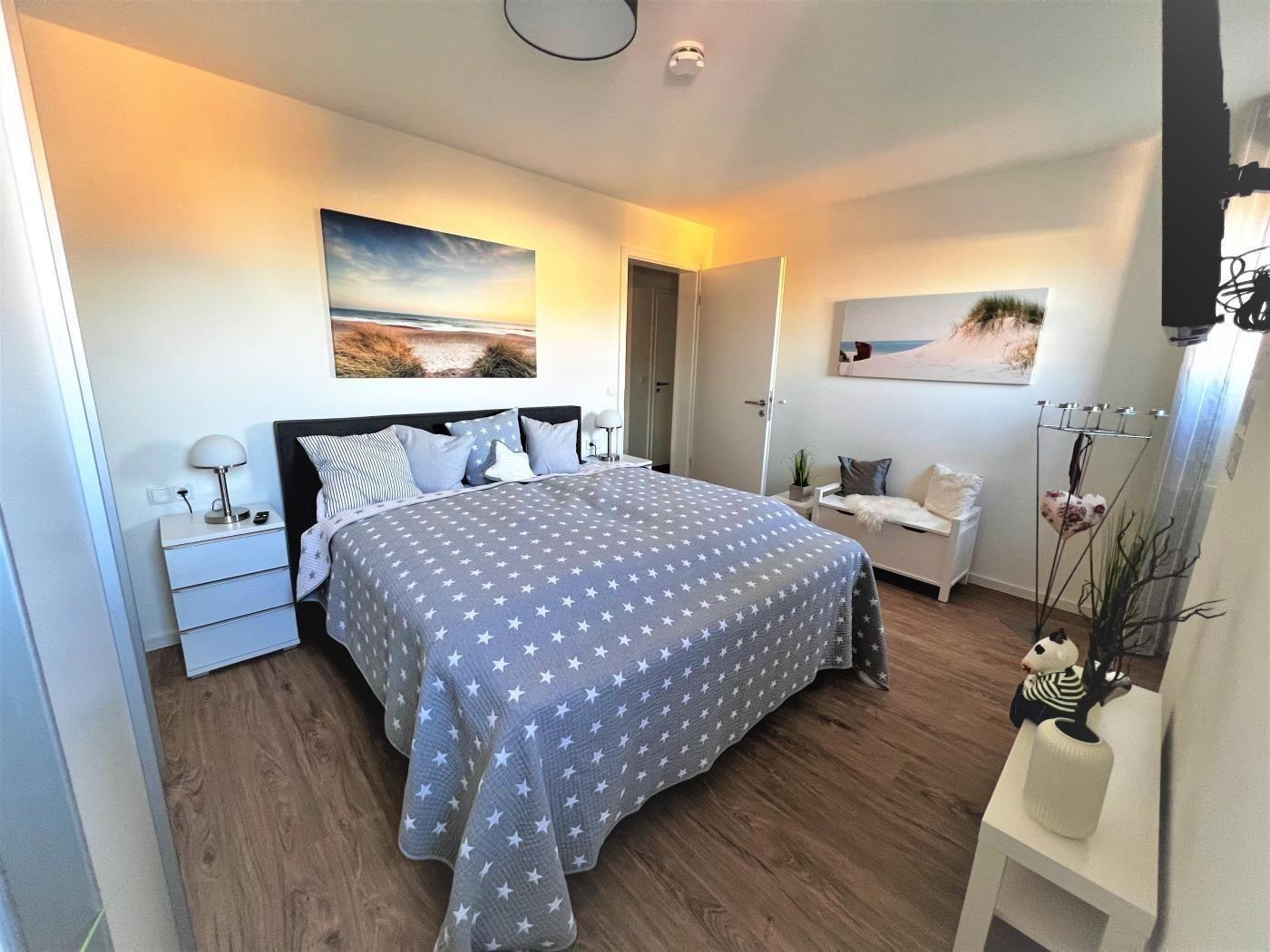 Zwei gemütliche Schlafzimmer sorgen für einen entspannten und erholsamen Urlaubsschlaf. Schlafzimmer 1 mit Boxspringbett 180 x 200cm und großem Smart TV, Schlafzimmer 2 mit Boxspringbett 90 x 200cm.