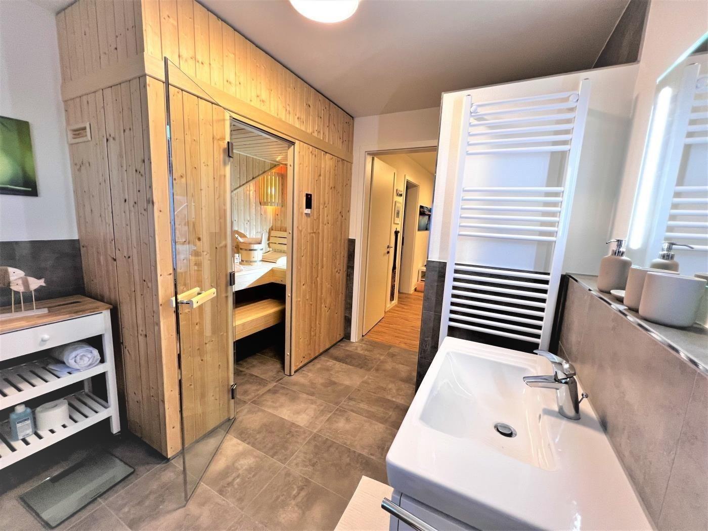 Ein Highlight ist das großzügige Bad mit bodengleichem Duschbereich und einer finnischen Sauna, weshalb das Muschelhus zu jeder Jahreszeit eine exzellente Wahl ist.