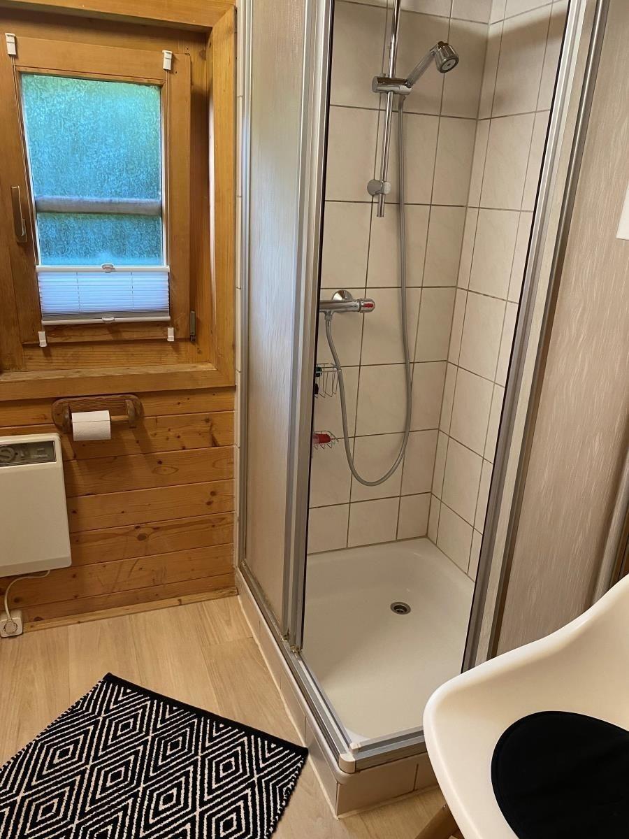 Der Holzbungalow liegt auf einem schönen Reiterhof, abseits der Hofanlage mit Blick auf die Wiesen. Er besteht aus einem gemütlichen Wohnzimmer mit Sitzecke ( Schlafsofa ) und einem Essbereich für 4 Personen. Von dem Wohnzimmer aus geht eine steile Treppe unter das Dach, wo sich das Doppelbett befindet. Das Kinderzimmer verfügt über ein Etagenbett. An das Wohnzimmer grenzt die Küche mit Backofen und Ceranfeld und das Bad mit Dusche und WC. Der Bungalow hat in jedem Raum Fenster und ist hell und freundlich. Die Abendsonne können Sie auf der Terrasse genießen.