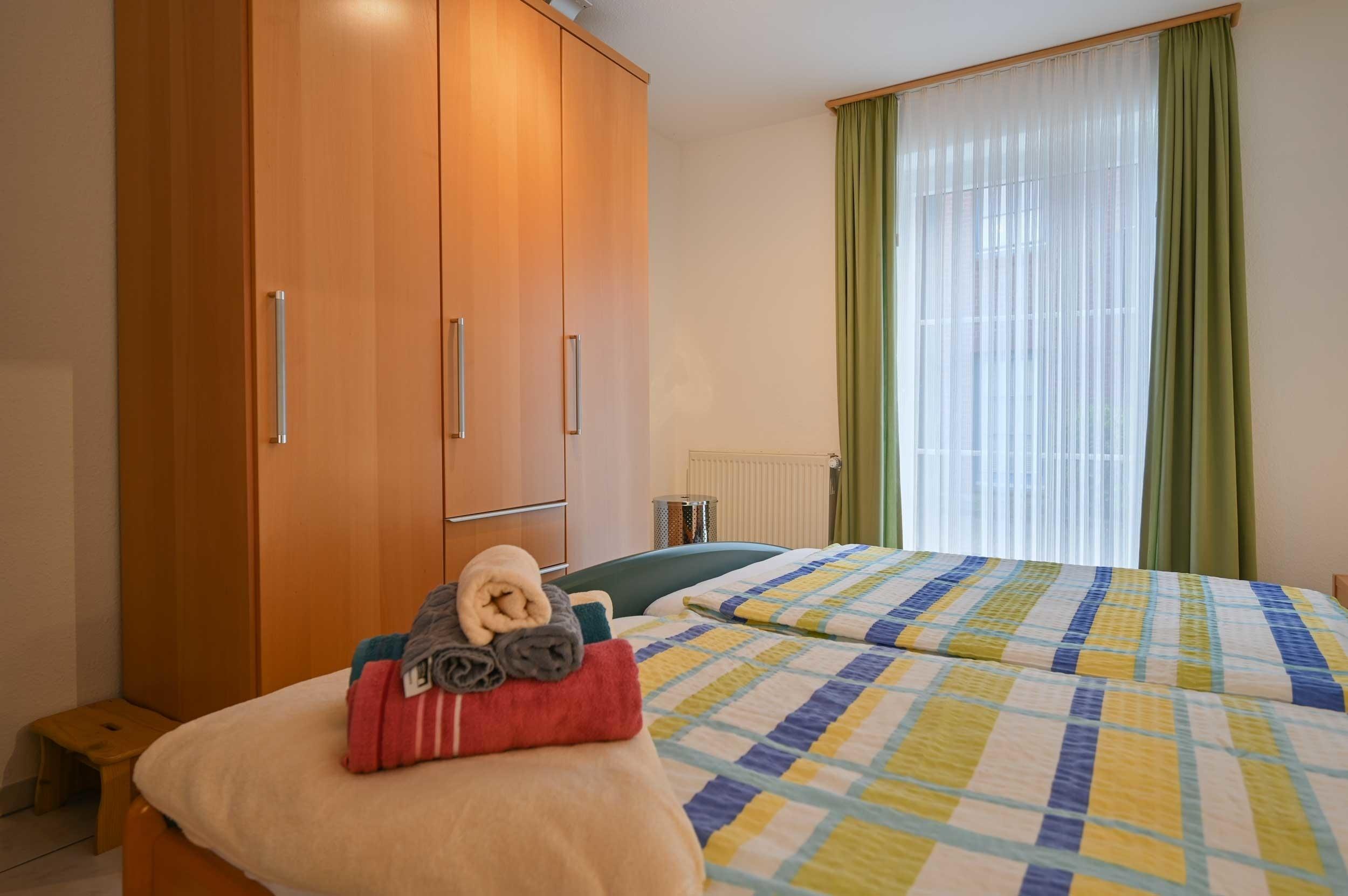 Das große Schlafzimmer ist mit Doppelbett, Nachttischen mit Leseleuchten und einem großen Kleiderschrank eingerichtet. Das Kinderschlafzimmer besteht aus zwei Einzelbetten und einem Kleiderschrank.