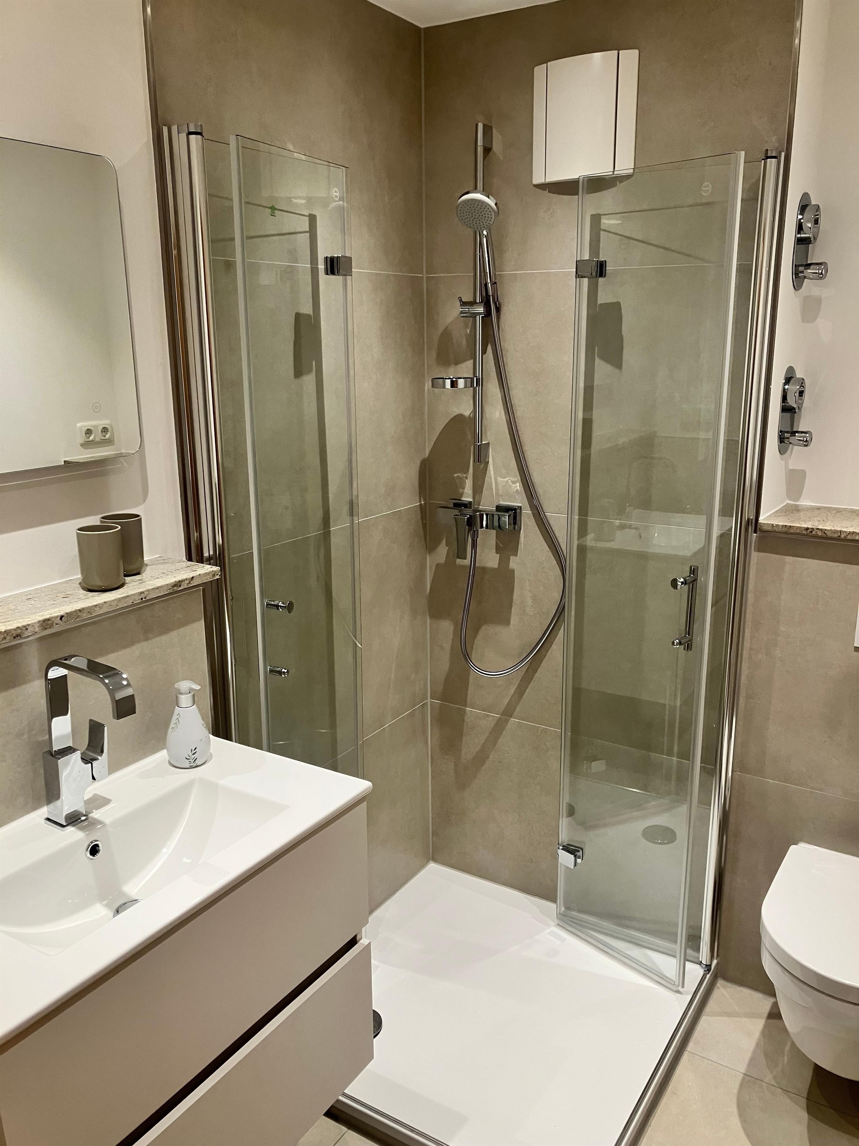 Das neu renovierte Badezimmer ist mit einem Waschbecken, einer Dusche und einem WC bestens ausgestattet.