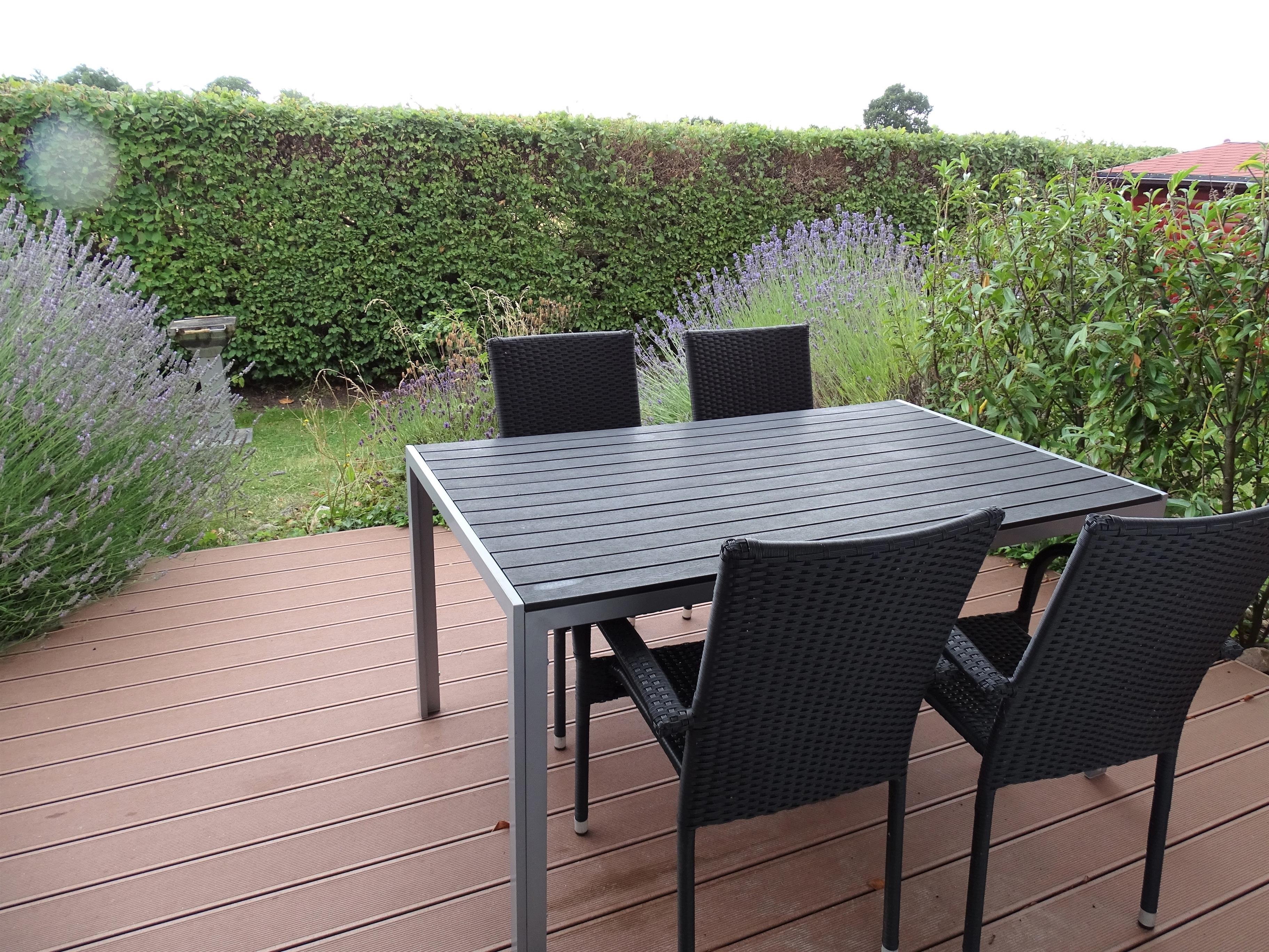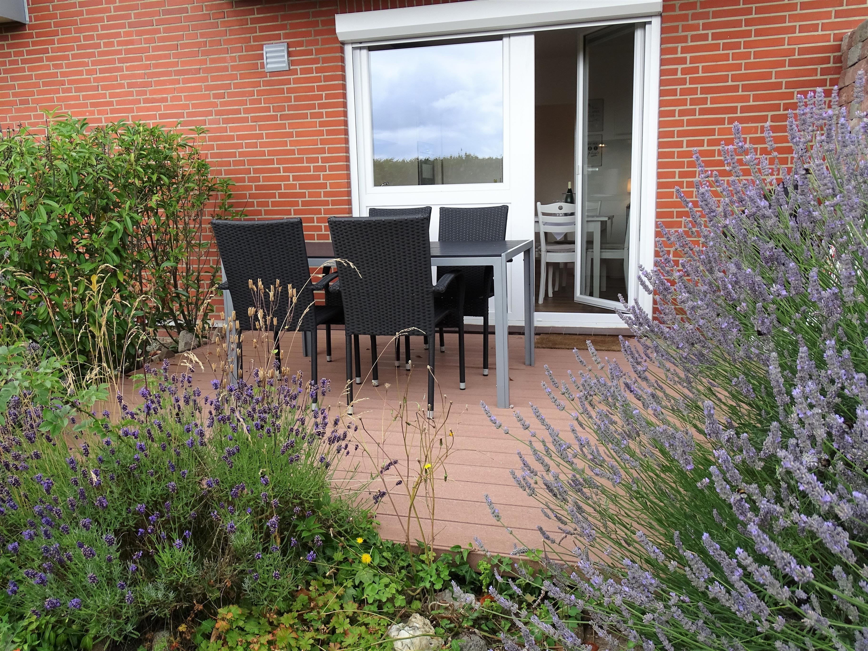 Die Terrasse ist nach Süden ausgerichtet und mit Gartenmöbeln bestückt.