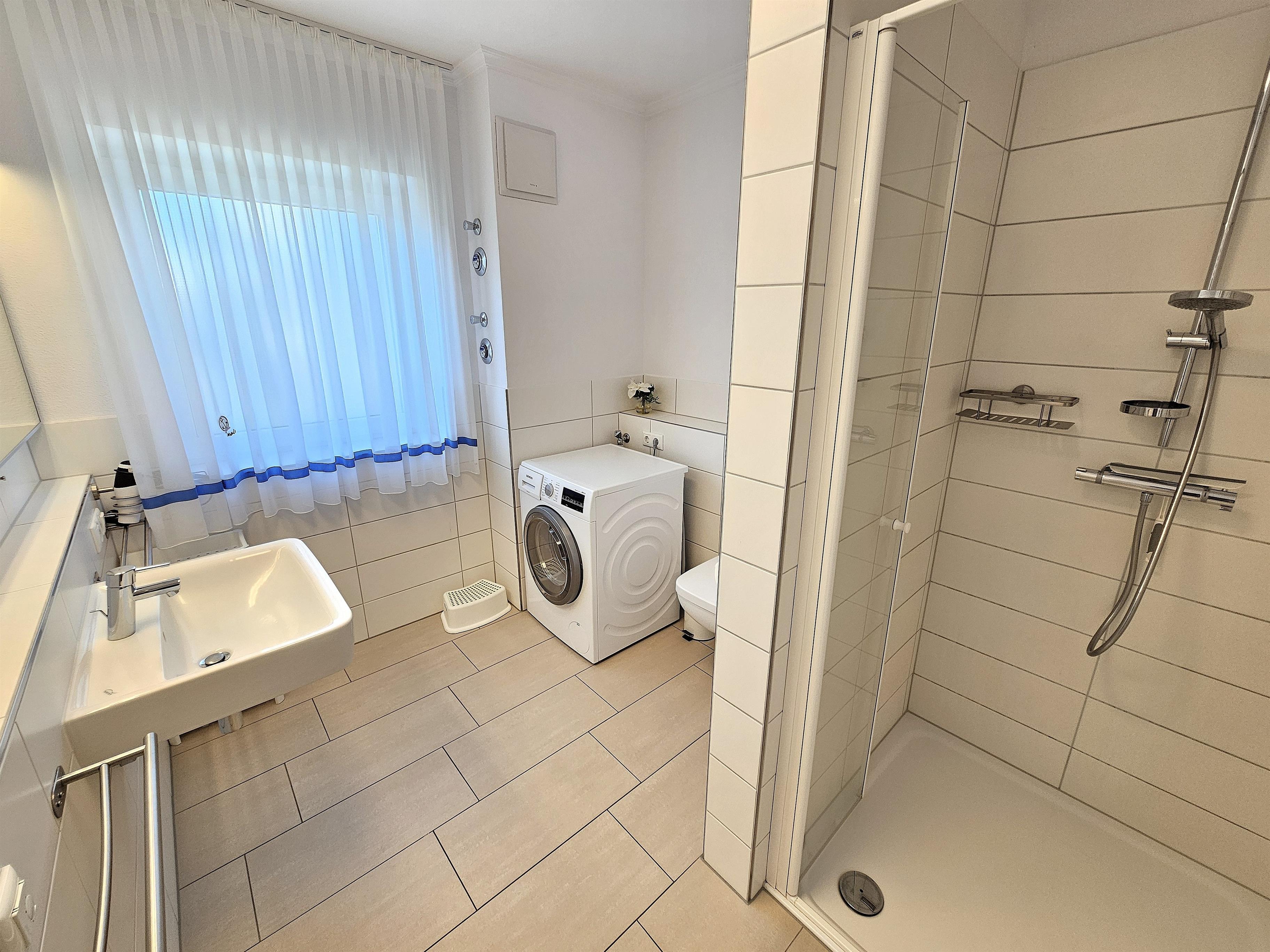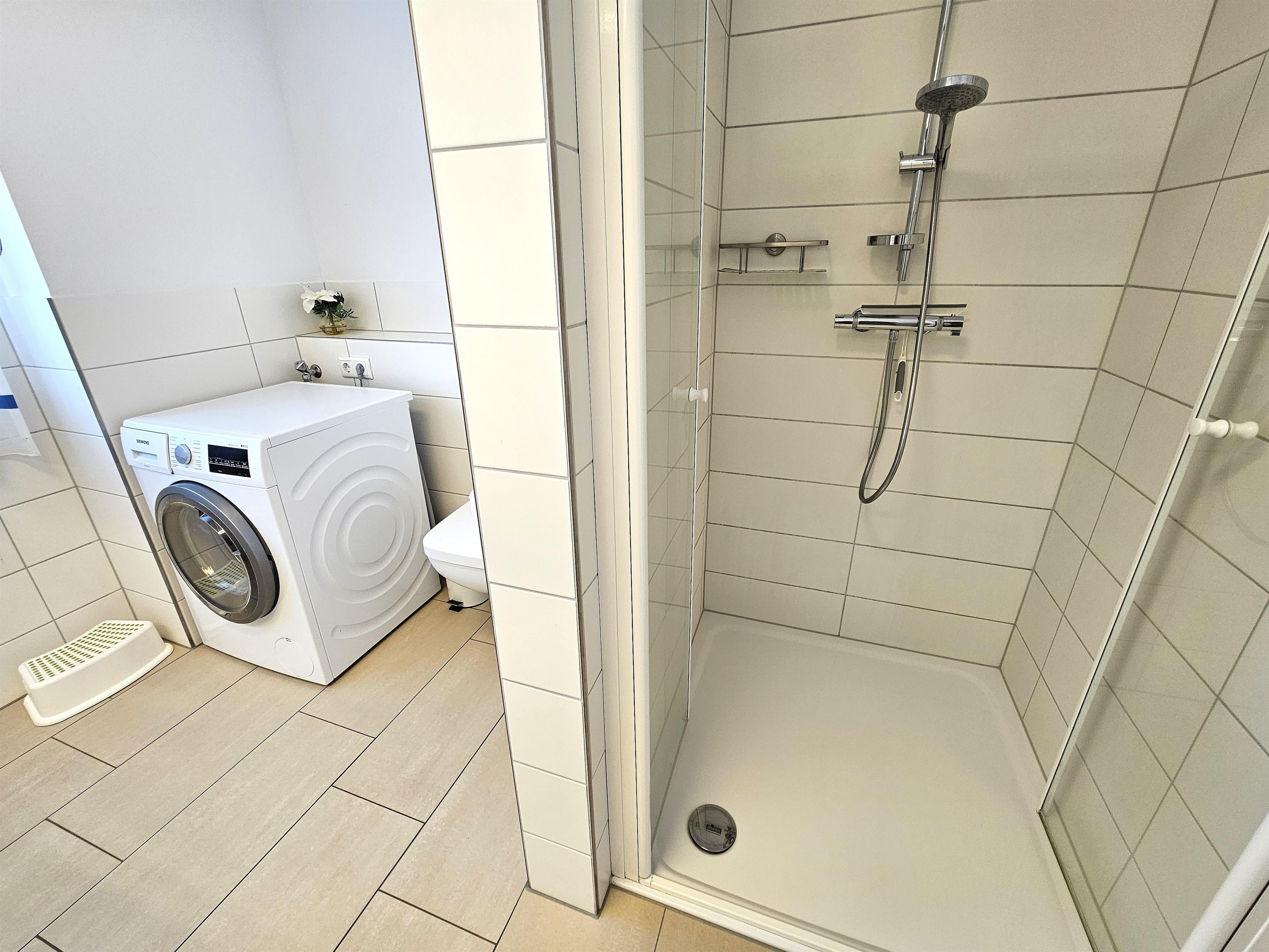 Duschbad (bodentiefe Dusche) + Duschbad mit Waschtrockner.