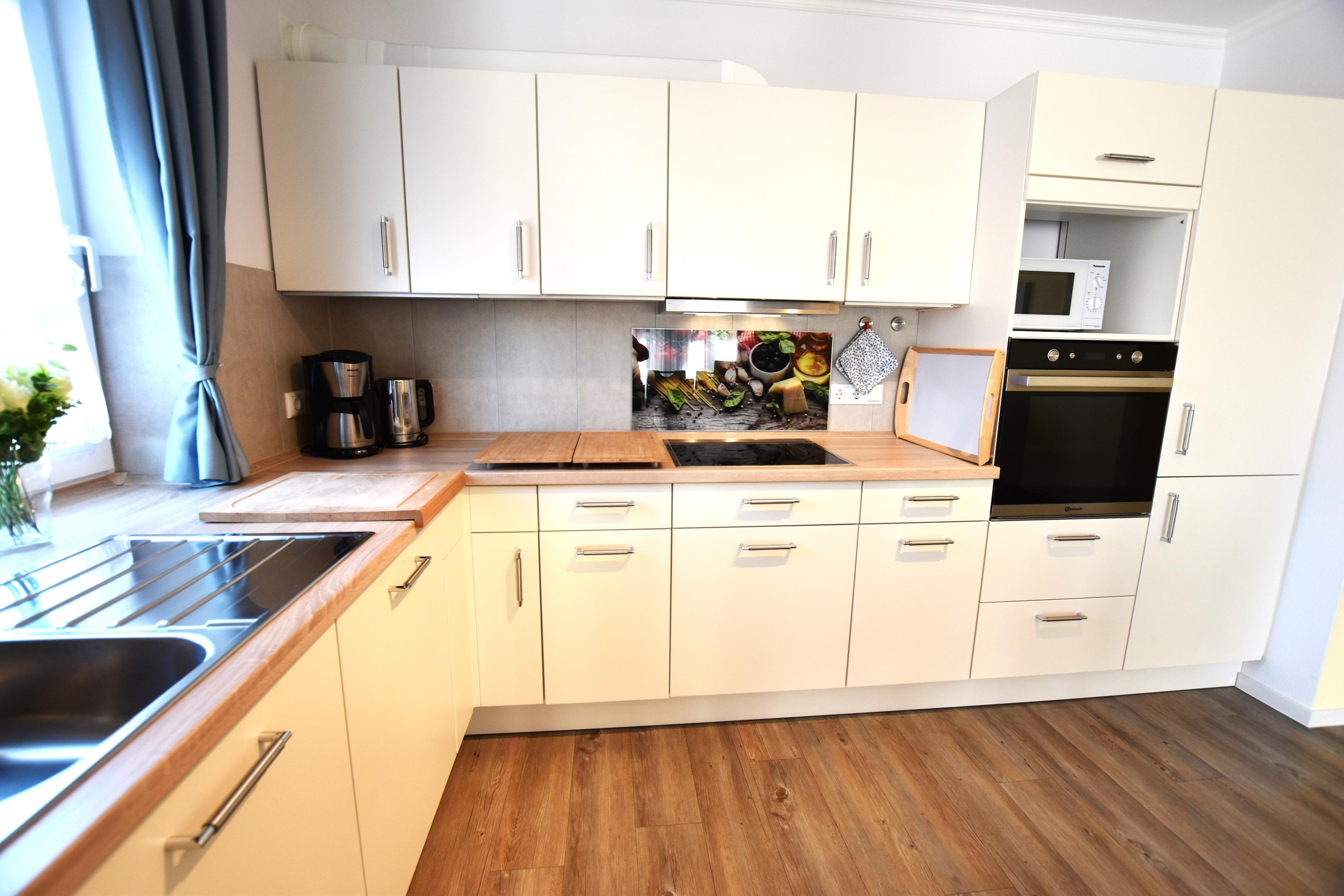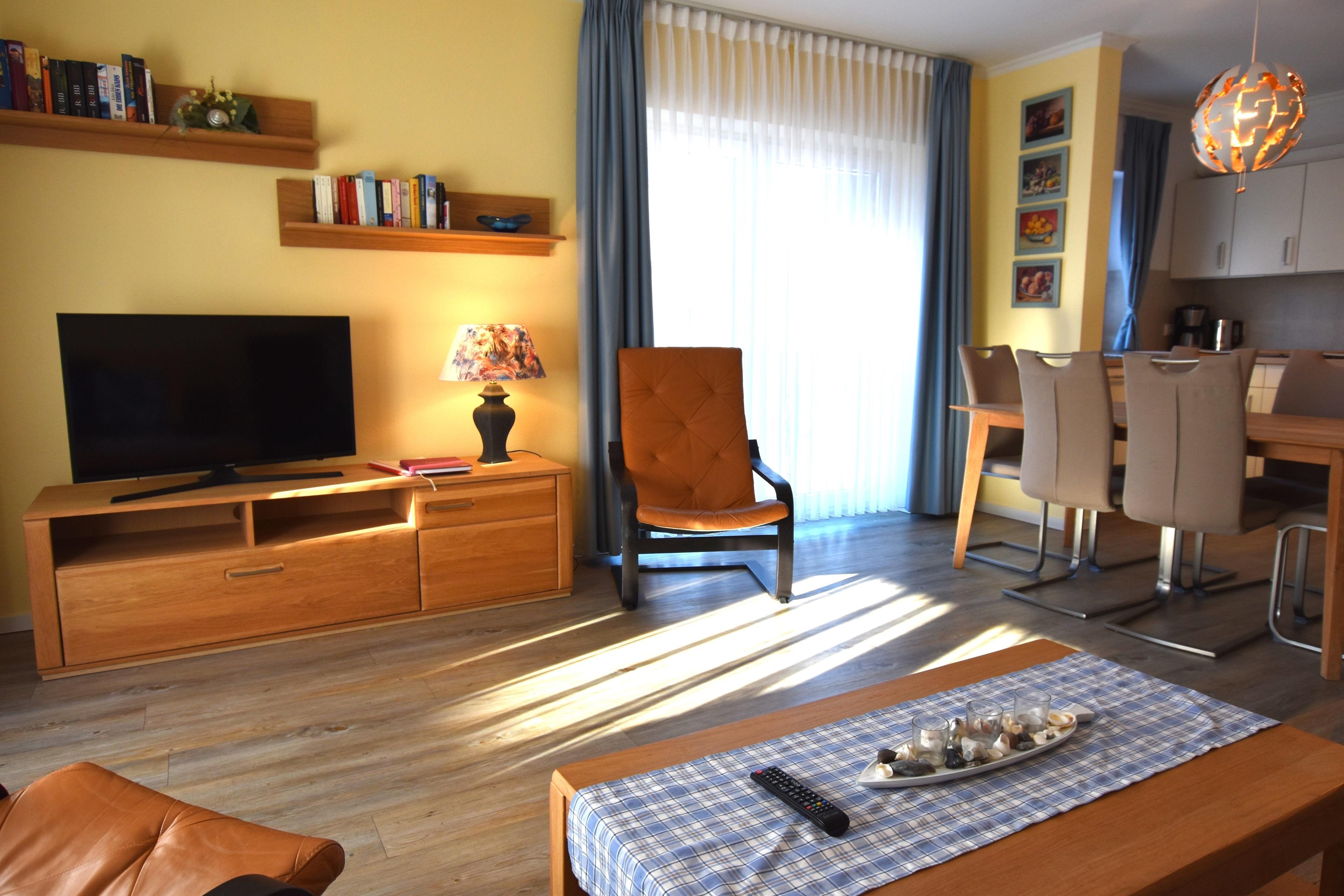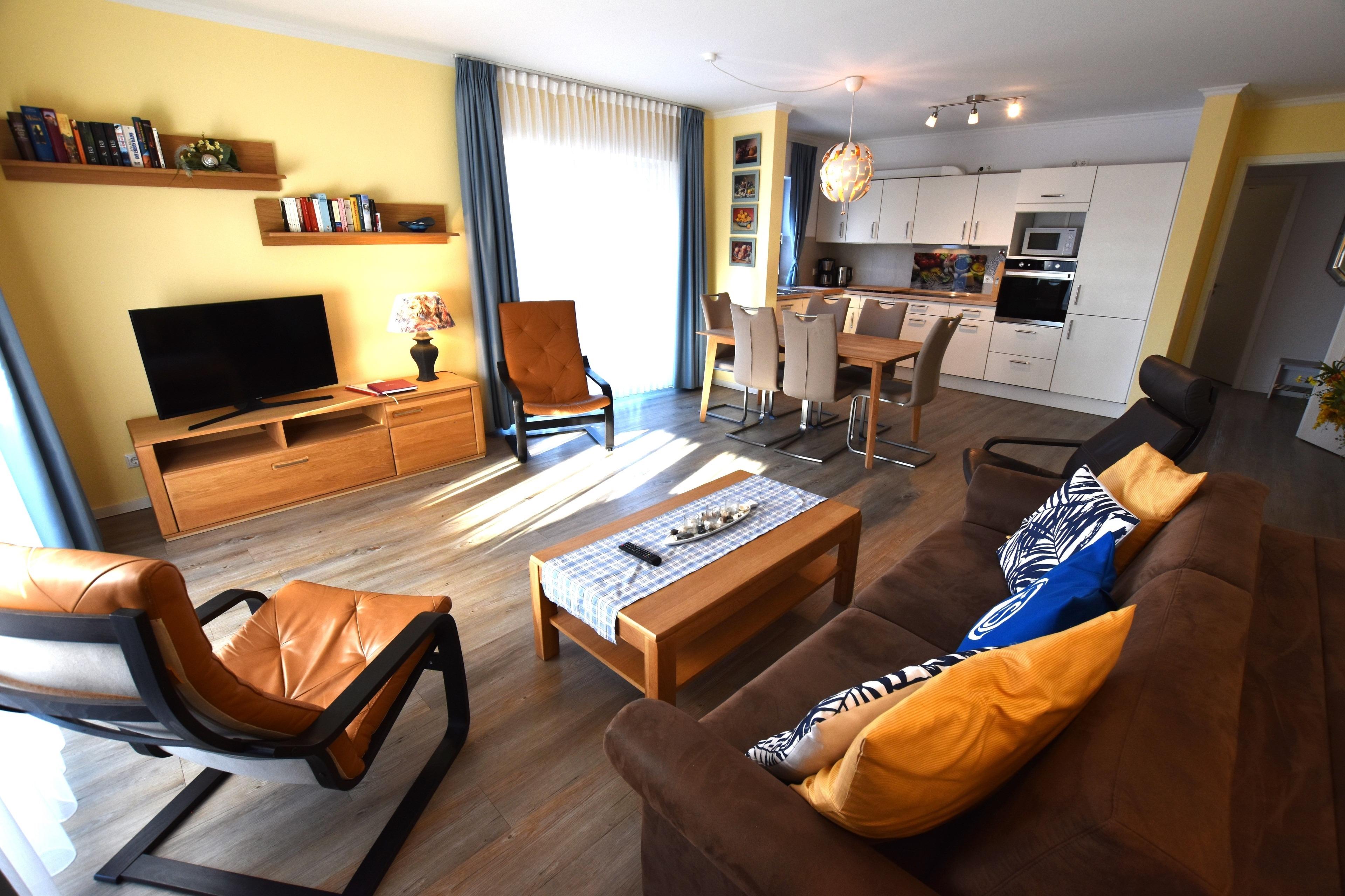 Offene Küche mit Geschirrspüler, Backofen, Kühl,-Gefrierschrank und vielem mehr. Wohn-/Esszimmer mit Couchgarnitur (Schlafcouch), TV, Esstisch mit Stühlen, Verdunklungsrollos und direktem Zugang zum Südbalkon mit Strandkorb.