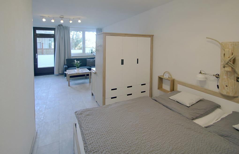 Die Ferienwohnung Seesand bietet Platz für 4 Personen auf 54 m² und liegt im Erdgeschoss des Hauses Panorama. Durch die Lage im Erdgeschoss ist die Wohnung auch für Menschen mit Gehbehinderung geeignet. Auf der im Grünen angelegten, großen Terrasse können Sie den Abend gemütlich ausklingen lassen. Der große Wohnbereich mit Essecke und abgetrenntem Schlafbereich mit Doppelbett ist hell und freundlich eingerichtet. Des Weiteren bietet die Wohnung ein separates Schlafzimmer mit 2 Einzelbetten. Eine komplett eingerichtete Küche lässt kaum Wünsche offen. Das Badezimmer ist mit Dusche und WC ausgestattet. Ihr Hund ist hier ebenfalls ein gern gesehener Gast und der Hundestrand ist nur 2 Gehminuten entfernt von der Wohnung.