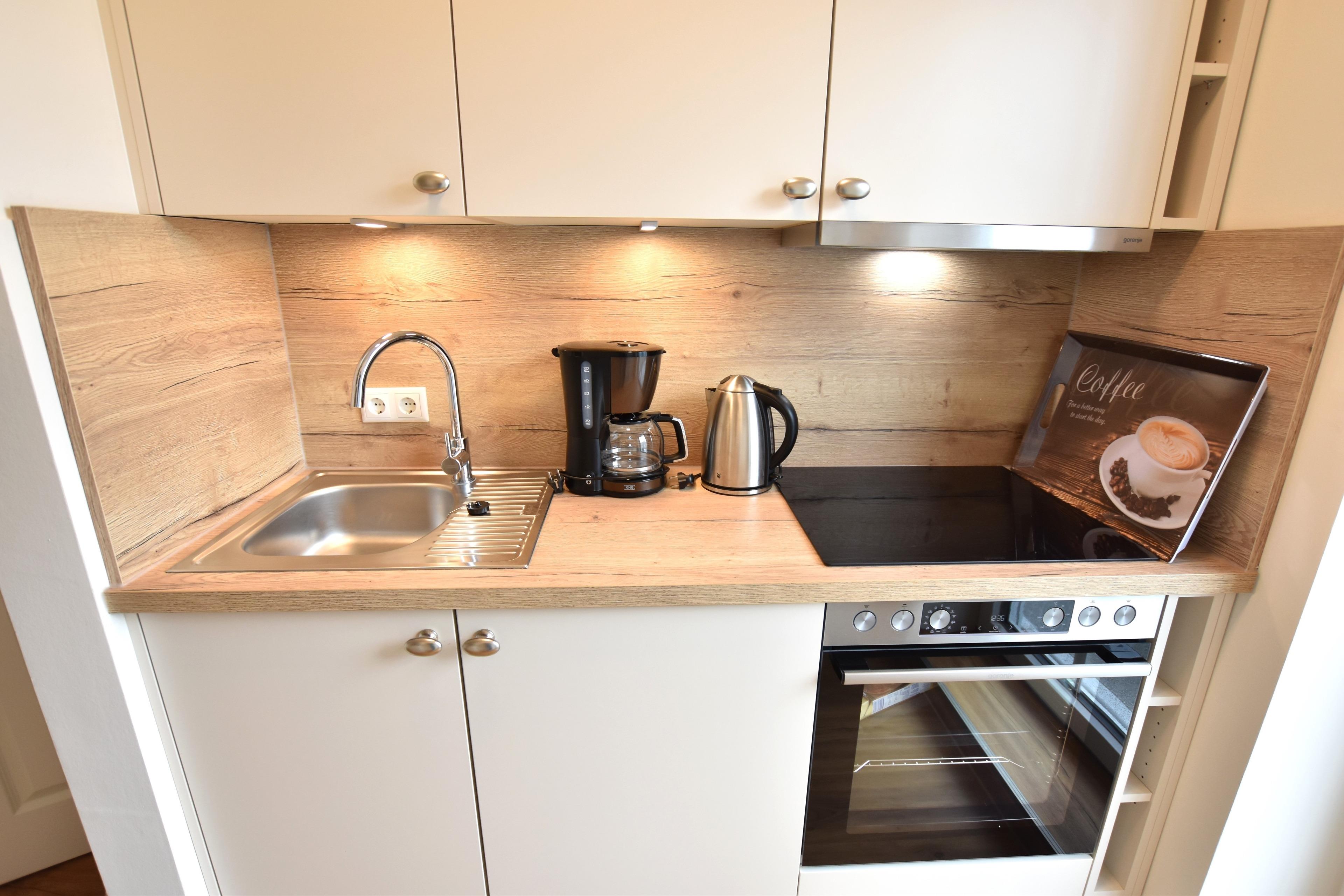 Die 2-Zimmer-Ferienwohnung hat einen Flur mit offener Küche, die mit einem Herd (Ceranfeld) mit Backofen und Kühlschrank ausgestattet ist und bietet Zugang zum bestuhlten Balkon in Süd-West-Ausrichtung.