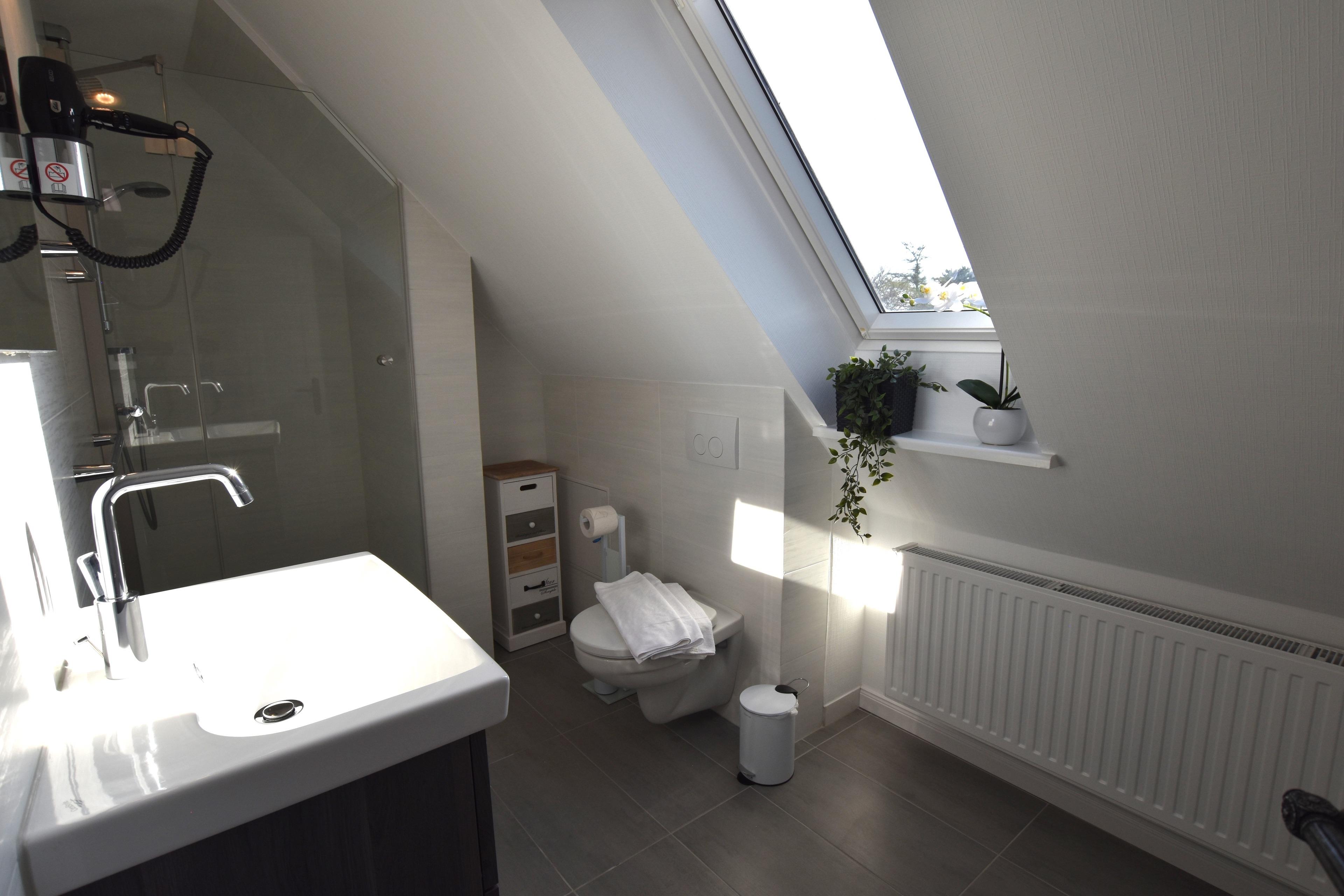 Das Badezimmer hat eine Dusche, ein WC und einen Waschtisch mit Spiegel.