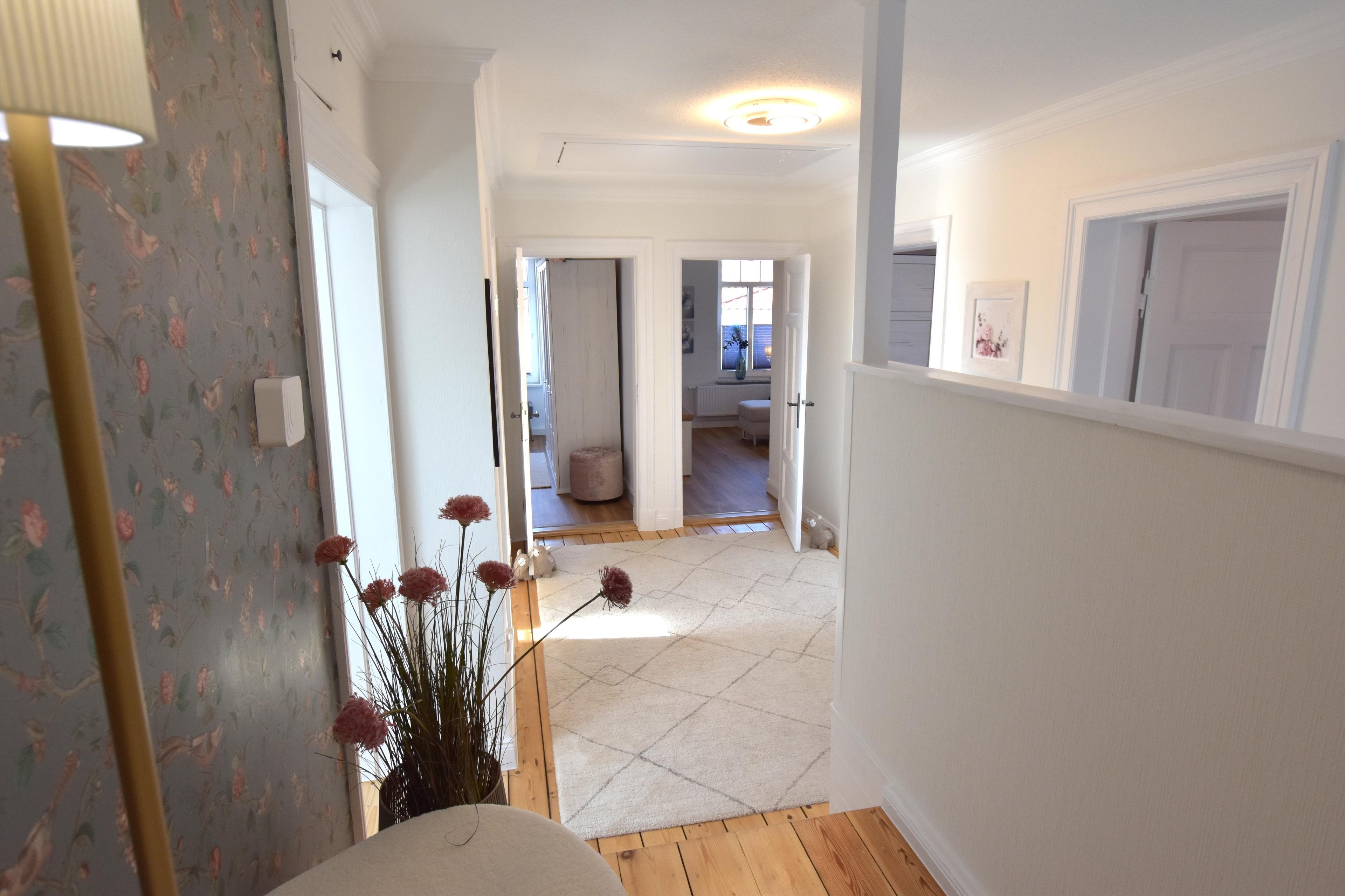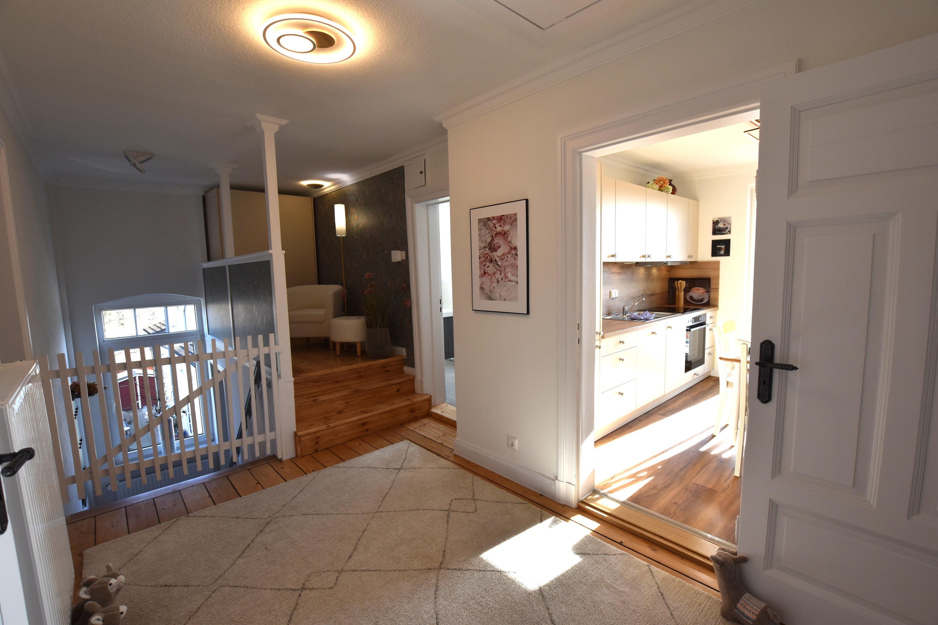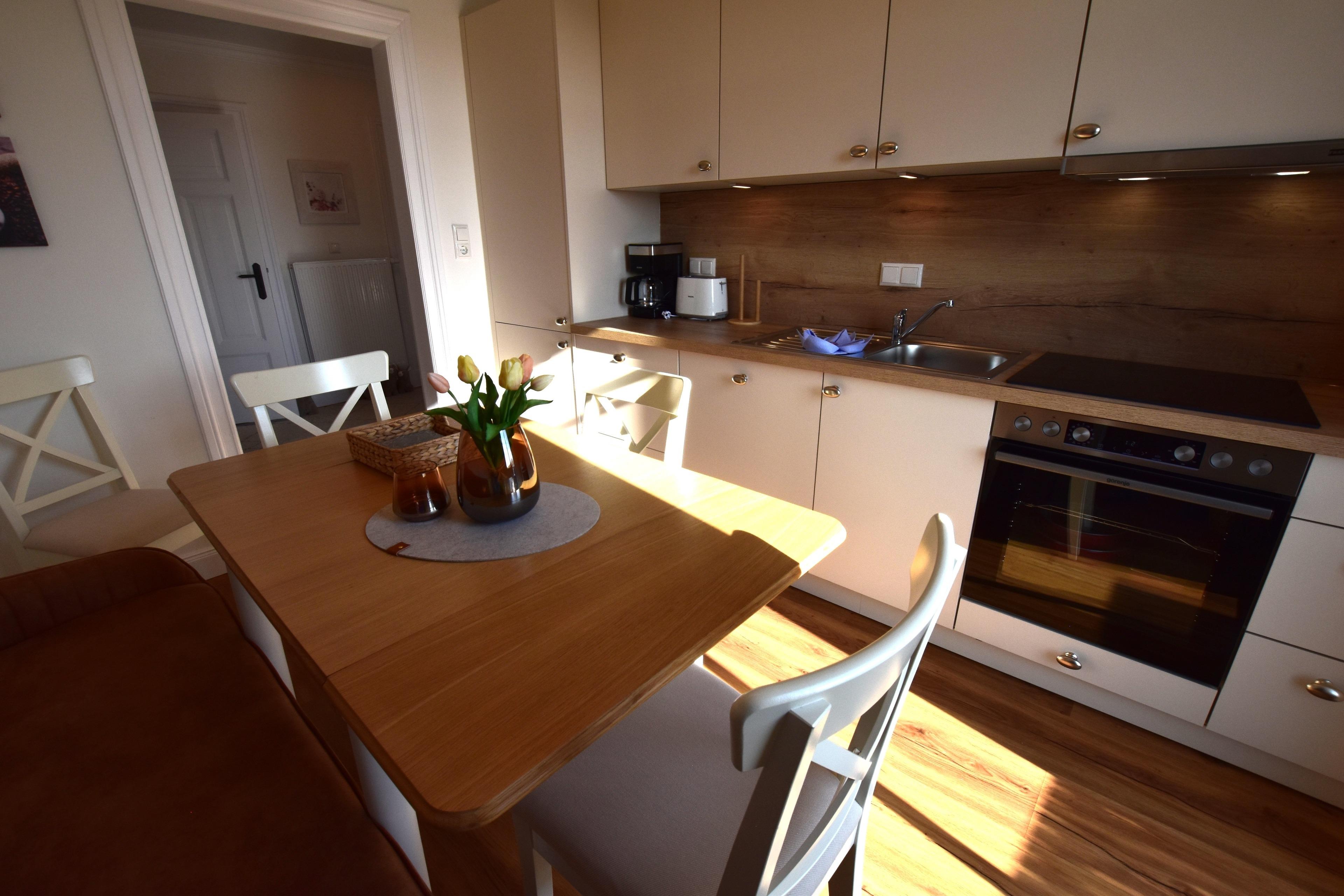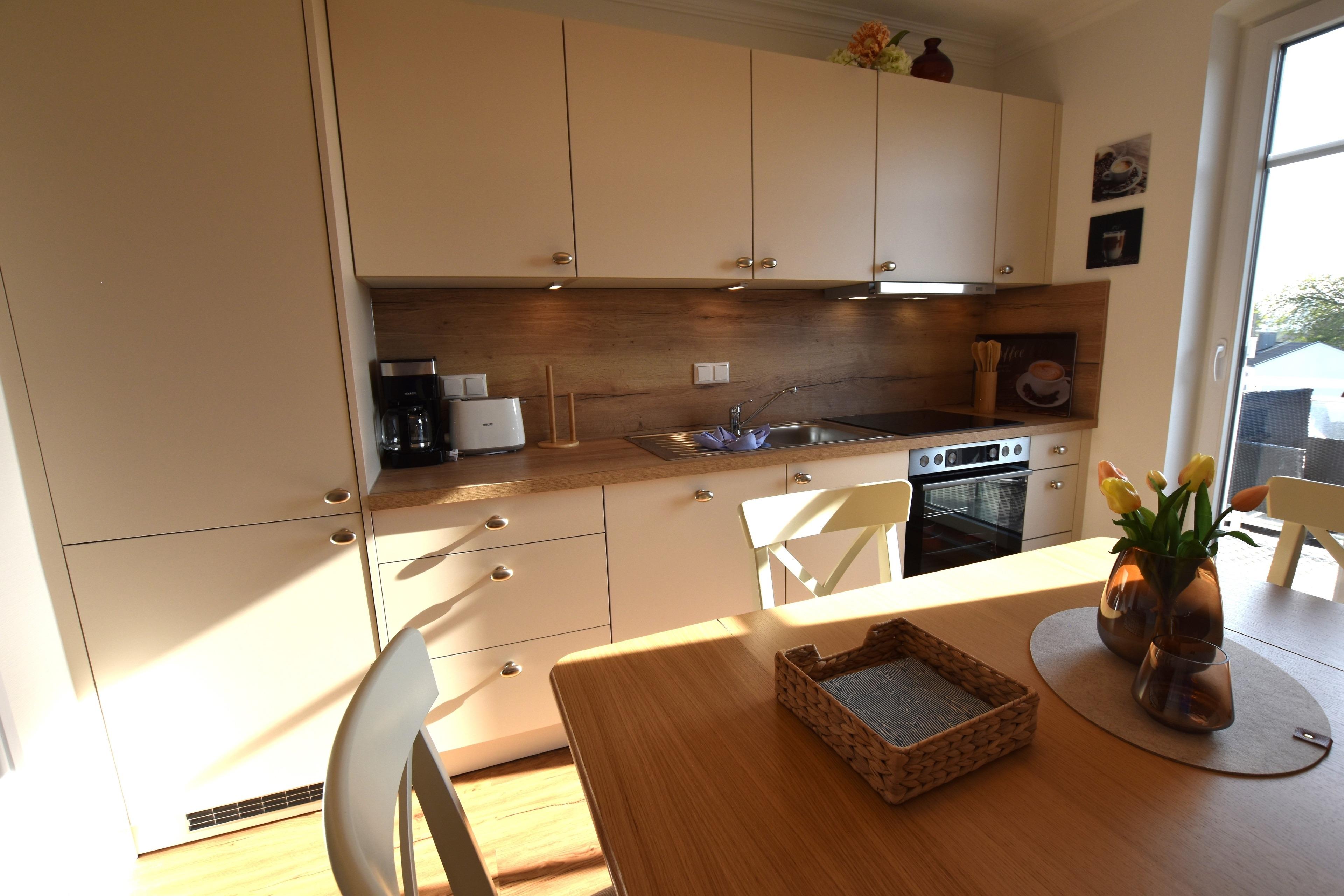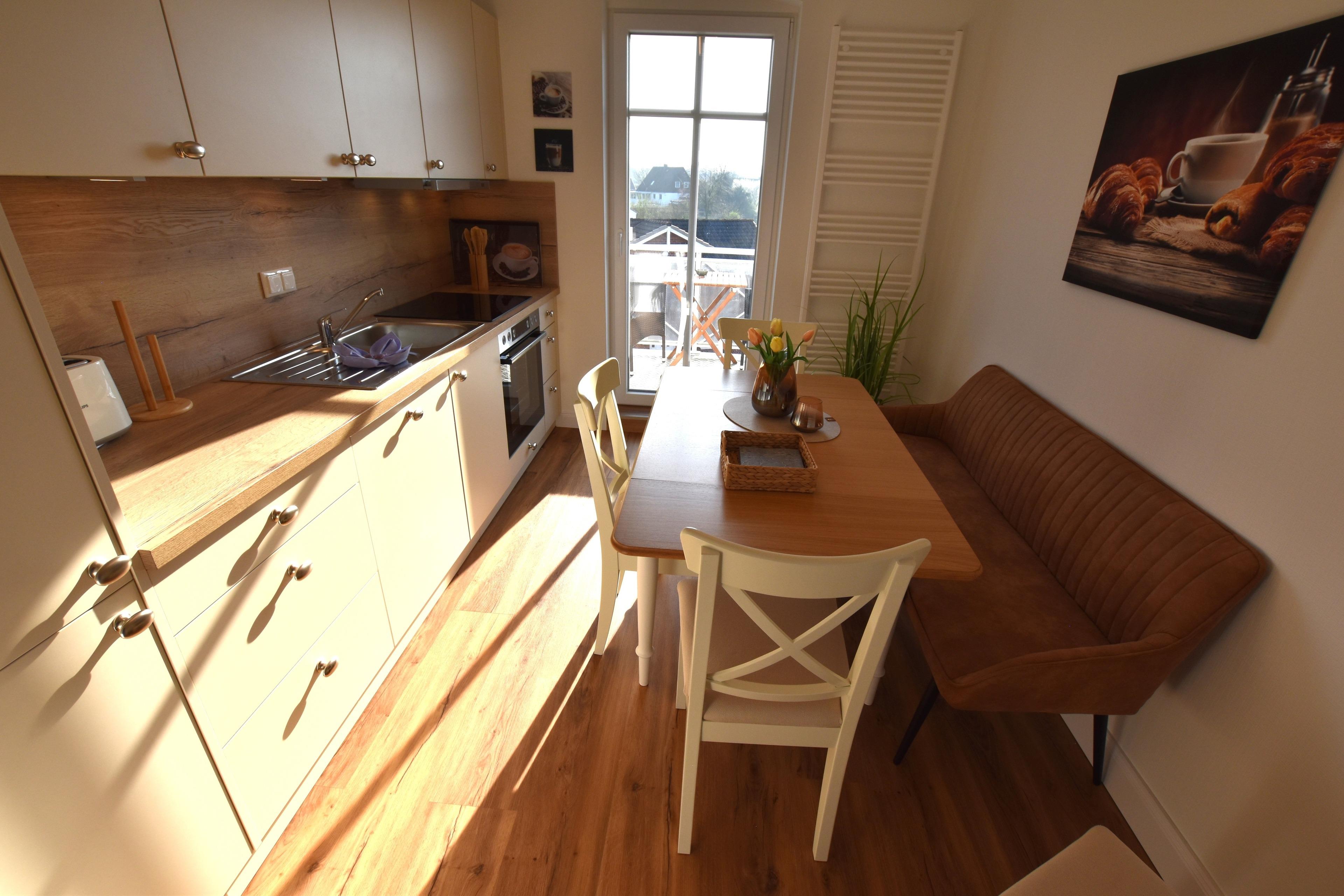 Die 4-Zimmer-Ferienwohnung hat einen geräumigen Flur. Die Küche ist mit einem Herd mit Backofen, Geschirrspüler, Kühl-Gefrier-Kombination und einer Essecke ausgestattet. Durch die Küche gelangen Sie auf den Balkon mit Süd-West-Ausrichtung.