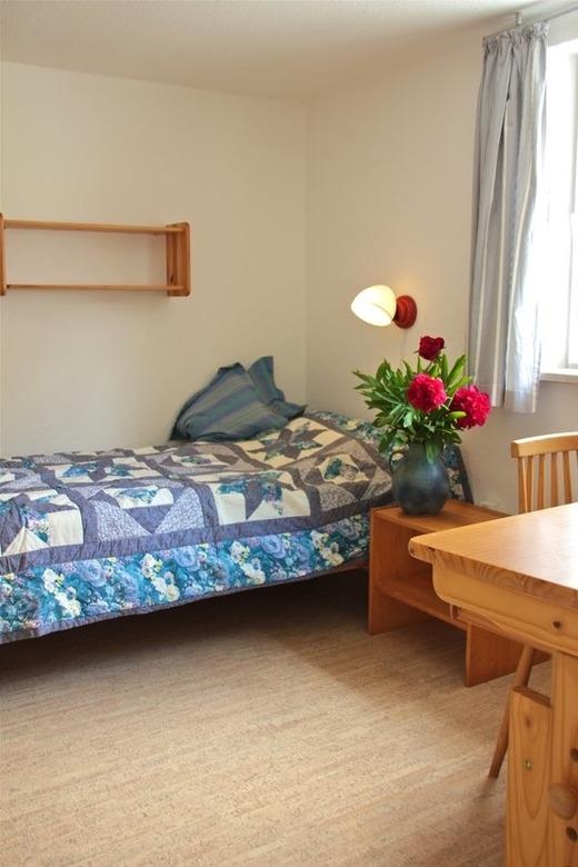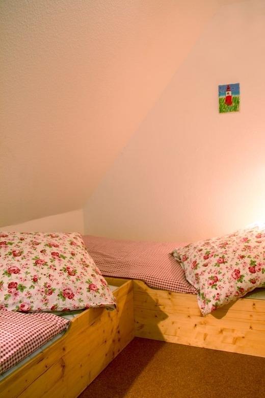 Diese reihenhausartige Wohnung mit insgesamt drei Schlafzimmern (2 Erwachsene und 3 Kinder) geht über zwei Etagen. Im Erdgeschoss findet sich ein offener Wohn- und Essbereich, eine kleine Küche mit Spülmaschine, das Bad mit Strandsteinapplikationen und ein Kinderzimmer mit einem Bett. Oben ist das Elternschlafzimmer und ein weiteres Kinderzimmer mit zwei Betten. Vor dem Haus ist eine große Terrasse mit Abendsonne.