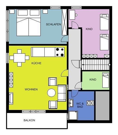 Das Obergeschoss des weißen Hauses ist eine geräumige Wohnung mit Wohnküche mit schöner Aussicht über die Felder und geräumigem Süd-Balkon, zwei Schlafzimmern, einer zusätzlichen Schlafkammer mit 140er Bett (für ein Kind bis ca. 6 Jahre) und DU/WC.
