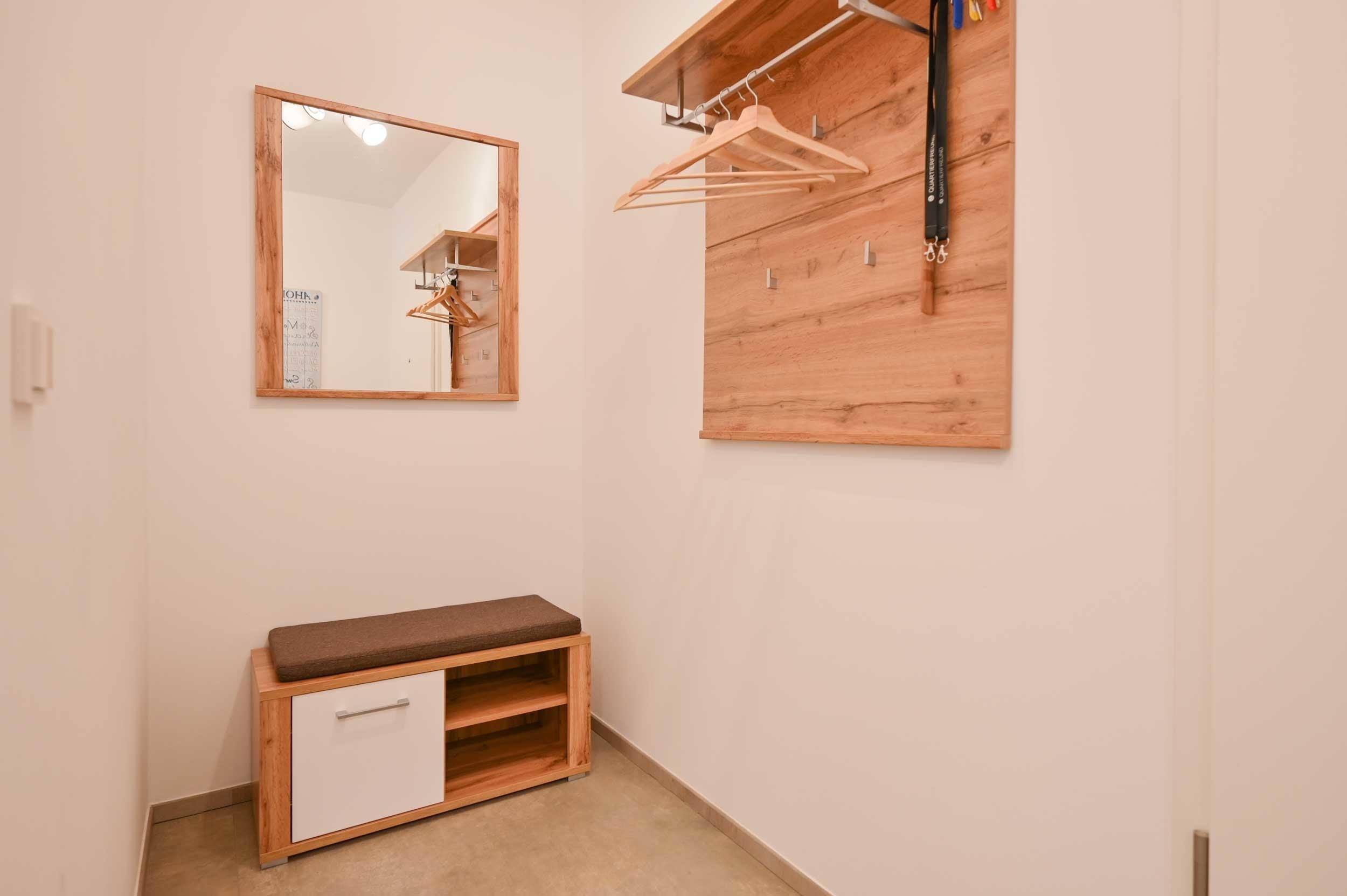 Der Garderobenbereich bietet genug Platz, um einen Kinderwagen bequem abzustellen.