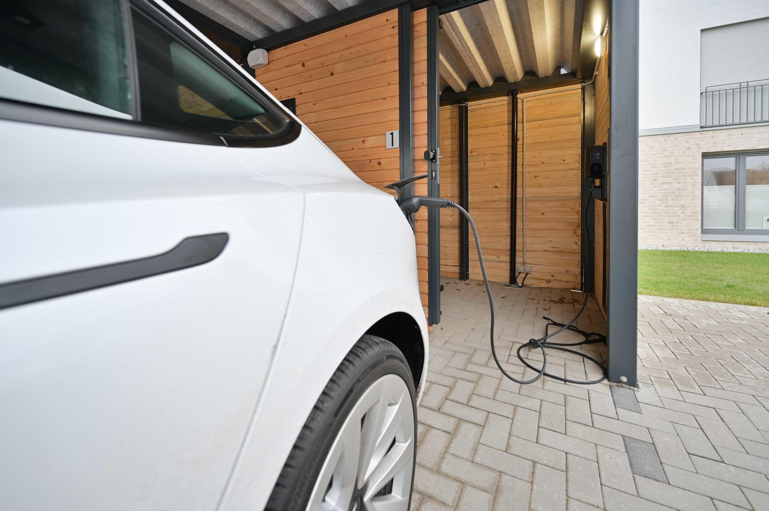 Sie parken bequem im Carport mit E-Ladestation direkt vor dem Haus. Der dazugehörige abschließbare Abstellraum ermöglicht es, Ihre Fahrräder sicher abzustellen.