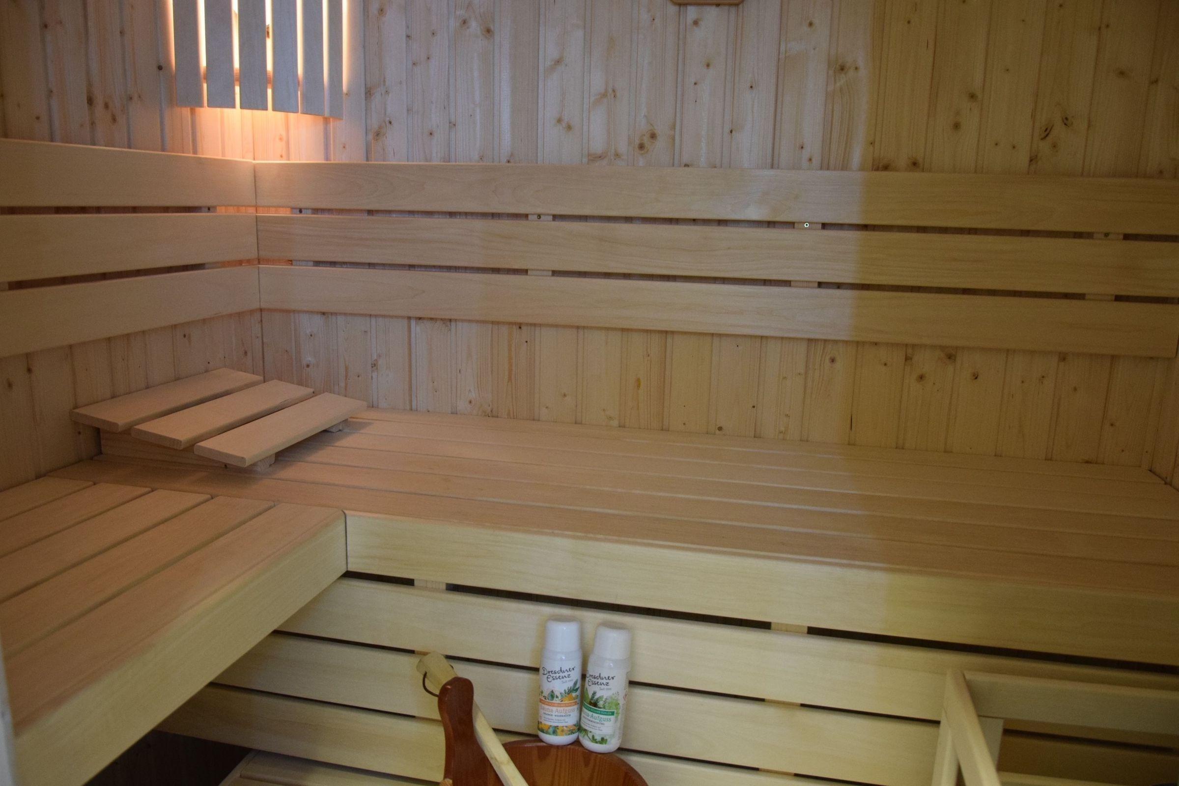 - ein geräumiges Bad mit Fenster, finnischer Sauna und bodentiefer Dusche mit Bonanza - Tür