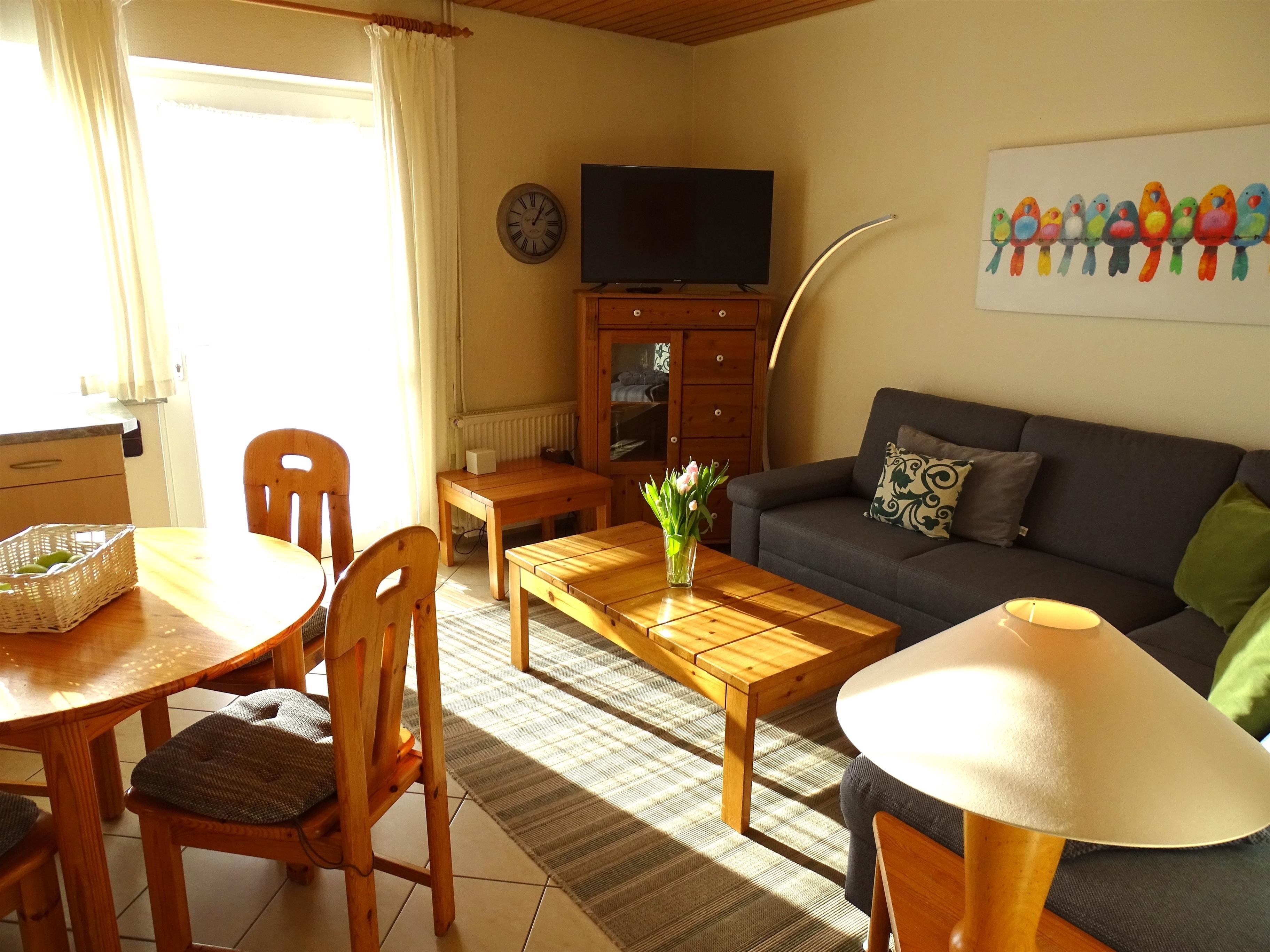 Die 3- Zimmer Ferienwohnung befindet sich im Erdgeschoss des Hauses. Aufgeteilt ist sie in: 2 komplett eingerichtete Schlafzimmer mit Doppelbetten und verstellbaren Gesundheitsrahmen und Federkernauflage. Gemütliches Wohnzimmer mit Sitzgruppe, Eßtisch und integrierter Einbauküche mit dem Ausgang zur möbilierten Südterrasse. Einbauküche voll eingerichtet mit Kühlschrank, Geschirr, 4-Plattenherd mit Backofen, Spülmaschine, Toaster, Kaffeemaschine usw.