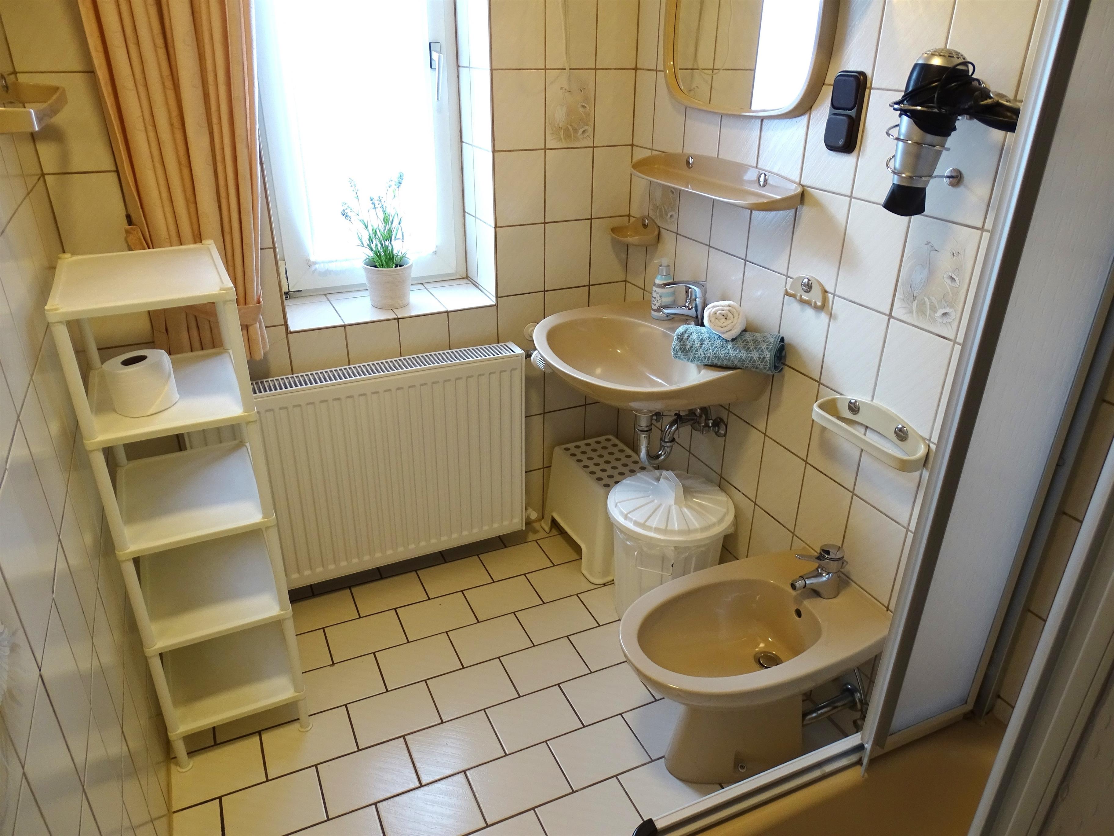 Duschbad mit tiefem Badebecken, WC und Bidet. Alle Räume sind zentral beheizt.