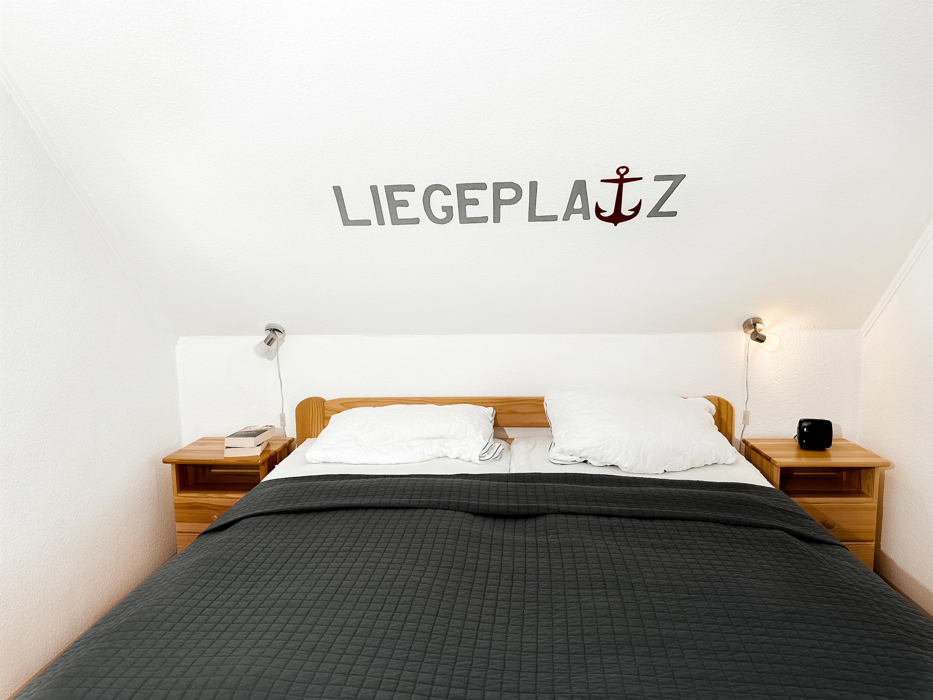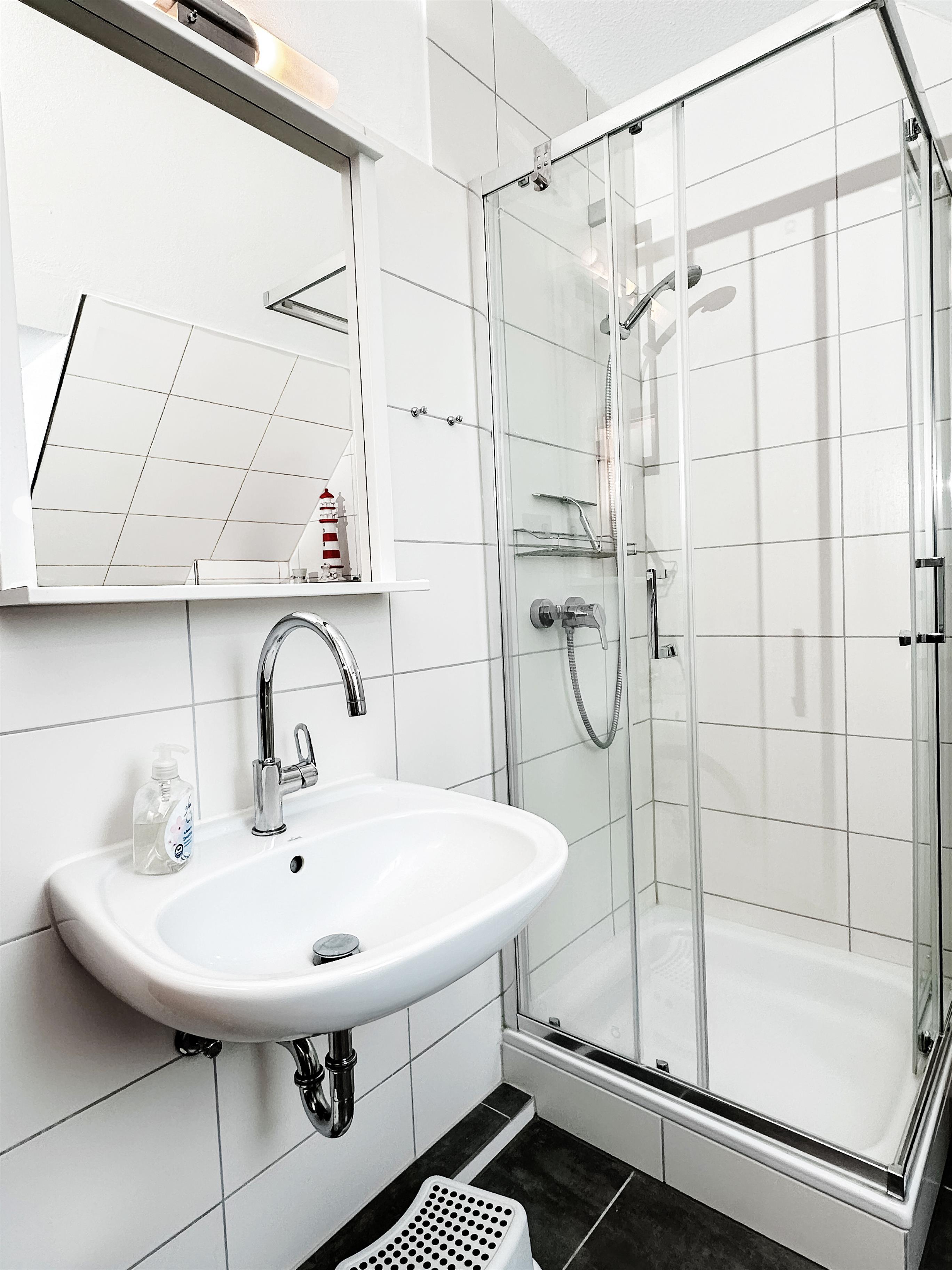 Schlafzimmer (2) mit Doppelbett (2 x 90 cm x 200 cm), Kleiderschrank und Rollladen. Ein Duschbad mit flacher Dusche, Spiegelschrank, Fenster und Waschmaschine.