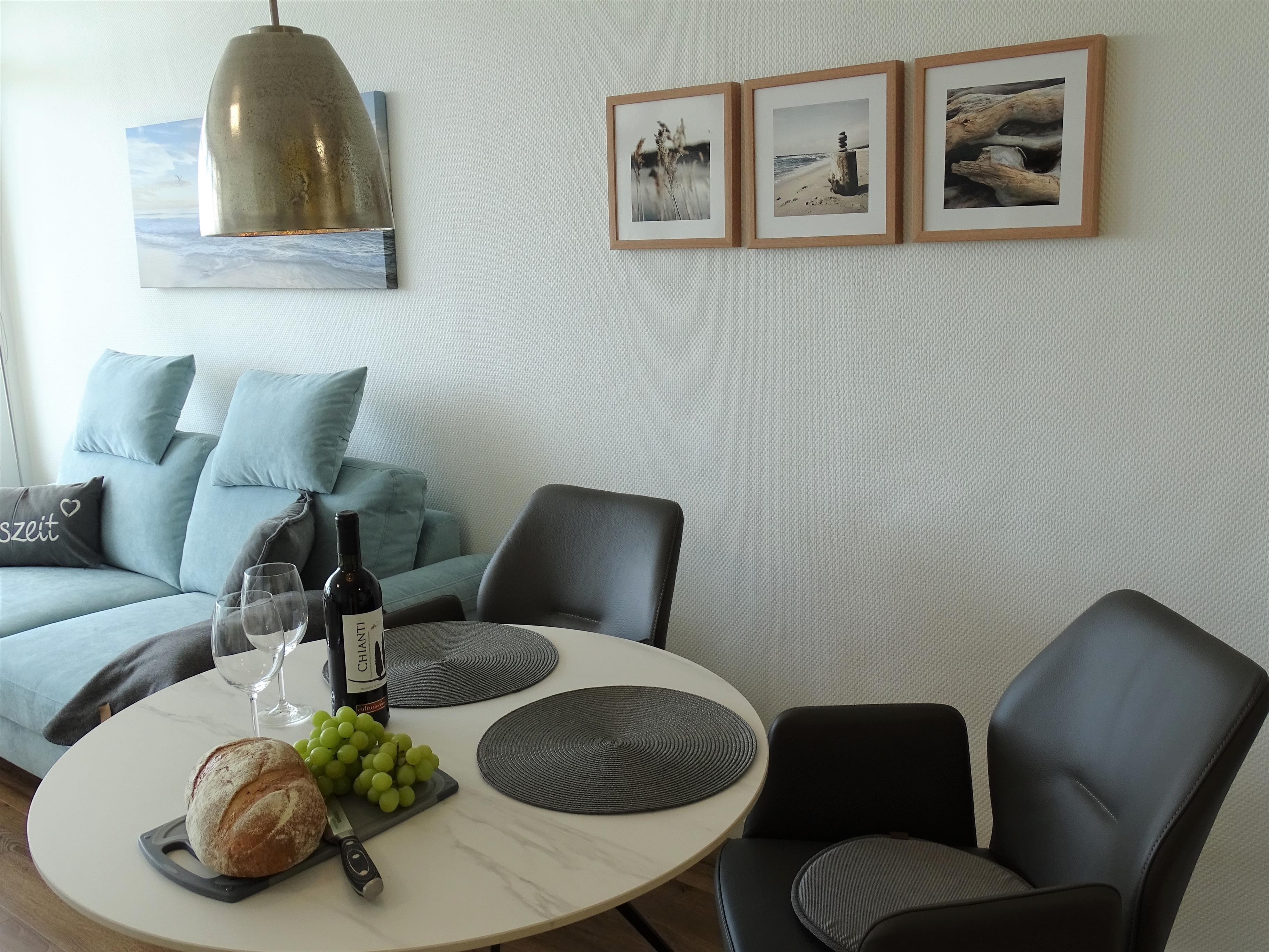 Zwischen Küche und Wohnzimmer gibt es einen Essplatz für 2 Personen. Das gemütliche Sofa mit Leselampe lädt zum Verweilen ein. Eine Vitrine mit TV (43 Zoll) und Stereo-Anlage dient als Raumteiler. Der TV ist drehbar so dass Sie bequem vom Sofa oder auch vom Bett fernsehen könnten. Das Doppelbett hat eine Größe von 1,60 x 2,00, die Matratzen-Seiten haben unterschiedliche Härtegrade. Die Einbauschränke bieten reichlich Platz für Staubsauger, Besen & Co, sowie für Ihre Kleidung. Der Balkon ist mit Tisch und Stühlen, Sonnenschirm und Schirmständer ausgestattet. Hier können Sie den Tag in der Abendsonne ausklingen lassen.