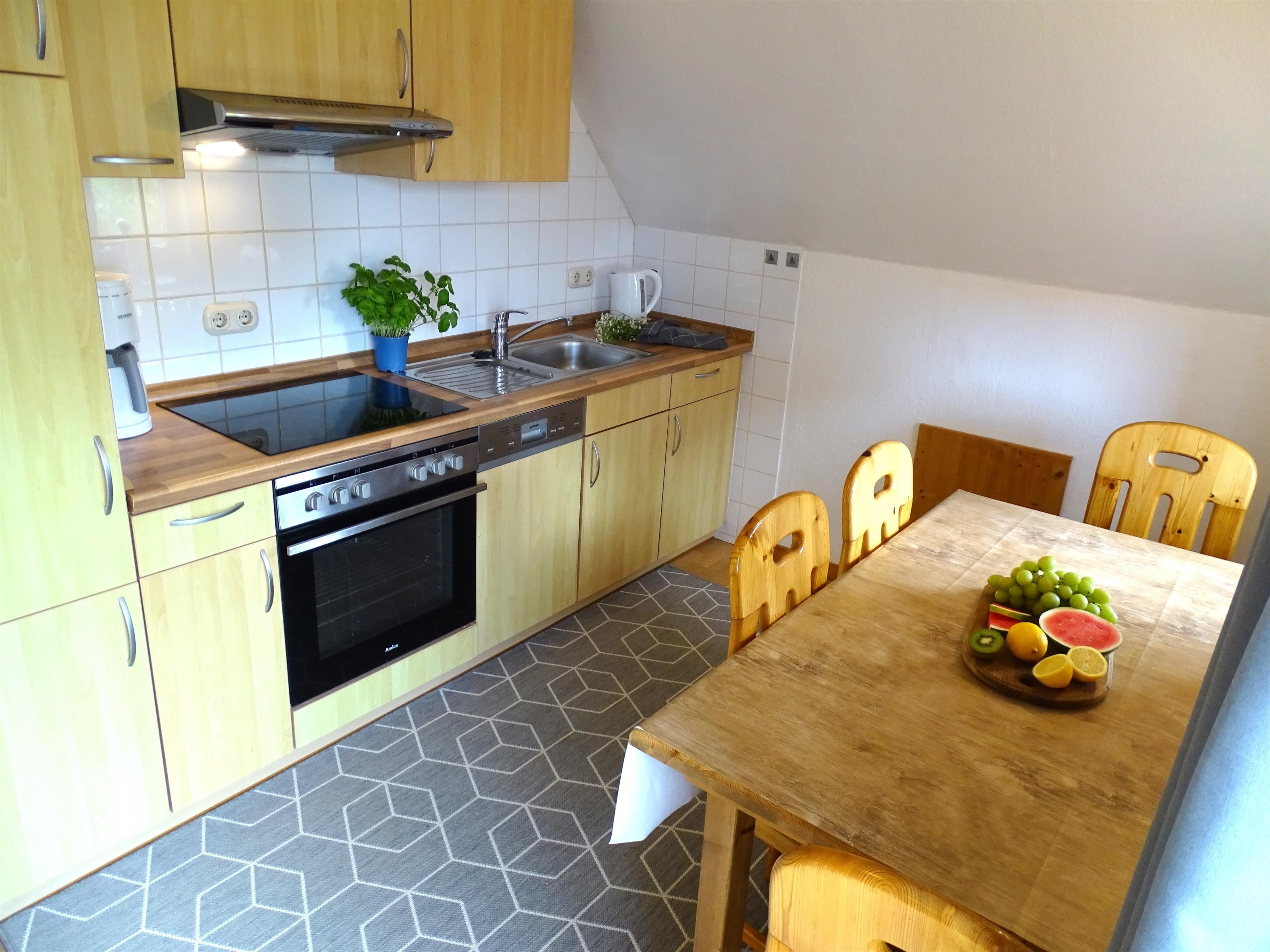 Im offenen Wohnzimmer befindet sich eine Küchenzeile mit Backofen, Herd, Geschirrspüler und Kühlschrank. Es ist ein Essplatz und eine gemütliche Sitzecke mit Fernseher und Spielecke vorhanden.
