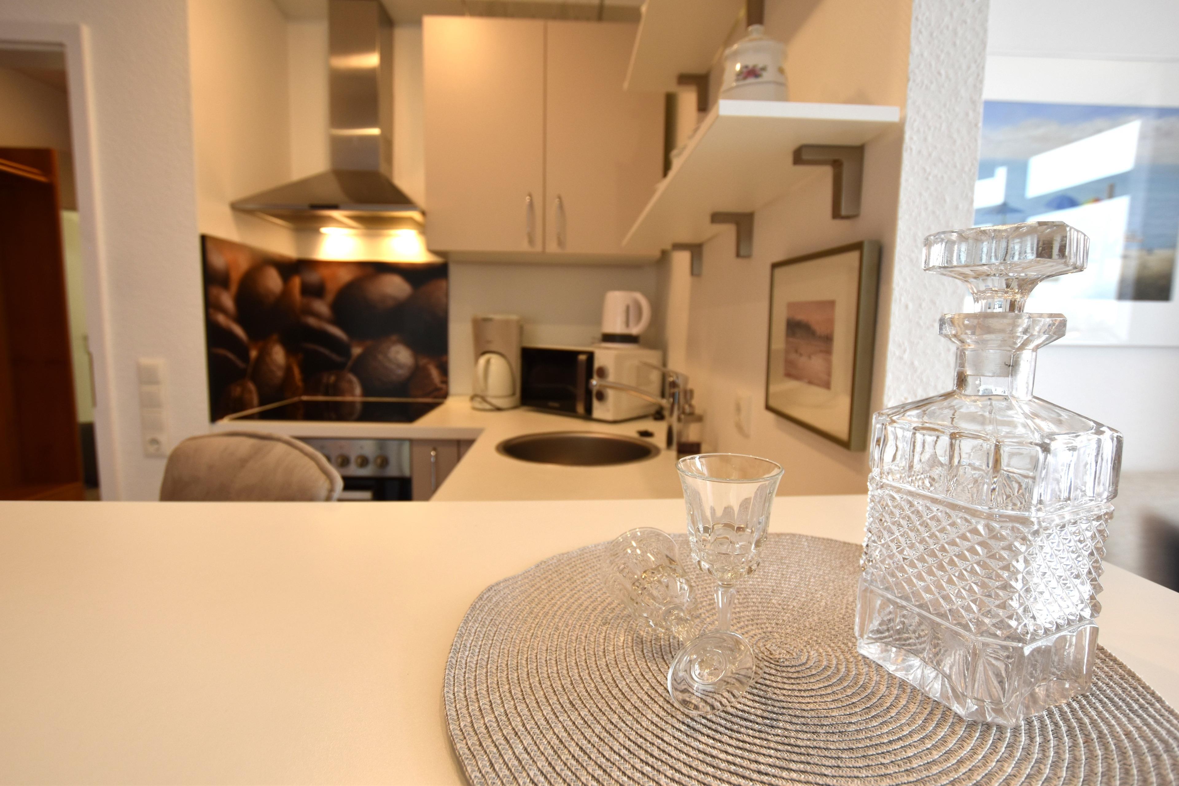Flur mit Garderobe, Schlafzimmer mit einem Doppelbett (2x90x190) & TV, ein Duschbad mit Toilette, Waschtisch und Spiegel, ein Wohn-/Esszimmer mit einem Ethanolkamin mit Brennpaste-Gel (muss mitgebracht werden), Esstisch, TV und einem Sofa, einem Schrankbett (100x200) und der direkte Zugang zum bestuhltem Balkon. Eine offene Küche mit Backofen, Wasserkocher, Kaffeemaschine uvm.