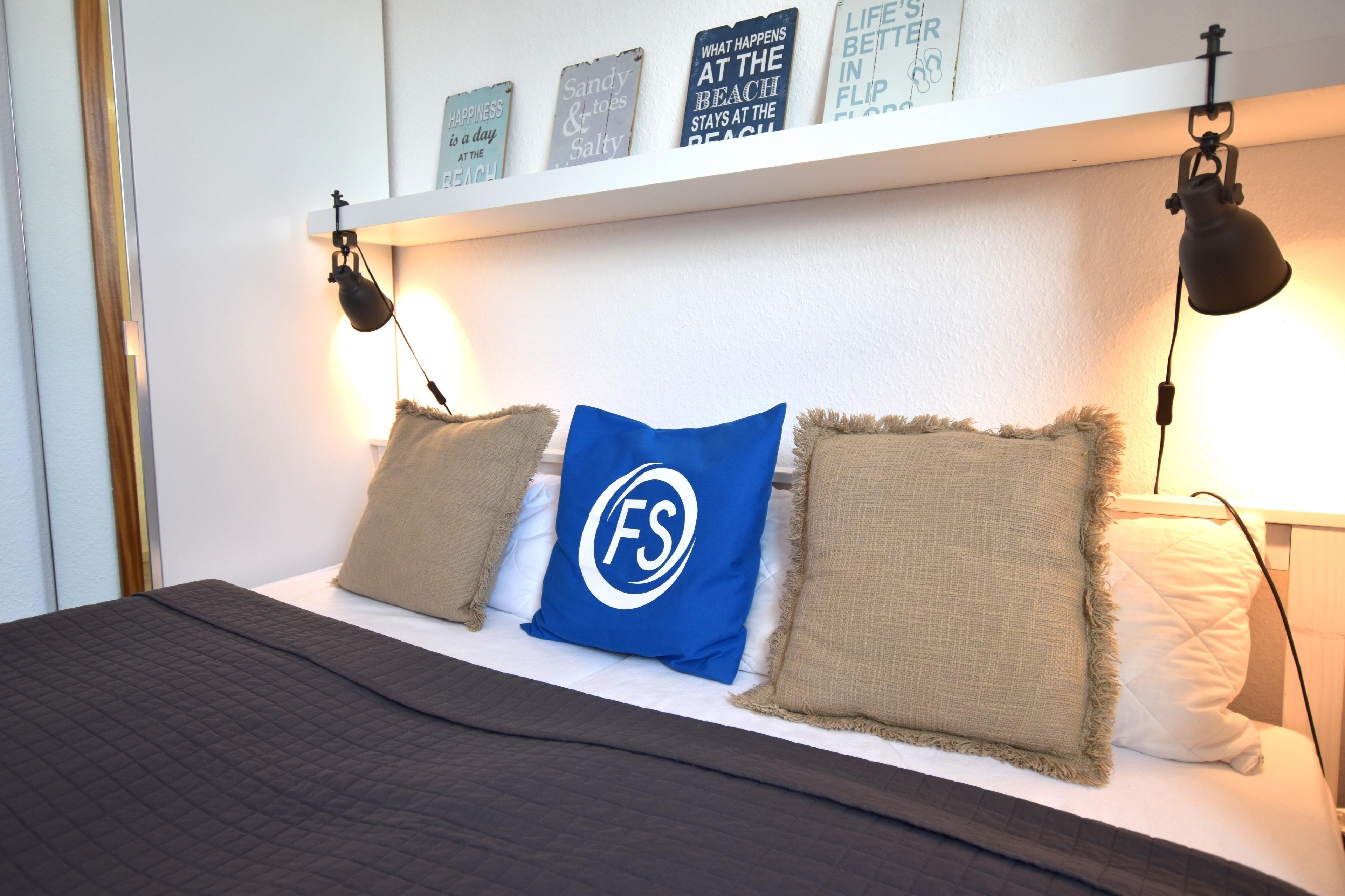 Flur mit Garderobe, Schlafzimmer mit einem Doppelbett (2x90x190), ein Duschbad mit Toilette, Waschtisch und Spiegel, ein Wohn-/Esszimmer mit einem Esstisch, TV und einem Sofa, welches sich schnell zu einem Schlafsofa (140x200) umgestalten lässt und der direkte Zugang zum bestuhltem Süd-Westbalkon. Eine offene Küche mit Backofen, Wasserkocher, Kaffeemaschine uvm.