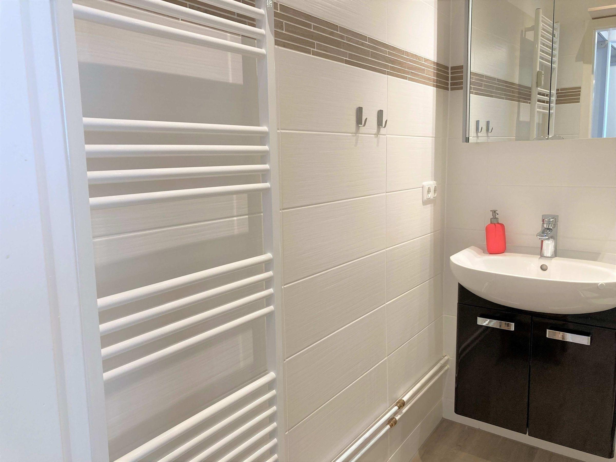 - Badezimmer ist mit Eckdusche, Handtuchheizkörper und beleuchtetem Spiegelschrank