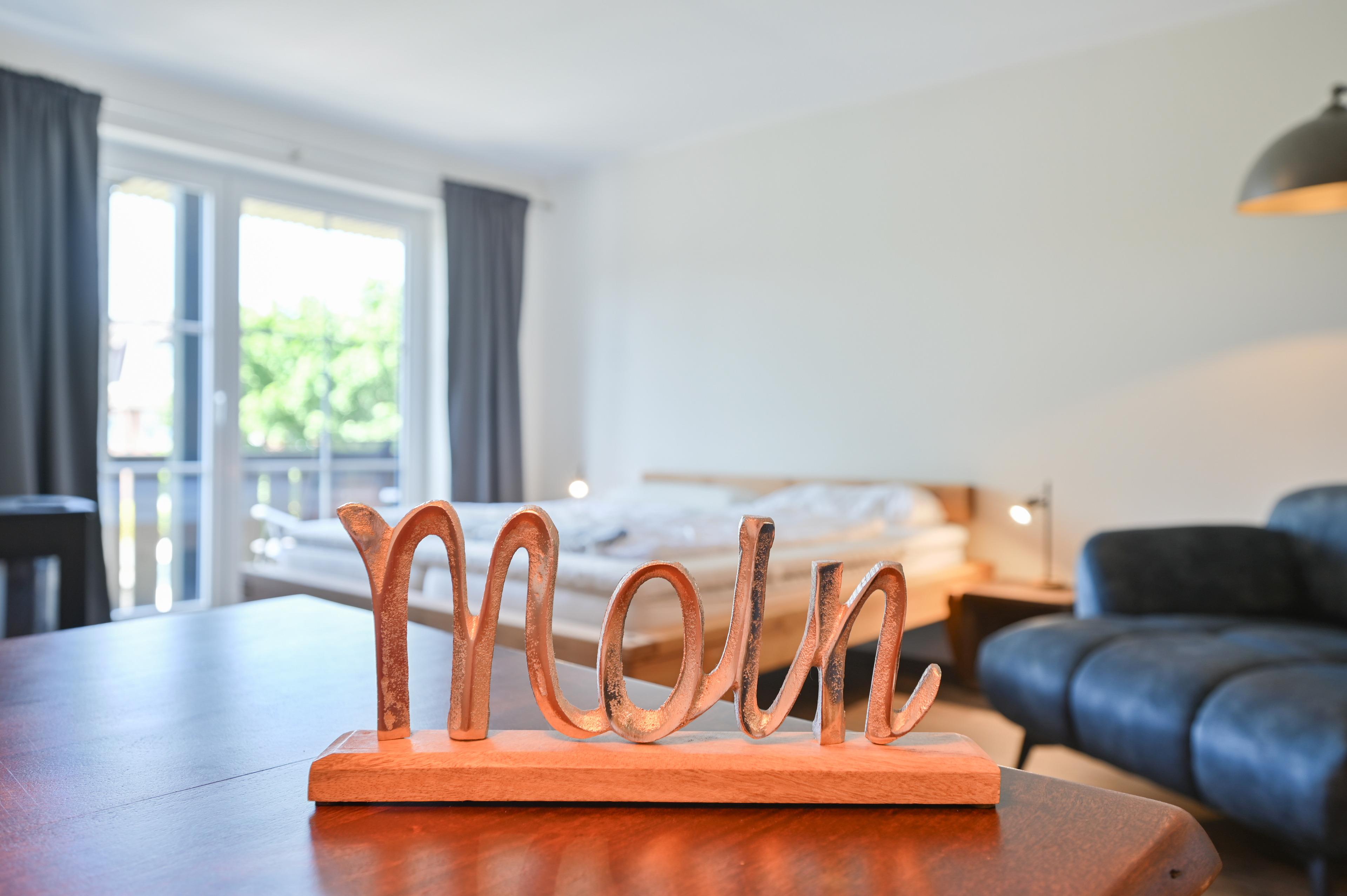 Das Wohnschlafzimmer mit Doppelbett, Nachttischen, integrierter Küchenzeile, Tisch und zwei Stühlen bietet Gästen wunderbare Möglichkeiten, es sich rundum gemütlich zu machen.