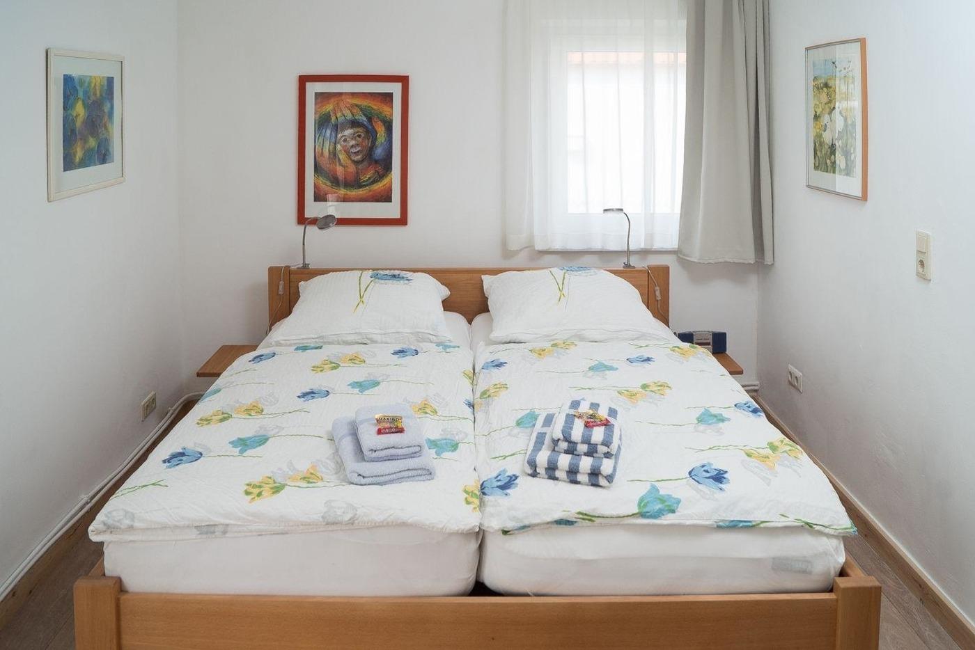 Das Haus befindet sich in ruhiger Lage und von hier sind es nur drei Minuten zur Promenade und acht Minuten zum Bäcker oder Supermarkt.