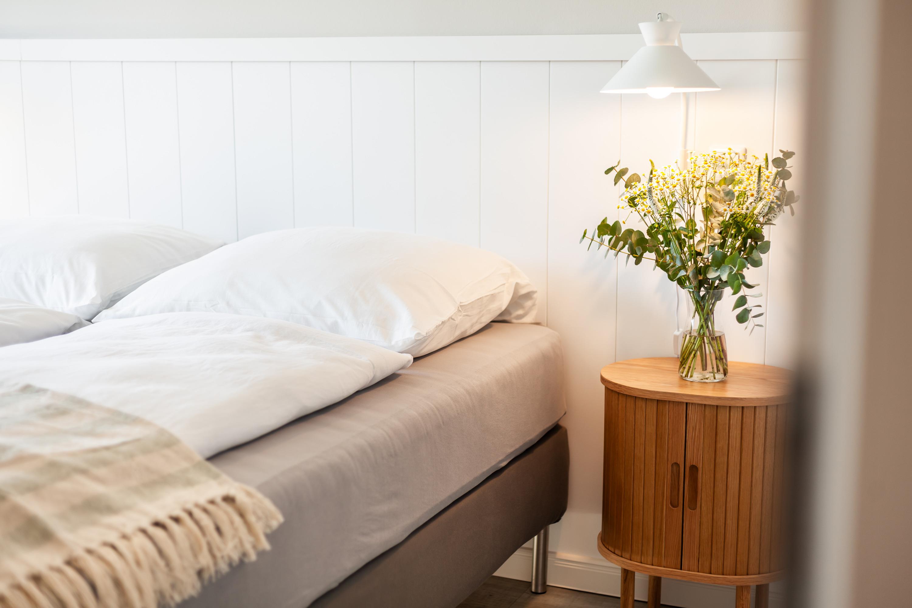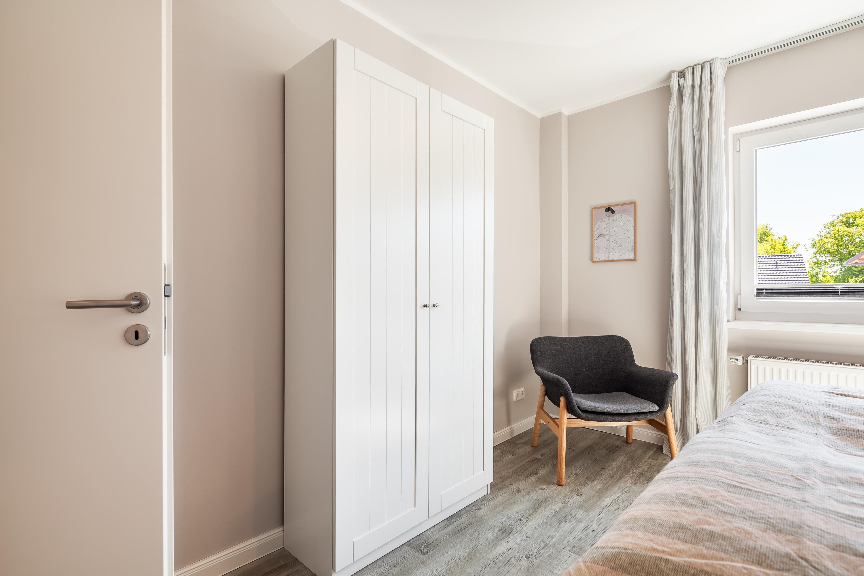 Die Ferienwohnung bietet ein komfortables Schlafzimmer mit einem gemütlichen Boxspringbett (180x200 cm) und einem geräumigen Kleiderschrank. Das Tageslichtbadezimmer verfügt über eine ebenerdige Dusche, die den Komfort Ihres Aufenthalts erhöht.