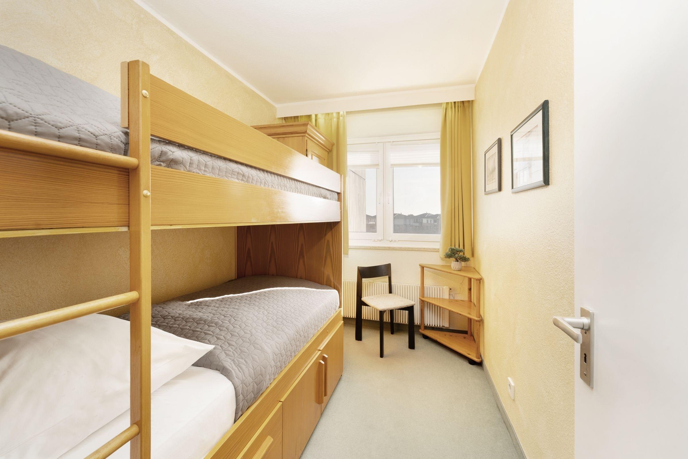 Schlafzimmer: 1 Etagenbett (je 90x200 cm), Kleiderschrank, Verdunkelung (Gardinen)