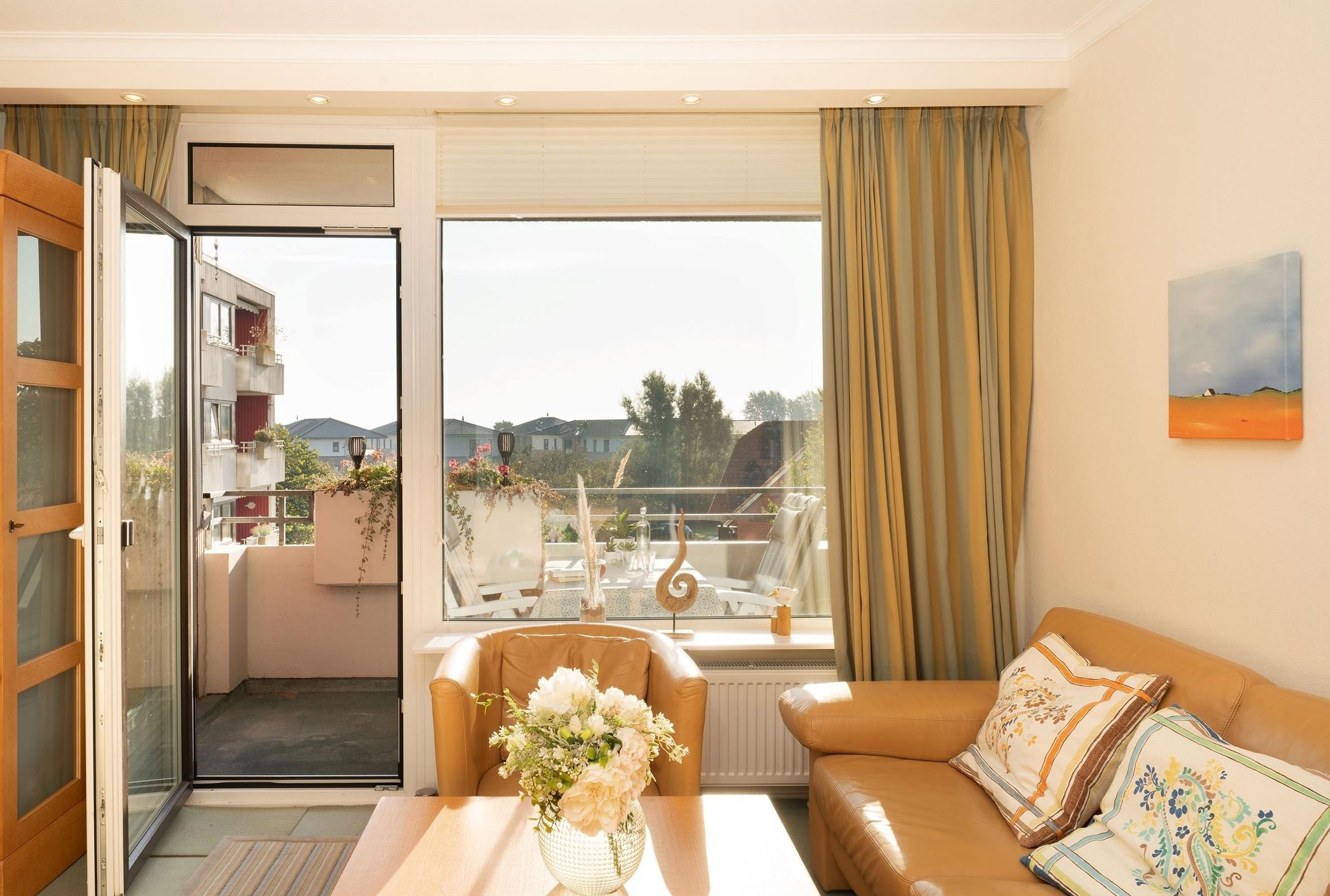 Der kombinierte Wohn- und Schlafbereich ist mit zwei komfortablen Sofas, einem Sessel, einem Flachbildfernseher und einem bequemen Doppelbett (2x 90x200 cm) ausgestattet. Das separate Schlafzimmer verfügt über ein Etagenbett (je 90x200 cm) und lässt sich mit Gardinen verdunkeln. Des Weiteren finden Sie eine gut ausgestattete Küche mit Essplatz sowie ein hochwertiges, modernes Badezimmer mit Dusche vor. Der Wohnbereich führt auf den möblierten, sonnigen Balkon und lädt zum Entspannen ein. Der WLAN-Anschluss ist inklusive.