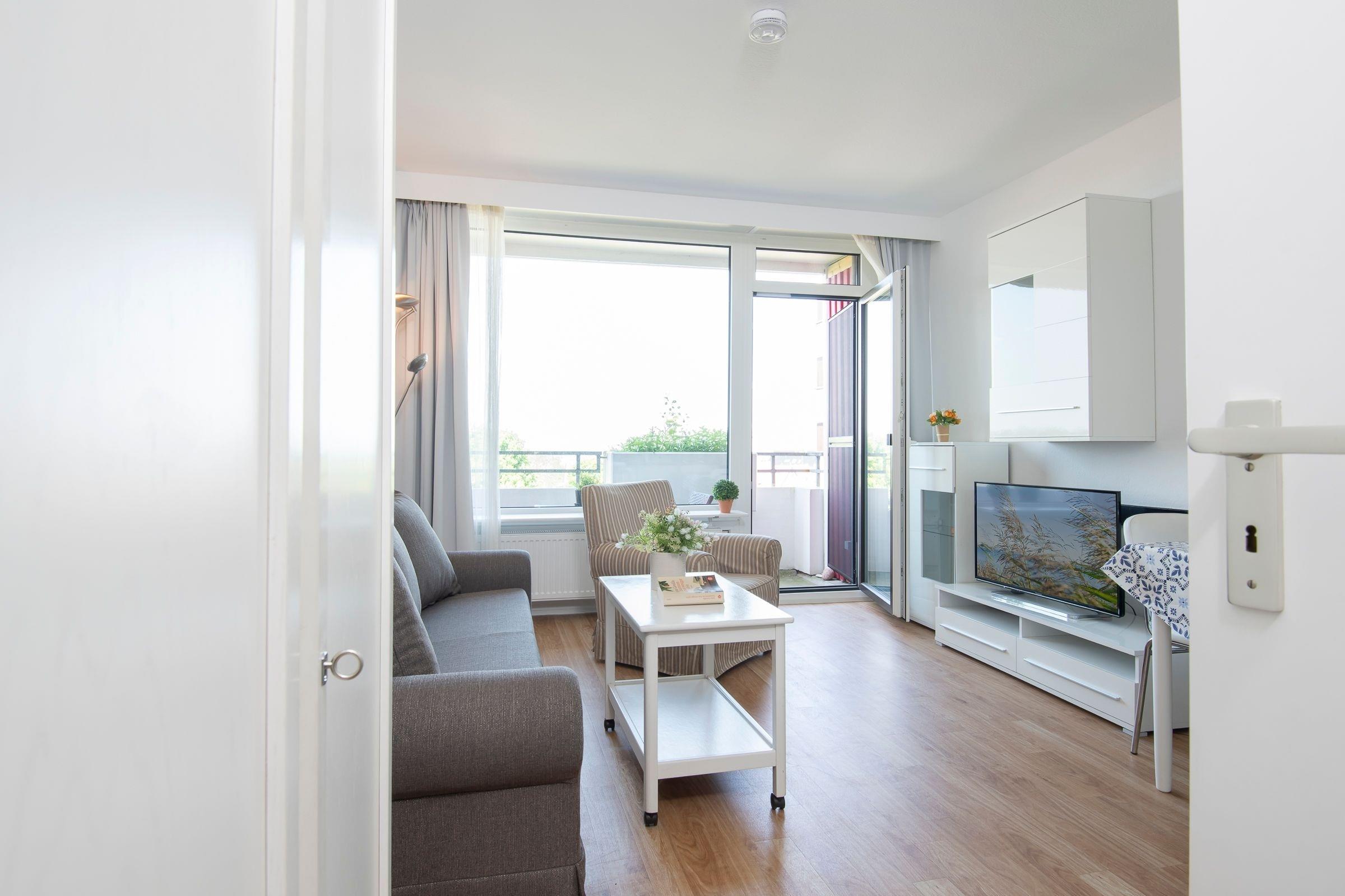 Der kombinierte Wohn- und Schlafraum ist mit einem Schlafsofa (160x200 cm), einem Sessel sowie einem SAT-TV ausgestattet. Vom Wohnbereich aus gelangen Sie auf den möblierten Balkon, der Ihnen einen fantastischen Ostsee-Fernblick bietet. Eine gut ausgestattete Pantryküche, ein Esstisch für 2 Personen, eine kleine Diele und ein innenliegendes Badezimmer mit Badewanne sind ebenfalls vorhanden. Der WLAN-Anschluss ist selbstverständlich inklusive.