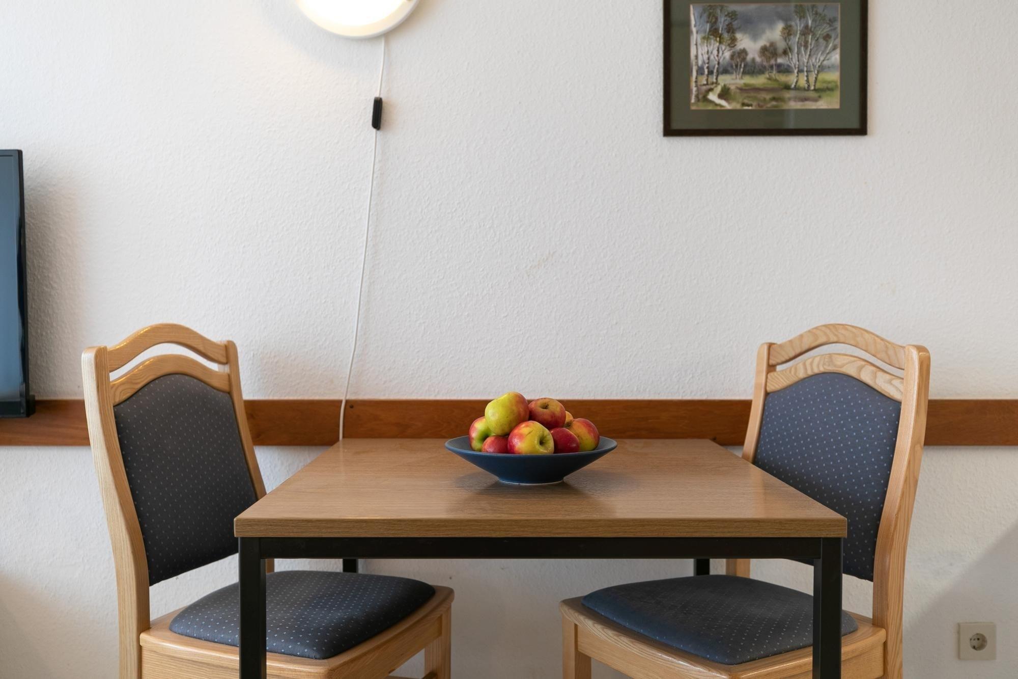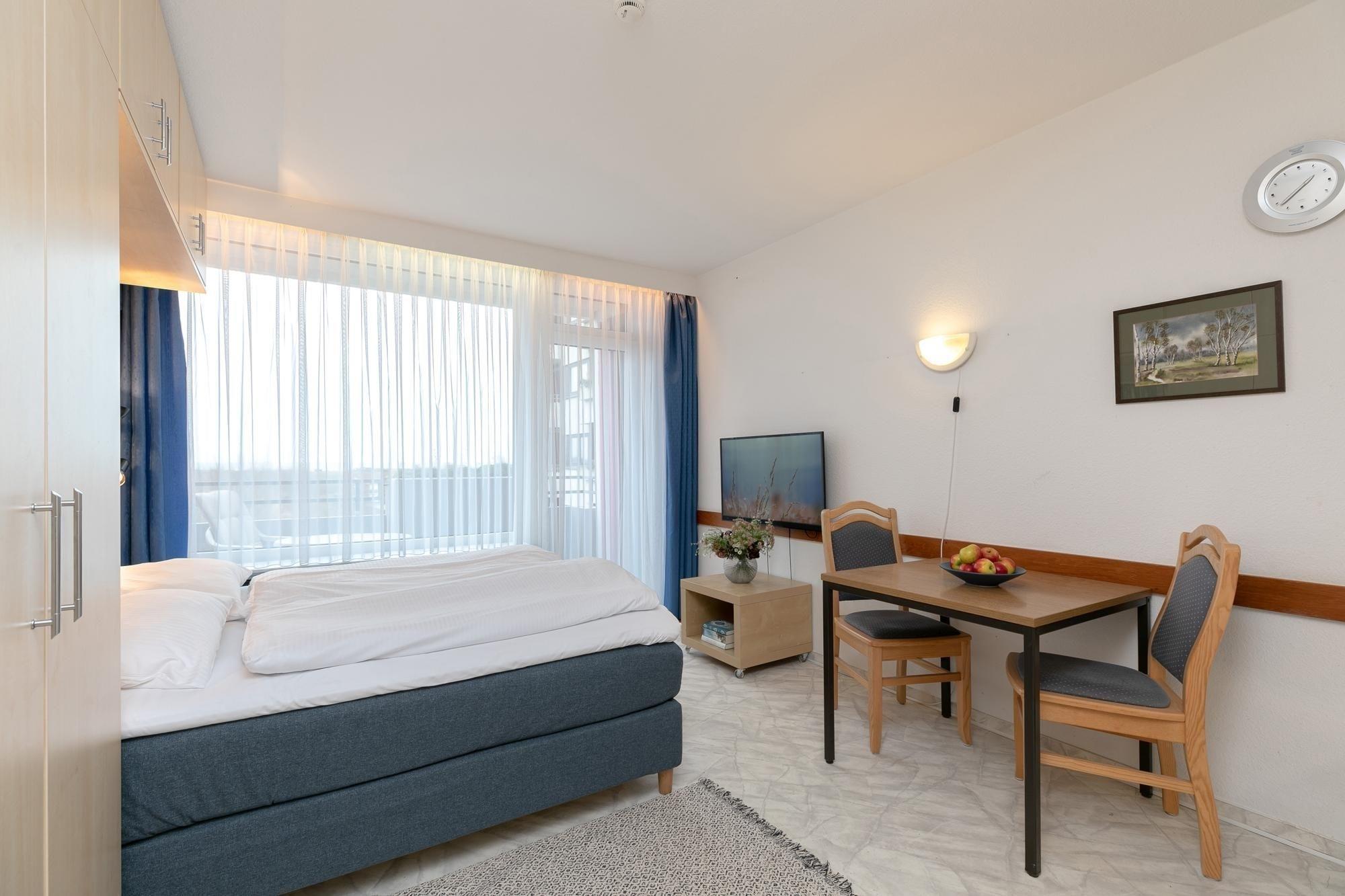 Der kombinierte Wohn- und Schlafraum verfügt über ein modernes, komfortables Boxspring-Doppelbett (160x200 cm), einen Flachbildfernseher, einen Esstisch sowie Zugang zum überdachten, möblierten Balkon. Die gut ausgestattete Pantryküche z. B. mit 2-Platten-Kochfeld, Kühlschrank und Mikrowelle ist zum Wohnbereich hin offen. Das Badezimmer ist mit einer Badewanne ausgestattet, die für Erholung nach einem langen Tag am Strand sorgt. Der WLAN-Anschluss ist für Sie selbstverständlich inklusive.