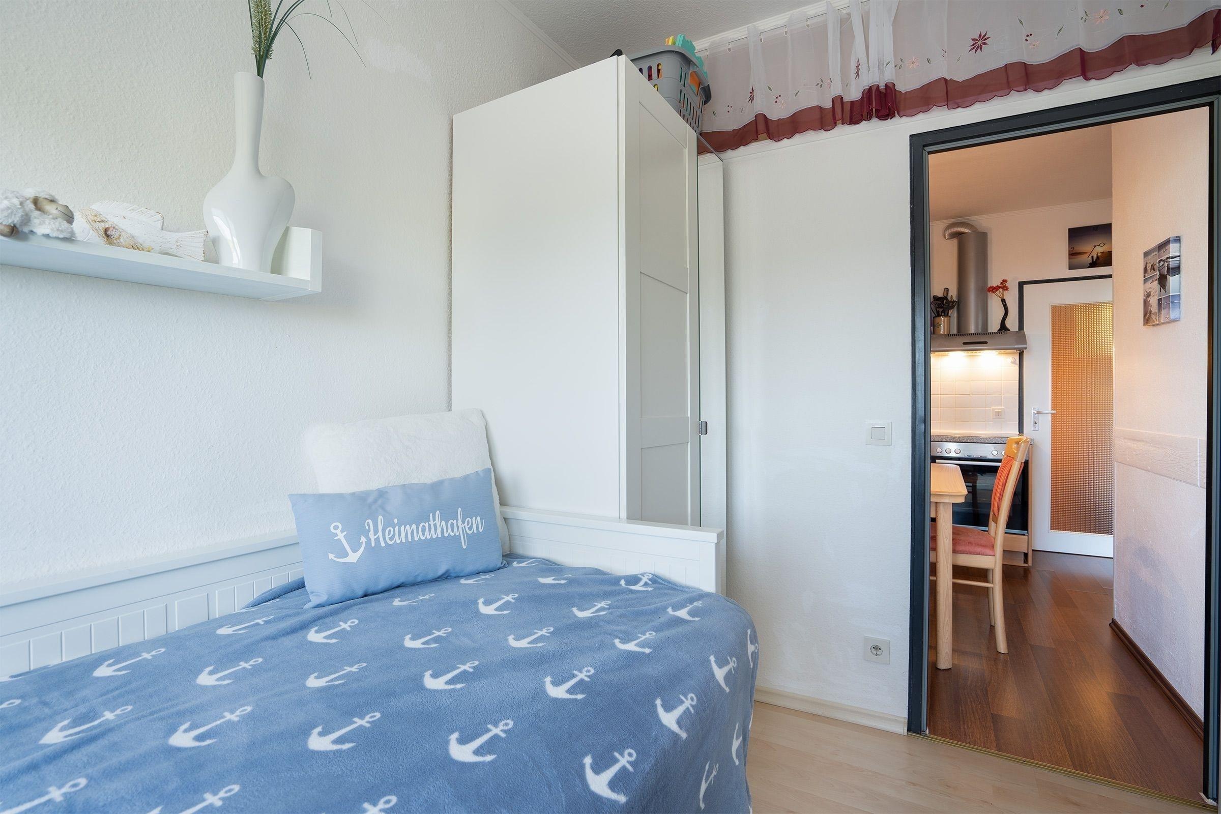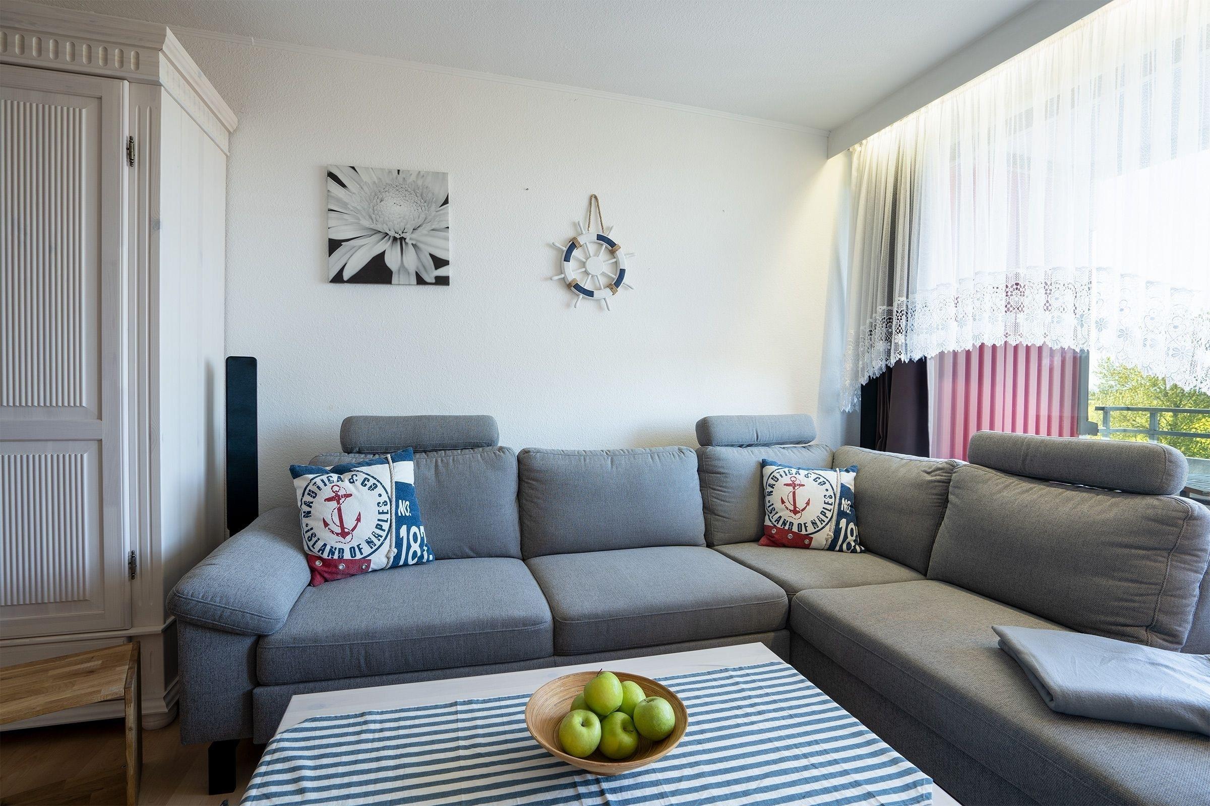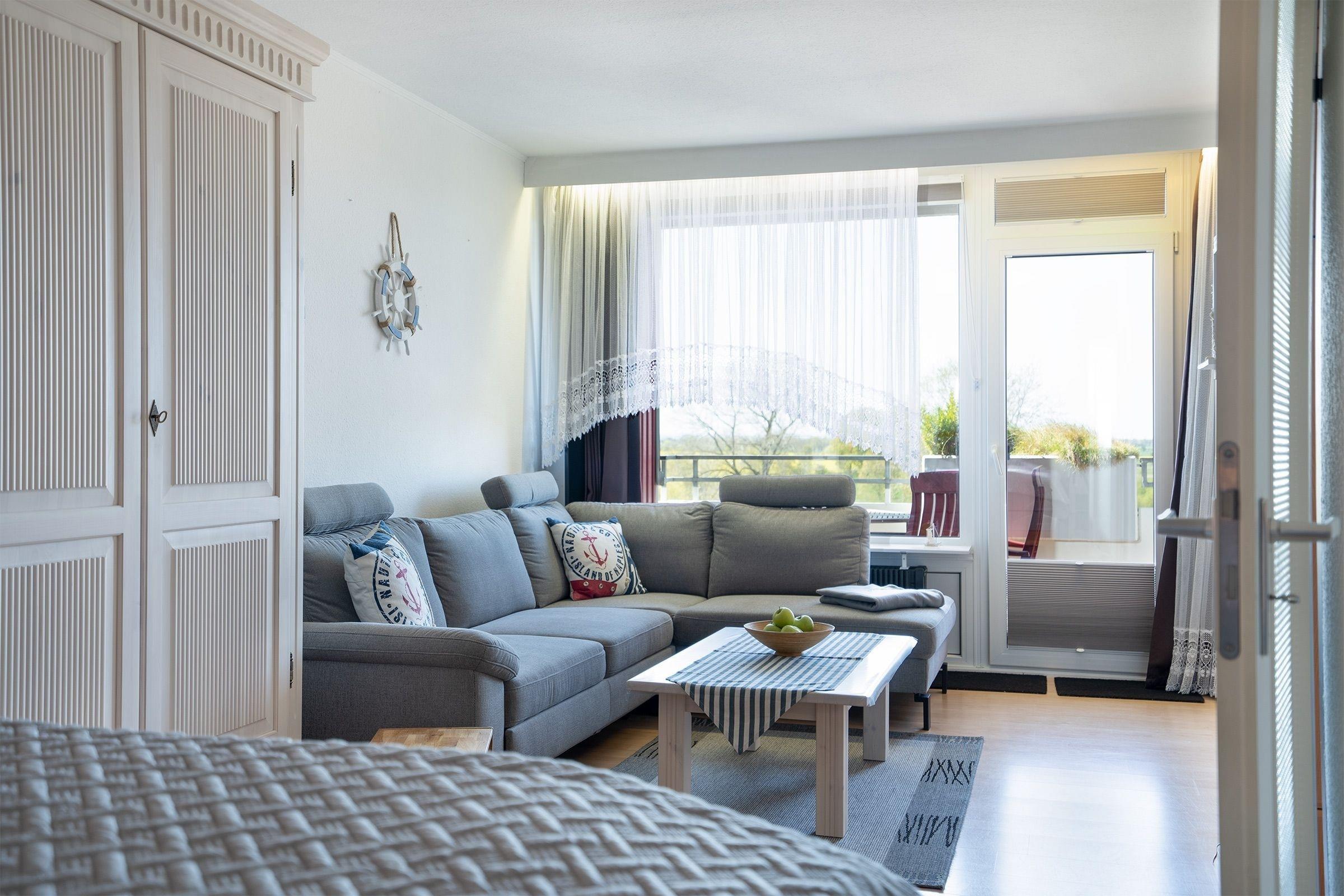 Der maritim gestaltete Wohn- und Schlafraum ist gemütlich eingerichtet und lädt mit komfortablem Ecksofa zum Entspannen ein. Auf dem möblierten Balkon mit Nord-Ost-Ausrichtung genießen Sie an lauschigen Abenden ein gutes Glas Wein mit schönem Weitblick. Das große Doppelbett (ca. 180x200 cm) beschert Ihnen angenehme Nächte nach einem langen Strandtag. Bis zu 2 weitere Gäste finden im separaten Schlafzimmer Platz. Hier wartet ein kuscheliges Kojenbett (ca. 90x200 cm) auf Sie. In der gut ausgestatteten Küche mit bequemer Sitzecke können Sie sich problemlos selbst versorgen. Eine Diele sowie ein innenliegendes Badezimmer mit Badewanne runden die Ausstattung dieser Ferienwohnung ab. Der WLAN-Anschluss ist inklusive.