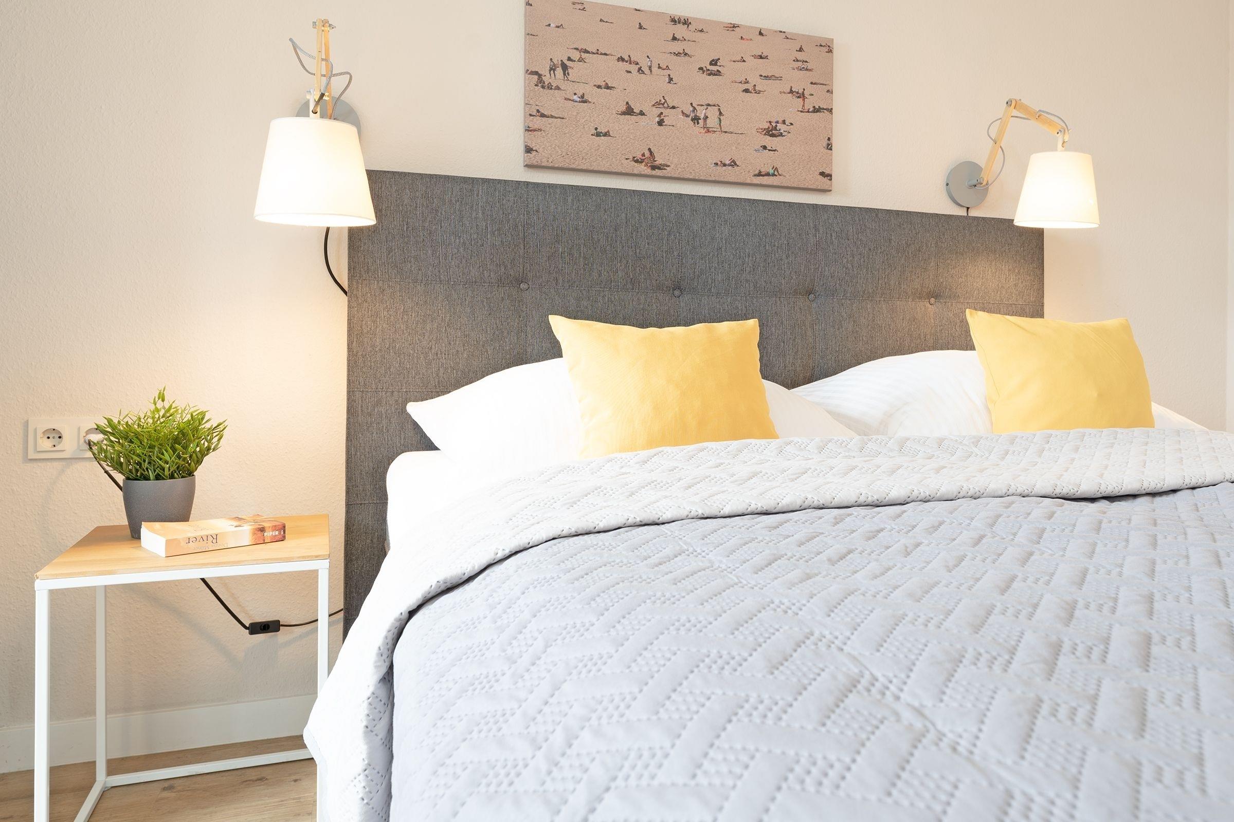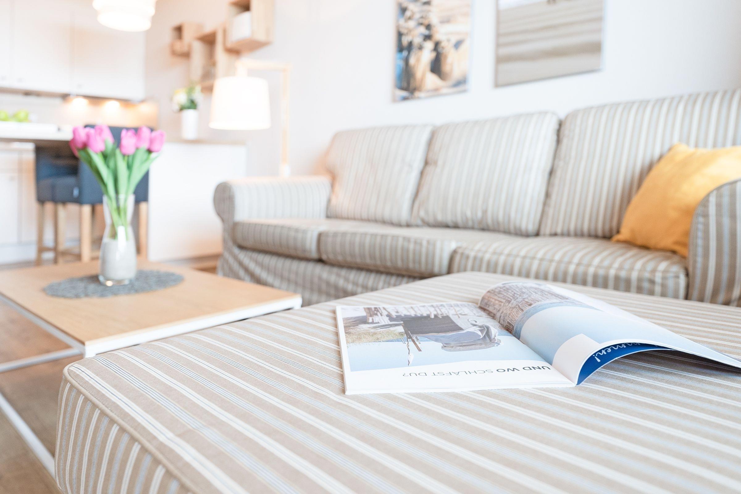 Der Wohn- und Schlafbereich ist gut durchdacht und überzeugt durch eine helle und moderne Einrichtung. Durch die großen Fenster ist dieser Bereich stets hell und lichtdurchflutet. Von langen Tagen am Strand können Sie sich auf dem bequemen Sofa vor dem Flachbildfernseher erholen. Für die Nächte erwartet Sie ein komfortables Boxspring-Doppelbett (160x200 cm). Die moderne Küche ist zwar klein, aber z. B. mit einem Kühlschrank, einem Backofen und einem Geschirrspüler bestens ausgestattet. Eine Küchenbar, welche gleichzeitig als Esstisch dient, trennt die Küche vom Wohnbereich. Im innenliegenden Badezimmer können Sie sich in der Badewanne entspannen.
