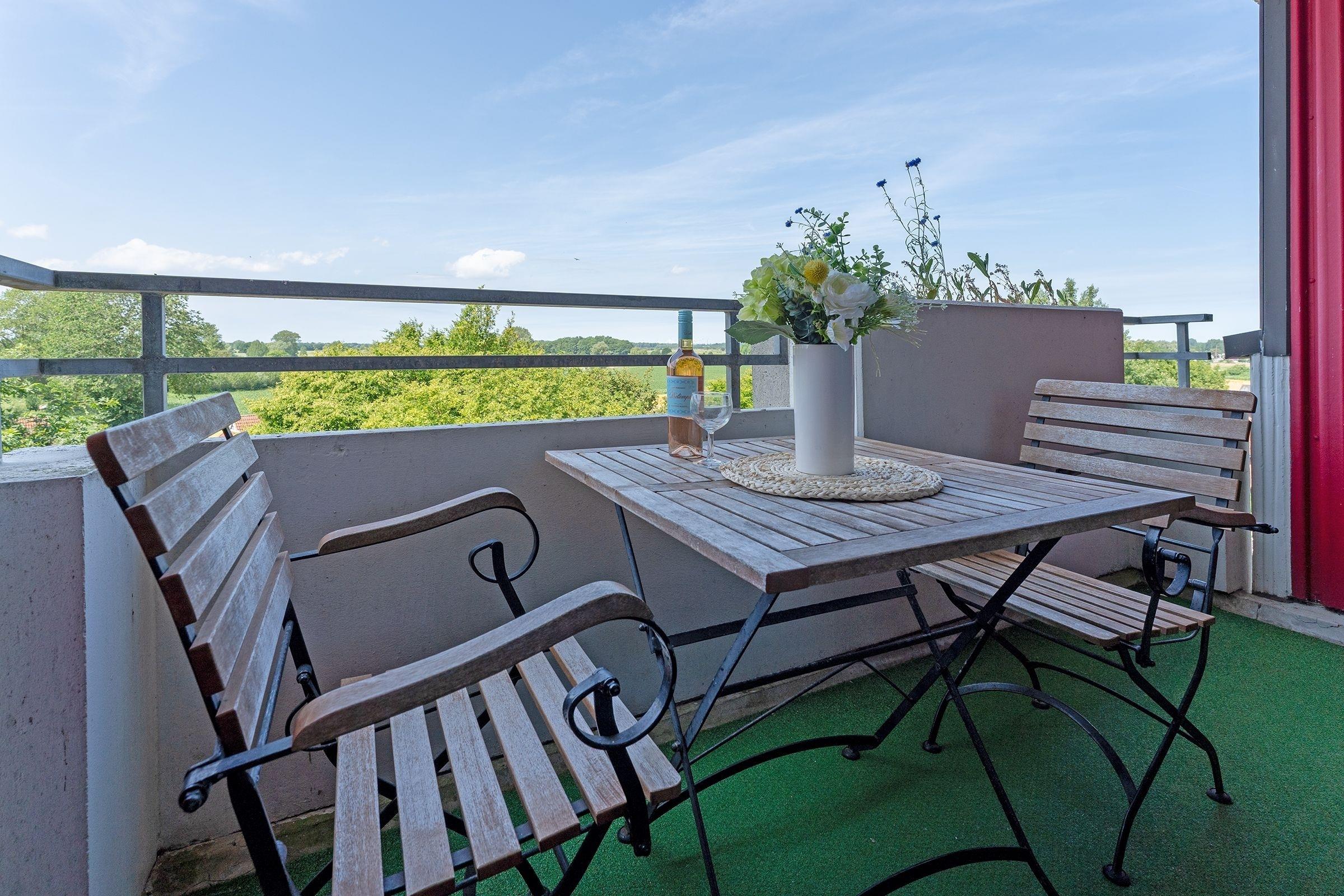 Moderne Ferienwohnung mit Balkon und Meerblick in Dahme, ideal für entspannte Strandtage.