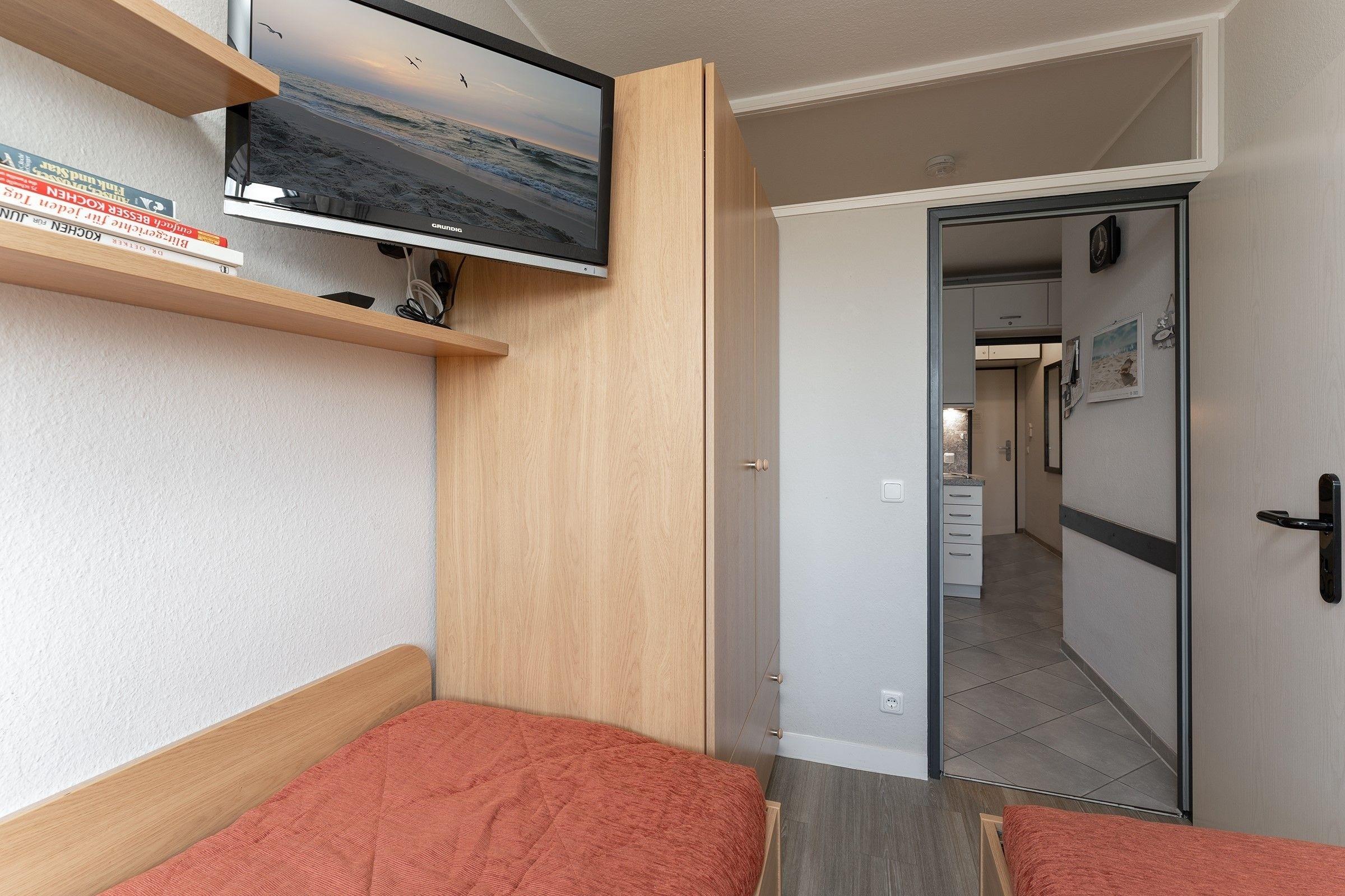 Schlafzimmer: 2 Einzelbetten (je 85x200cm), TV, Kleiderschrank, Jalousie
