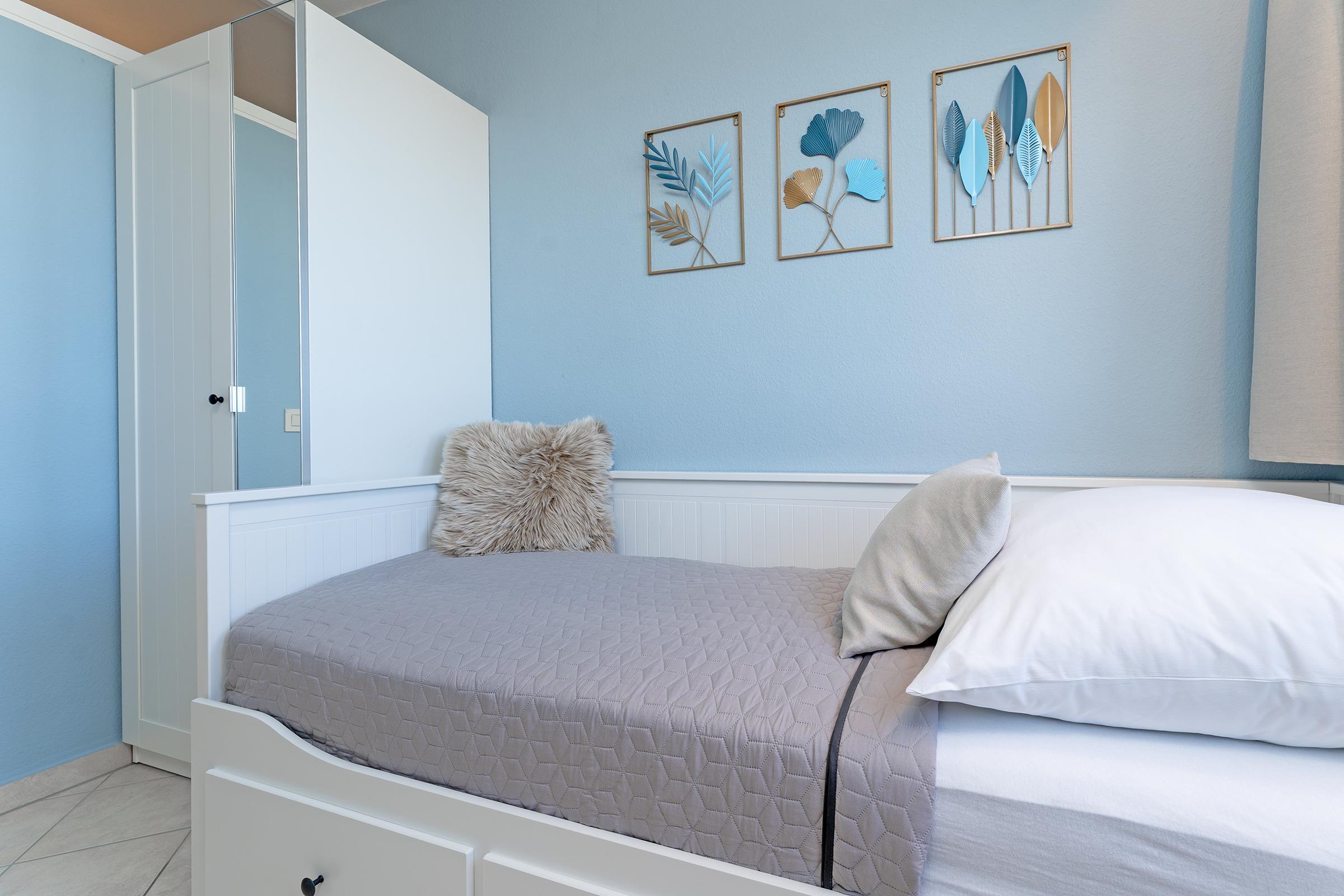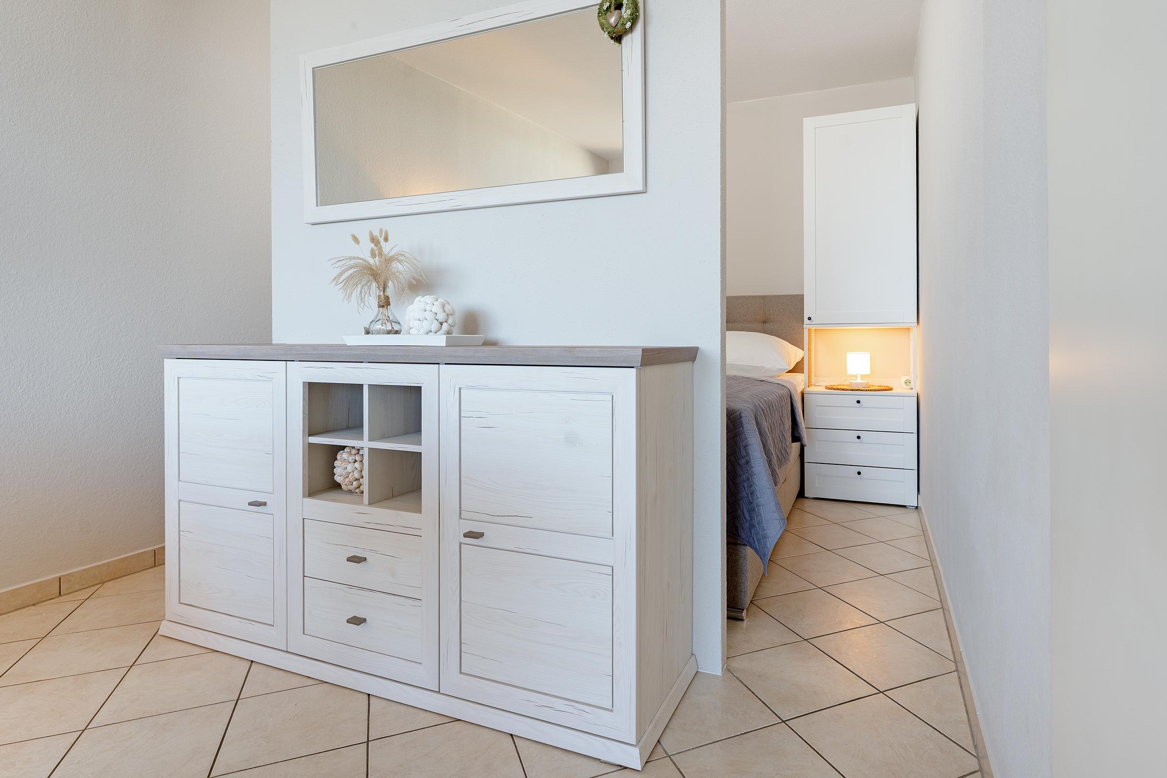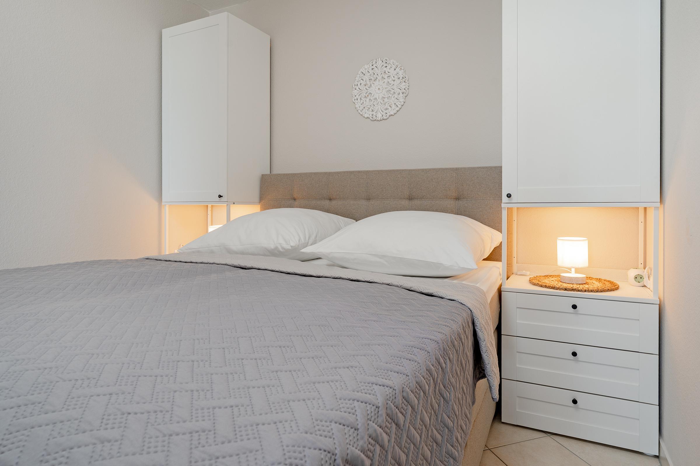 Hier erwarten Sie ein kombinierter Wohn- und Schlafraum, ein separates Schlafzimmer, eine gut ausgestattete Küche, Diele sowie ein modernes Duschbad. Im kombinierten Wohn- und Schlafbereich sorgt ein Boxspringbett (2x 80x200 cm) für einen erholsamen Schlaf - ein moderner TV mit Ambilight verspricht gute Unterhaltung. Der Wohn- und Schlafbereich kann durch Vorhänge abgedunkelt werden. Das separate Schlafzimmer verfügt über Verdunklungsrollos und Vorhänge sowie ein ausziehbares Kojenbett (je 80x200 cm). Für Sie stehen außerdem Informationen zur Umgebung (u.a. Ausflugtipps) zur Verfügung.