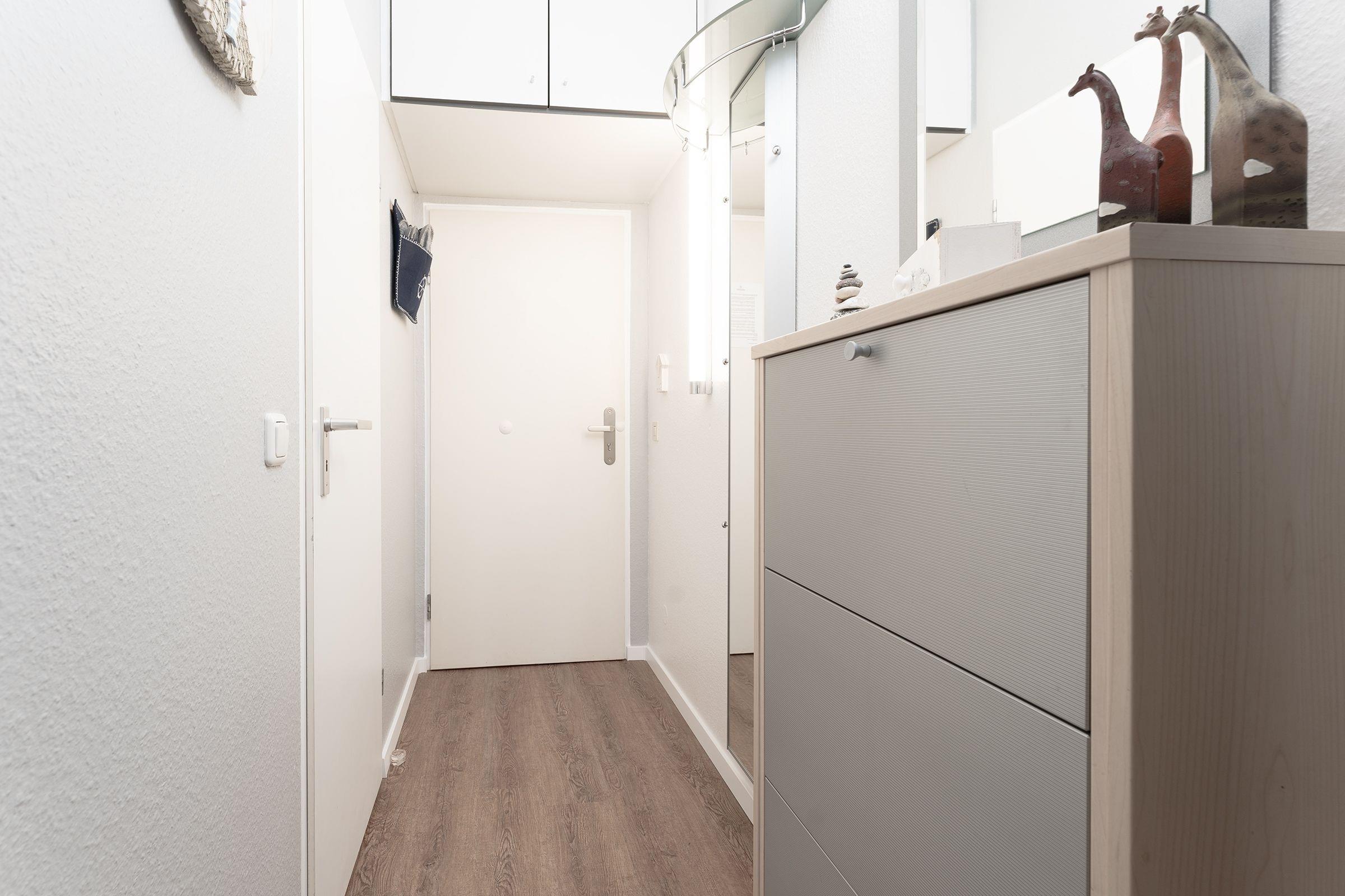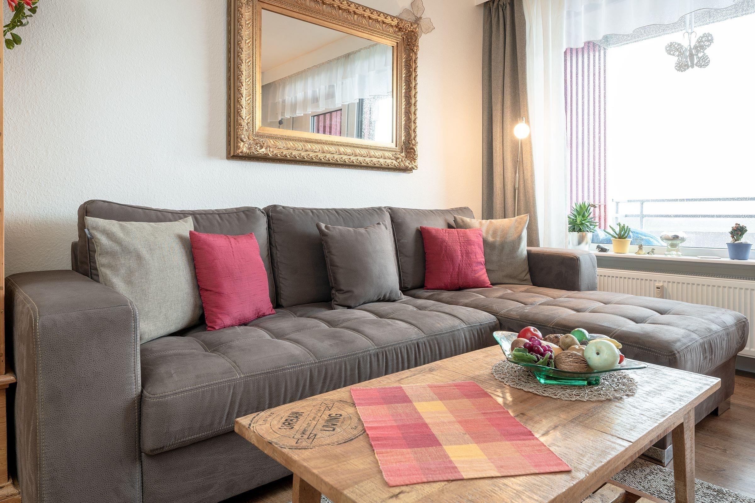 Ihr 46 m² großes Urlaubsdomizil ist angenehm und geschmackvoll eingerichtet und für max. 4 Personen geeignet. Die Wohnung verfügt über einen kombinierten Wohn- und Schlafraum, einen kostenlosen WLAN-Anschluss sowie eine komplett ausgestattete Küche und ein Bad. Den Blick haben Sie zur Landseite, den Balkon zum Westen mit Nachmittags- und Abendsonne.