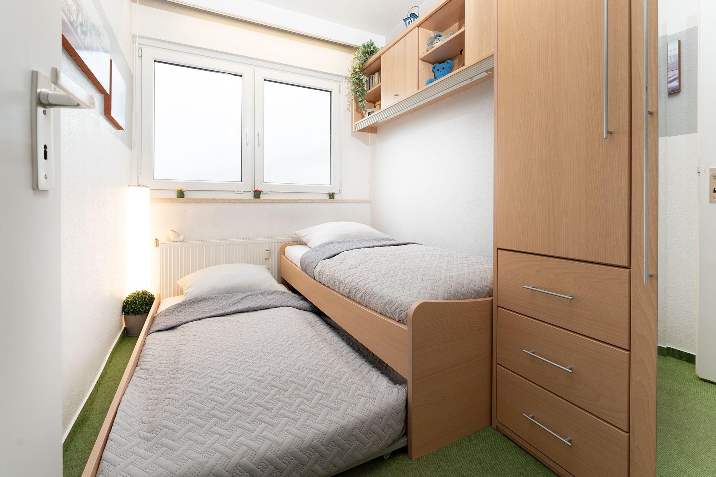 Schlafzimmer: 1 Schlafsofa (2x 90x200 cm), Kleiderschrank, Verdunkelungsmöglichkeit (Rollo)