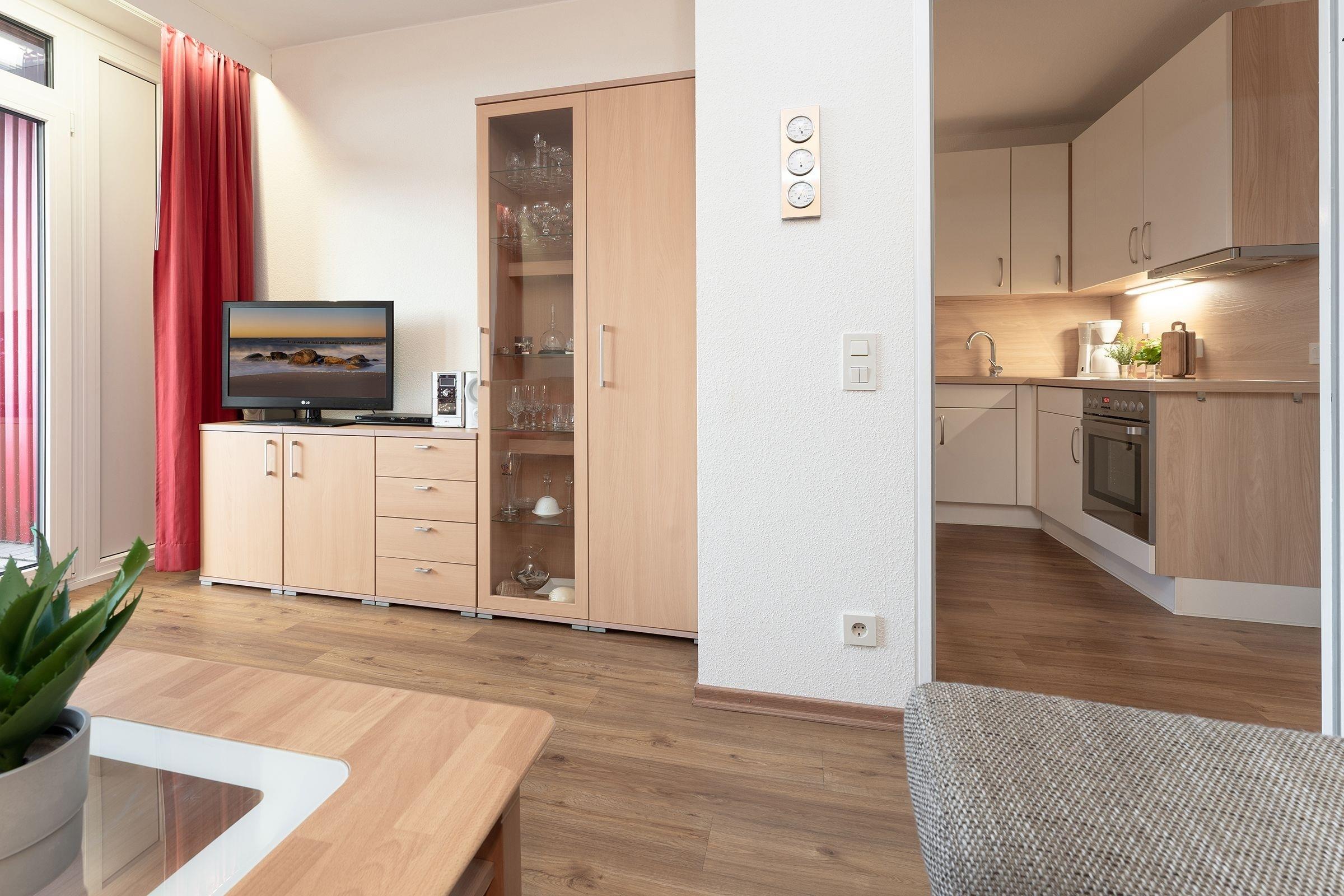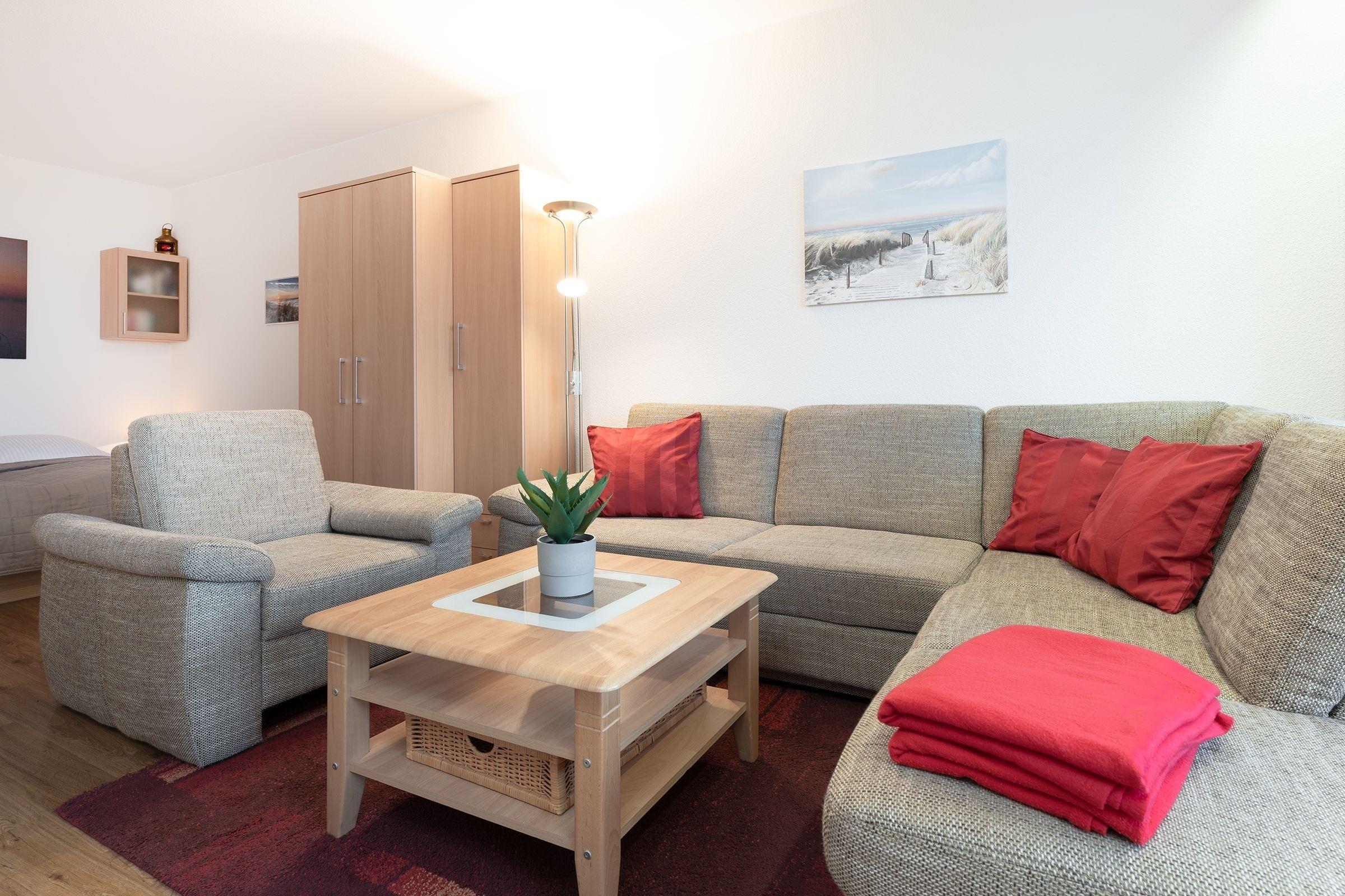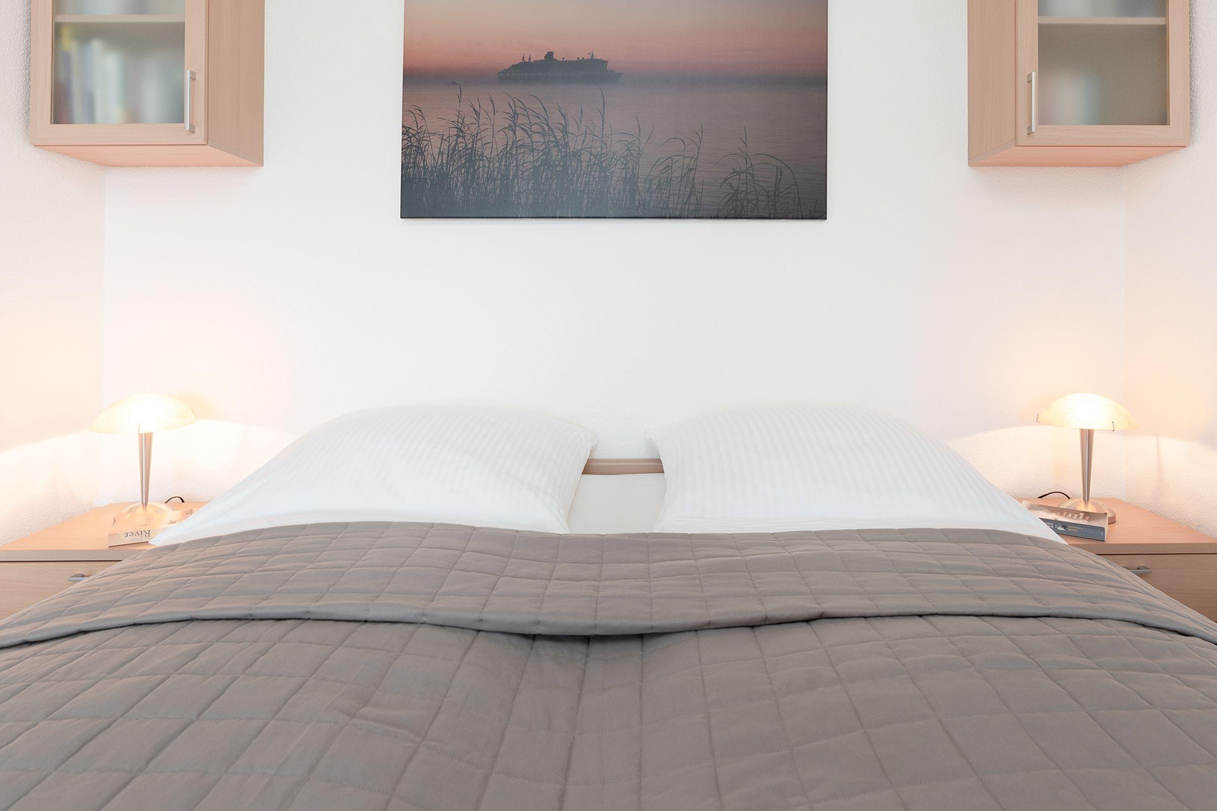 In dieser hell und gemütlich eingerichteten 2-Zimmer-Ferienwohnung erwartet Sie auf ca. 46 m² ein kombinierter Wohn- und Schlafraum mit Doppelbett (2x 90x200 cm), eine voll ausgestattete Küche, eine Diele sowie ein Badezimmer mit Dusche. Im separaten Schlafzimmer mit Schlafcouch (160x200 cm) finden zwei weitere Übernachtungsgäste Platz.