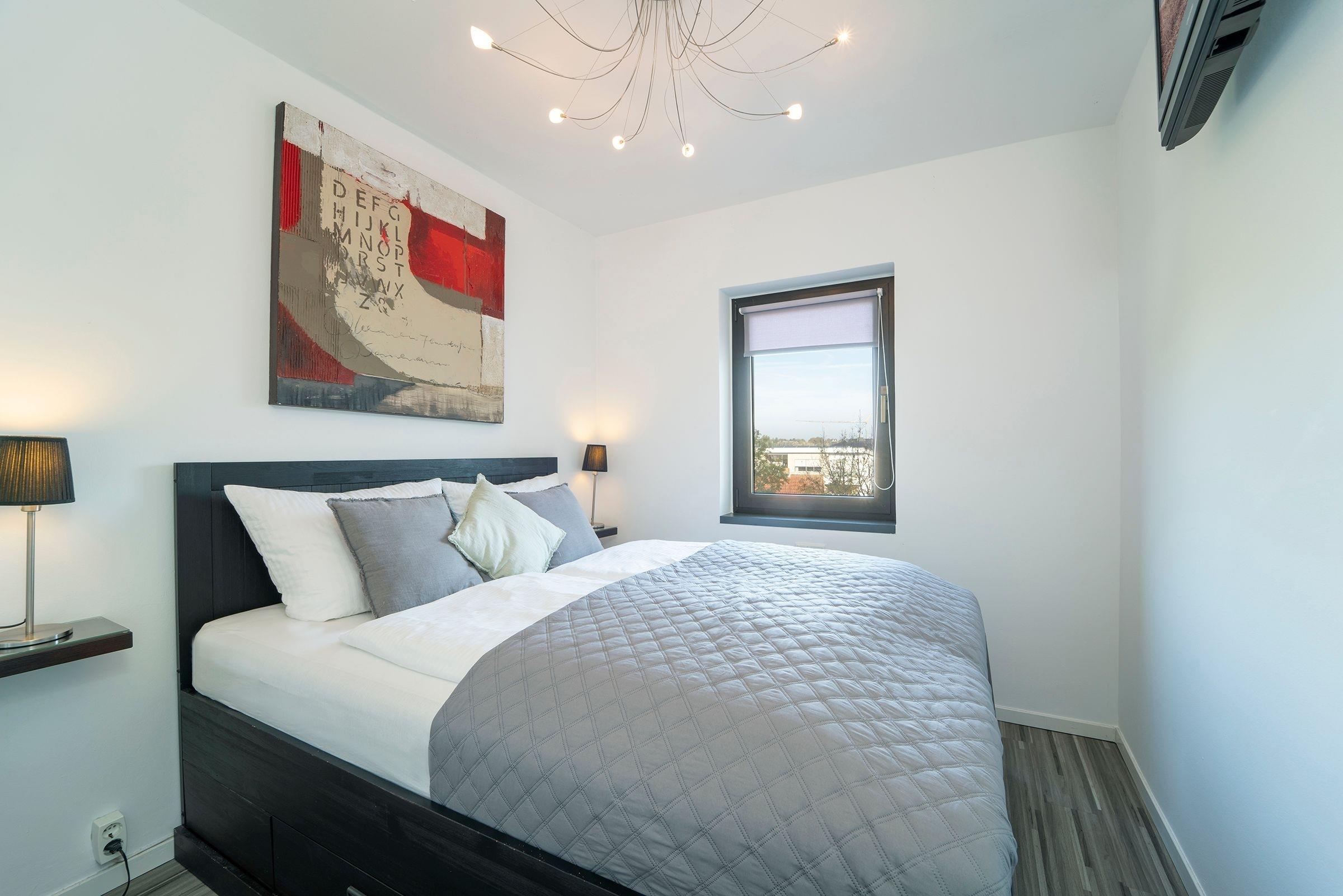 Schlafzimmer: 1 Boxspringbett (2x 80x200 cm), TV, Kleiderschrank, Verdunkelung (Rollo)