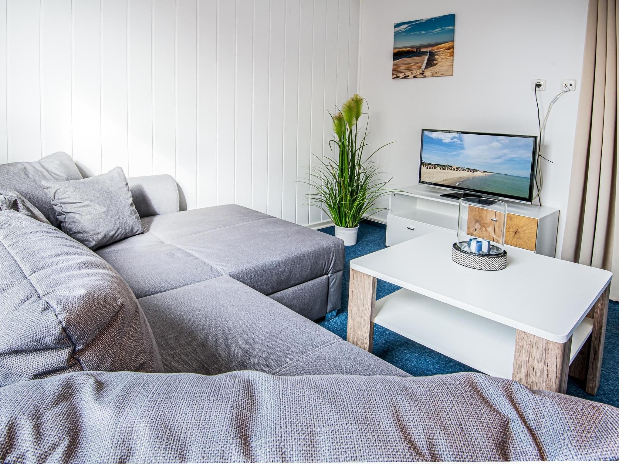 Wohnzimmer: 1 Schlafsofa (160x200 cm), TV, Verdunkelungsmöglichkeit
