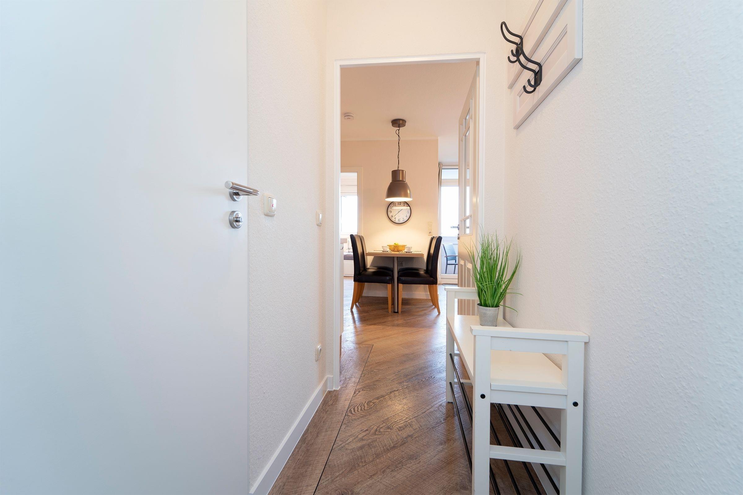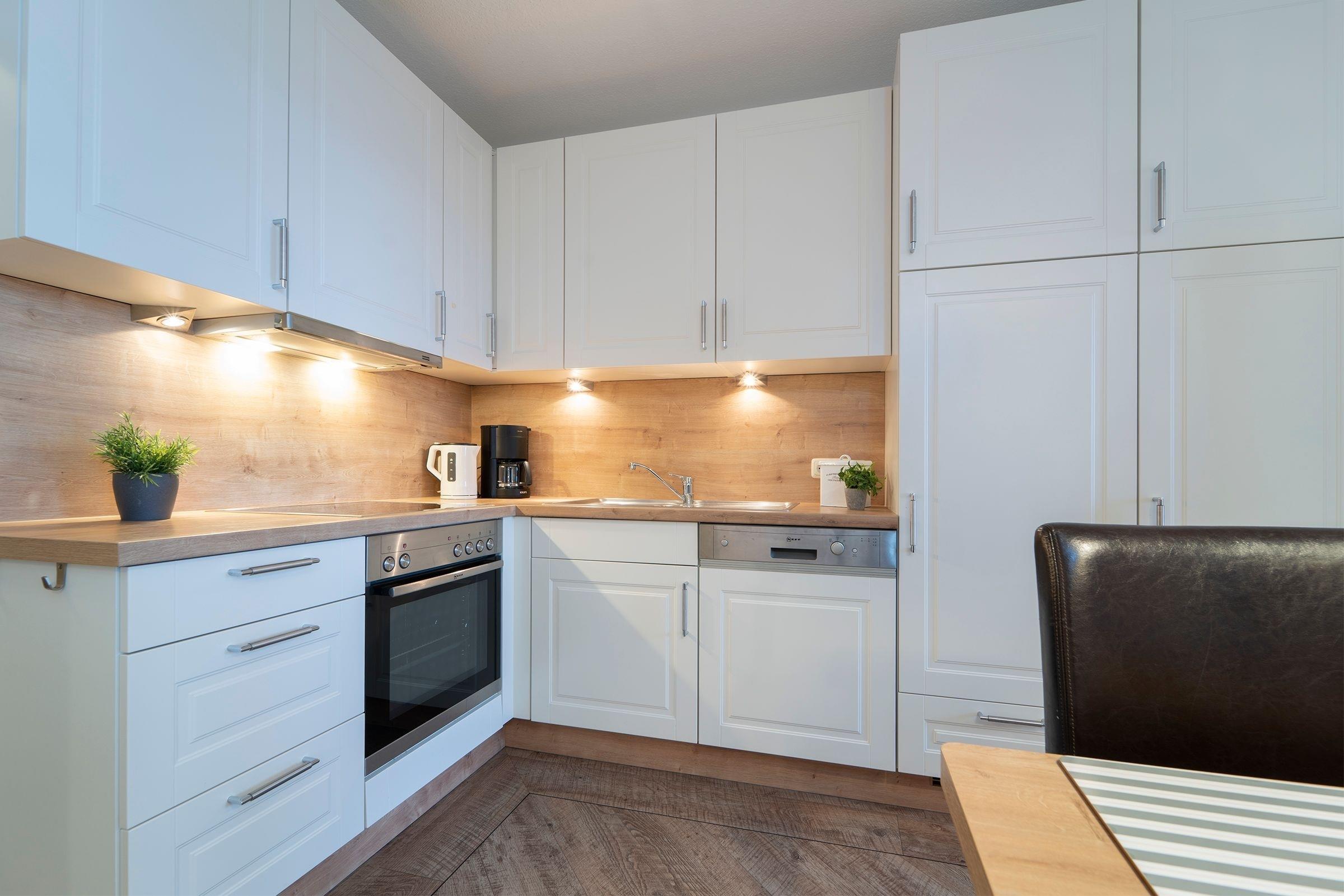 Die Ferienwohnung umfasst eine Wohnfläche von ca. 46m² , ist für bis zu 4 Personen geeignet und verfügt über einen großen Balkon. Der kombinierte Wohn-/Schlafbereich besticht durch geschmackvolles Ambiente. Das Elternbett (2x 90x200 cm) hat eine bequeme Komforthöhe. Das separate Schlafzimmer mit zusätzlichem Flachbildfernseher und integriertem DVD-Player bietet einen weiteren komfortablen Schlafplatz für bis zu 2 Personen im Kojenbett (je 80x200 cm). Auch von hier genießen Sie einen herrlichen Blick aufs Meer. Die große Küche ist sehr gut ausgestattet, ein Geschirrspüler erleichtert den Urlaubsalltag. Im Badezimmer setzt sich das moderne Design fort. Im Wohnzimmer verfügt der große Smart TV über viele Programme in HD-Qualität. Kostenloses, schnelles WLAN ist selbstverständlich.