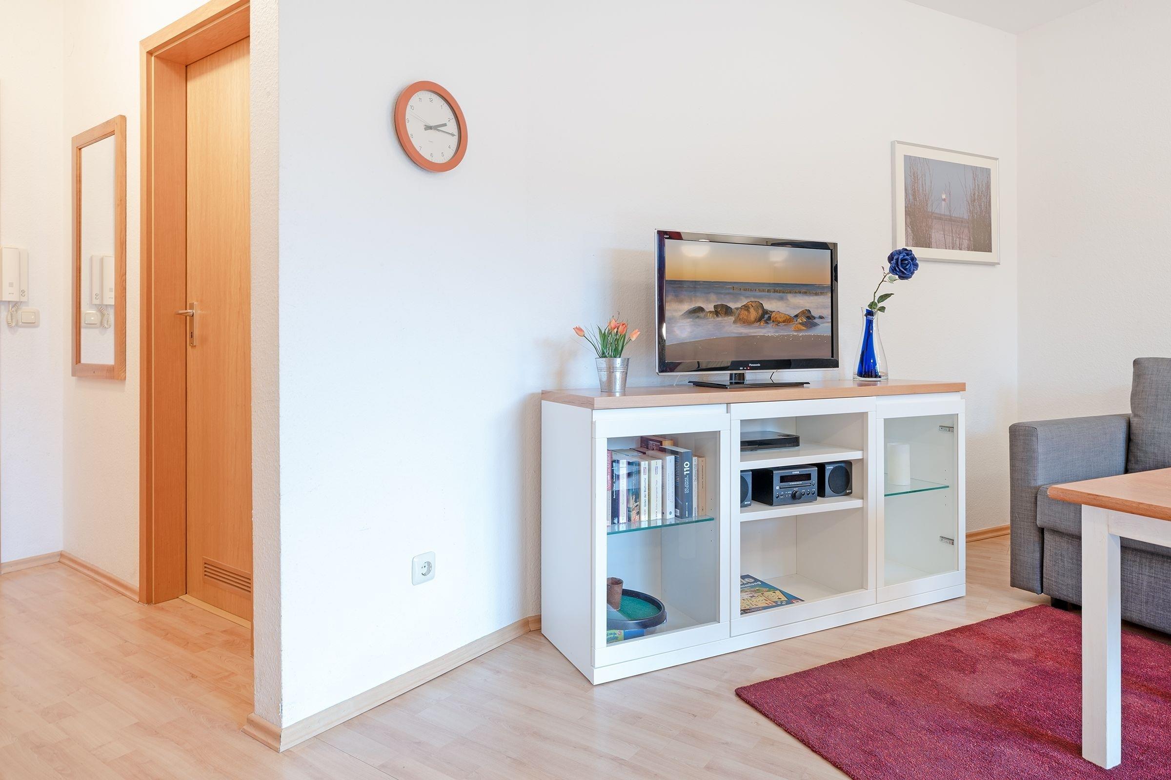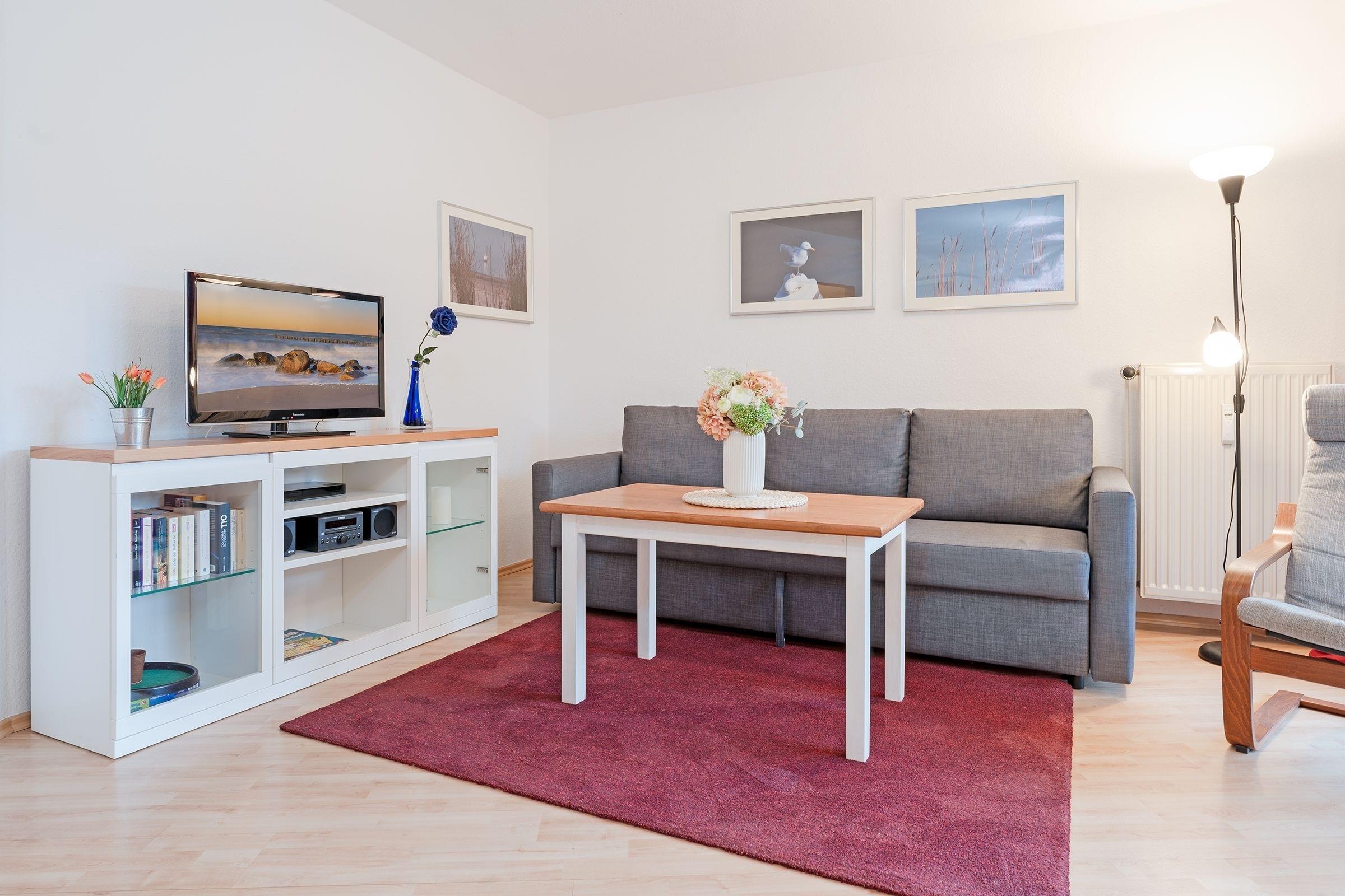 Wohnzimmer: Schlafsofa (140x200 cm), TV, Verdunkelungsmöglichkeit