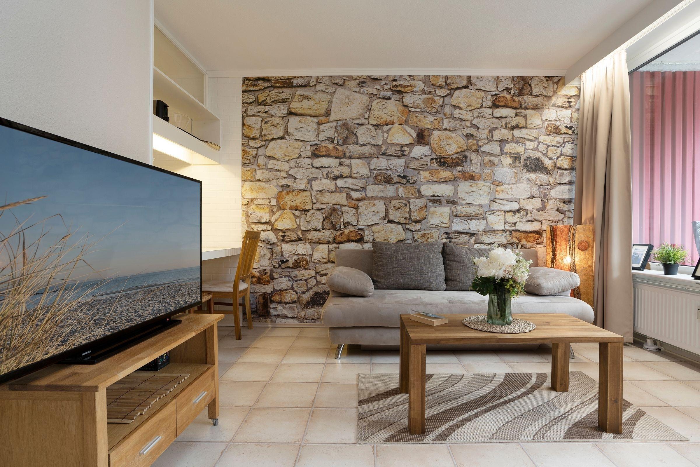 Für behagliche Nächte lassen Sie sich einfach in die Kissen des großen Doppelbetts (2x 90x200 cm) sinken. Gemütliche Fernsehabende können Sie auf dem komfortablen Sofa verbringen, das sich bei Bedarf einen weiteren Schlafplatz (90x200 cm) verwandeln lässt. Die gut durchdacht eingerichtete Küche ermöglicht Ihnen, sich und Ihre Lieben auch im Urlaub zu bekochen. Der Essbereich dient zeitgleich als Raumteiler. Der möblierte Balkon ist zur windgeschützten Landseite ausgerichtet. Hier können Sie die Nachmittagssonne und lauschige Abende genießen. Das moderne, hell geflieste Badezimmer mit Badewanne komplettiert die Ausstattung dieser schönen Ferienwohnung.