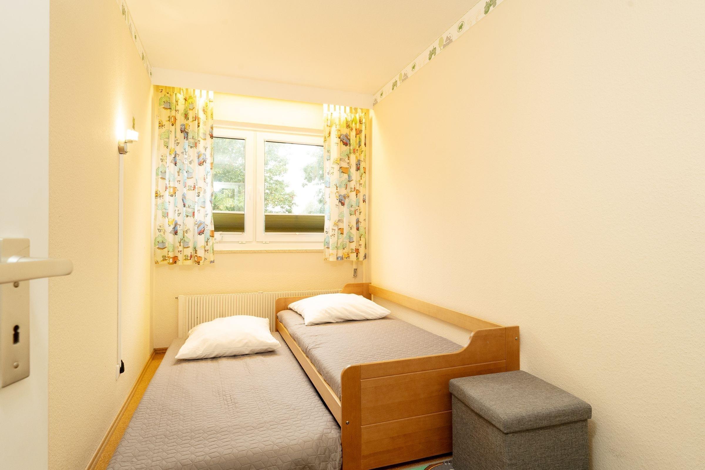Schlafzimmer: 1 ausziehbares Kojen Bett (je 90x200 cm), Verdunkelung (Plissees, Gardine)