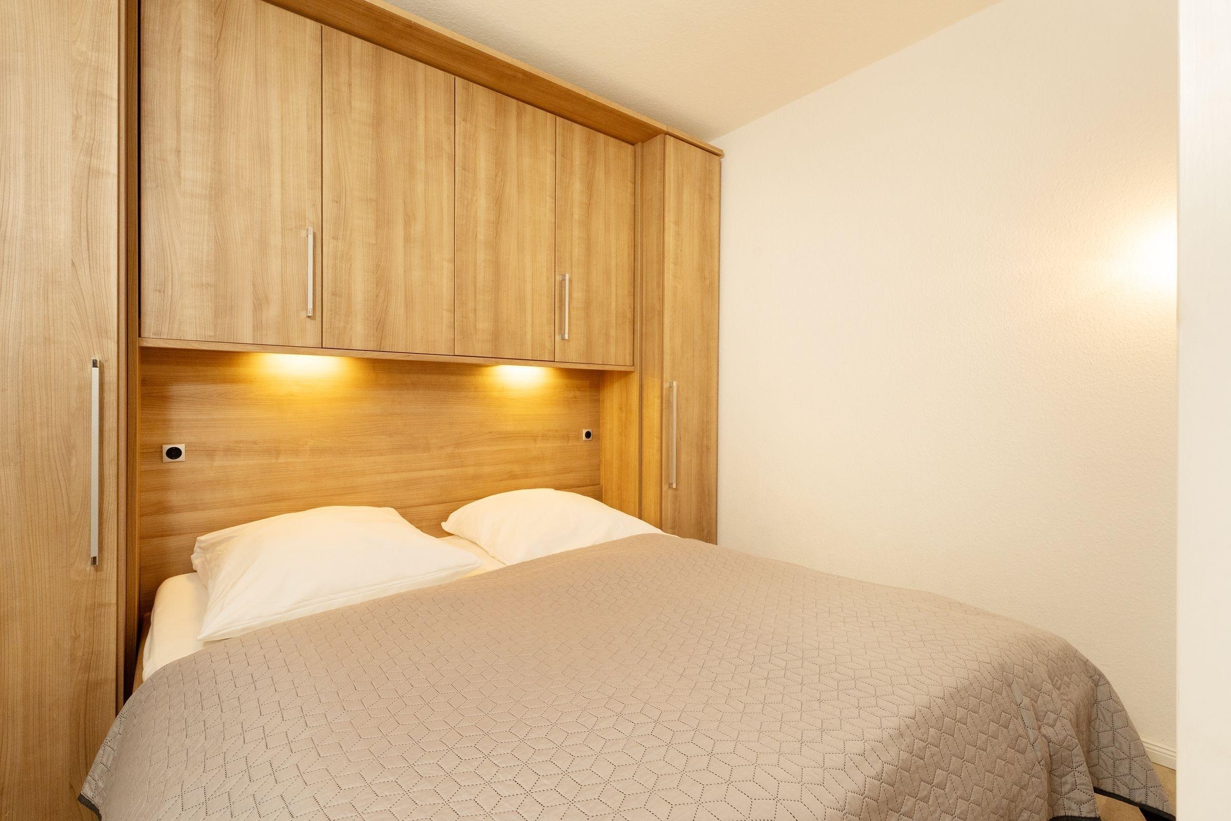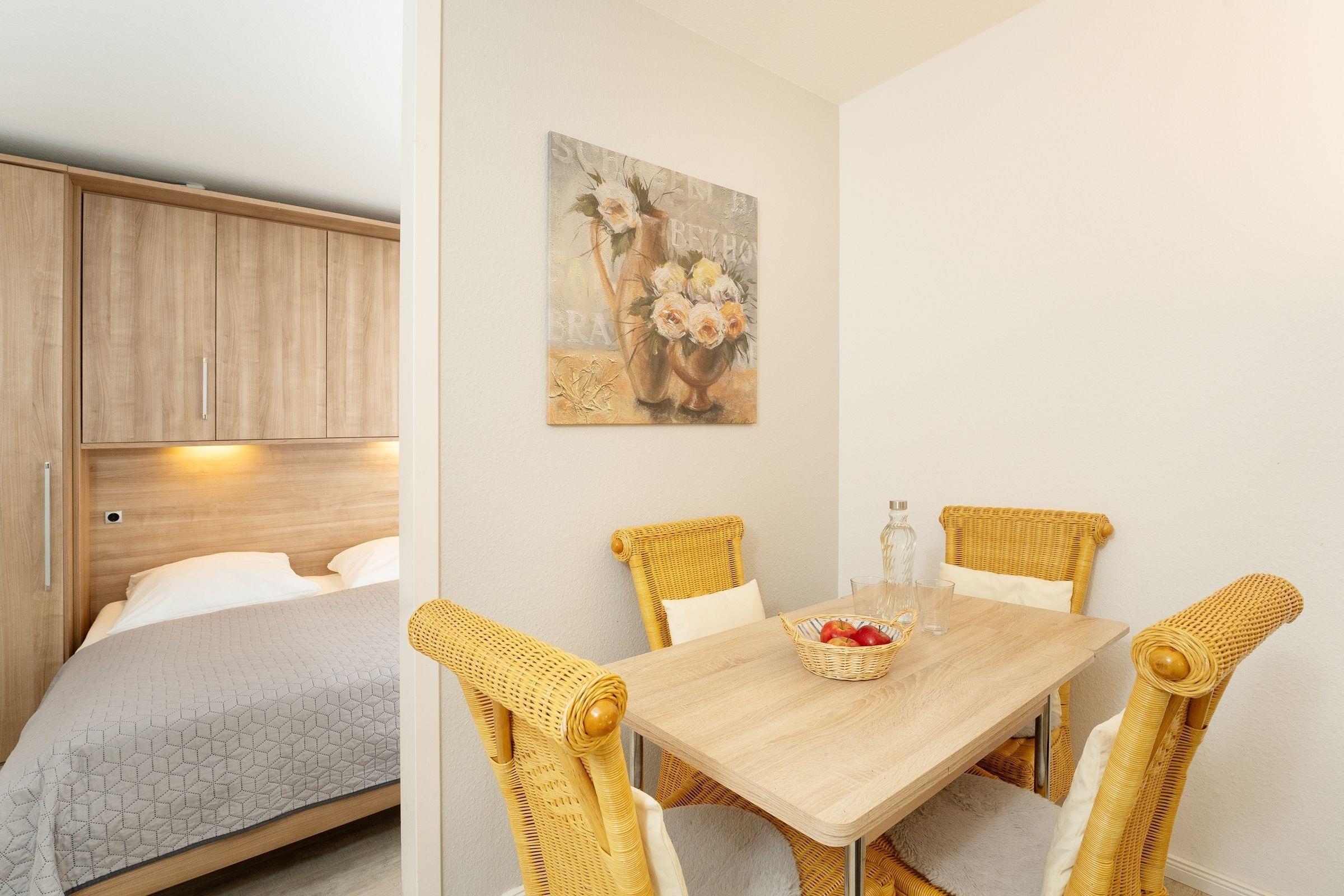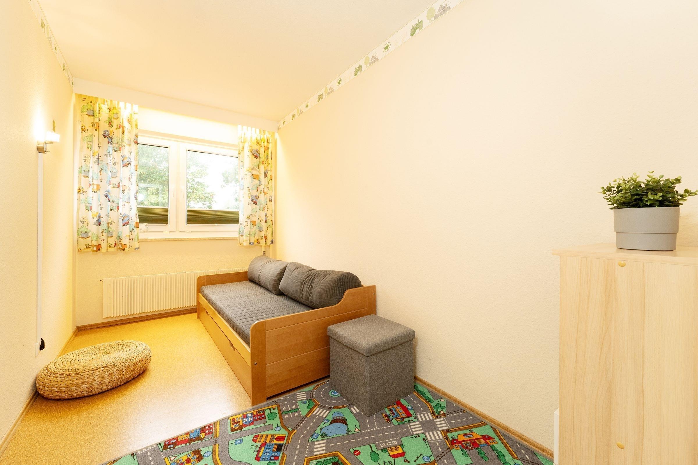 Der kombinierte Wohn- und Schlafraum wird durch einen Raumteiler optisch elegant getrennt. Ein Ecksofa mit Flachbildfernseher und ein Essplatz bilden den Mittelpunkt. Der gemütliche Schlafbereich im hinteren Bereich mit Doppelbett (2x 90x200 cm) lädt abends zum Träumen und Entspannen ein. Die kleine Küche ist durchdacht ausgestattet und Sie können hier Ihre Lieben verwöhnen. In einem separaten Kinderzimmer lässt sich das Kojenbett um einen zweiten Schlafplatz erweitern (je 90x200 cm). Abgerundet wird die Ausstattung dieser Wohnung durch das Wannenbad. Auf dem möblierten, zur Landseite gelegenen Balkon können Sie die Nachmittagssonne und die gesunde Ostseeluft genießen.