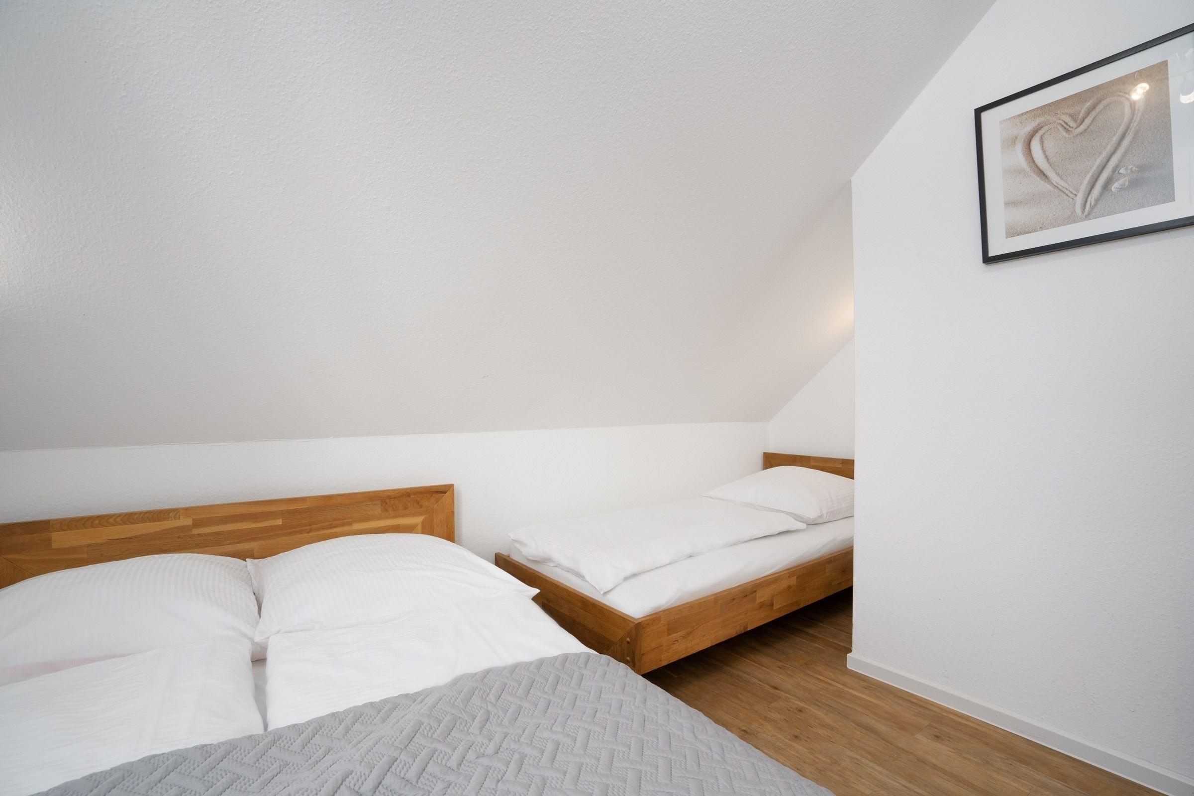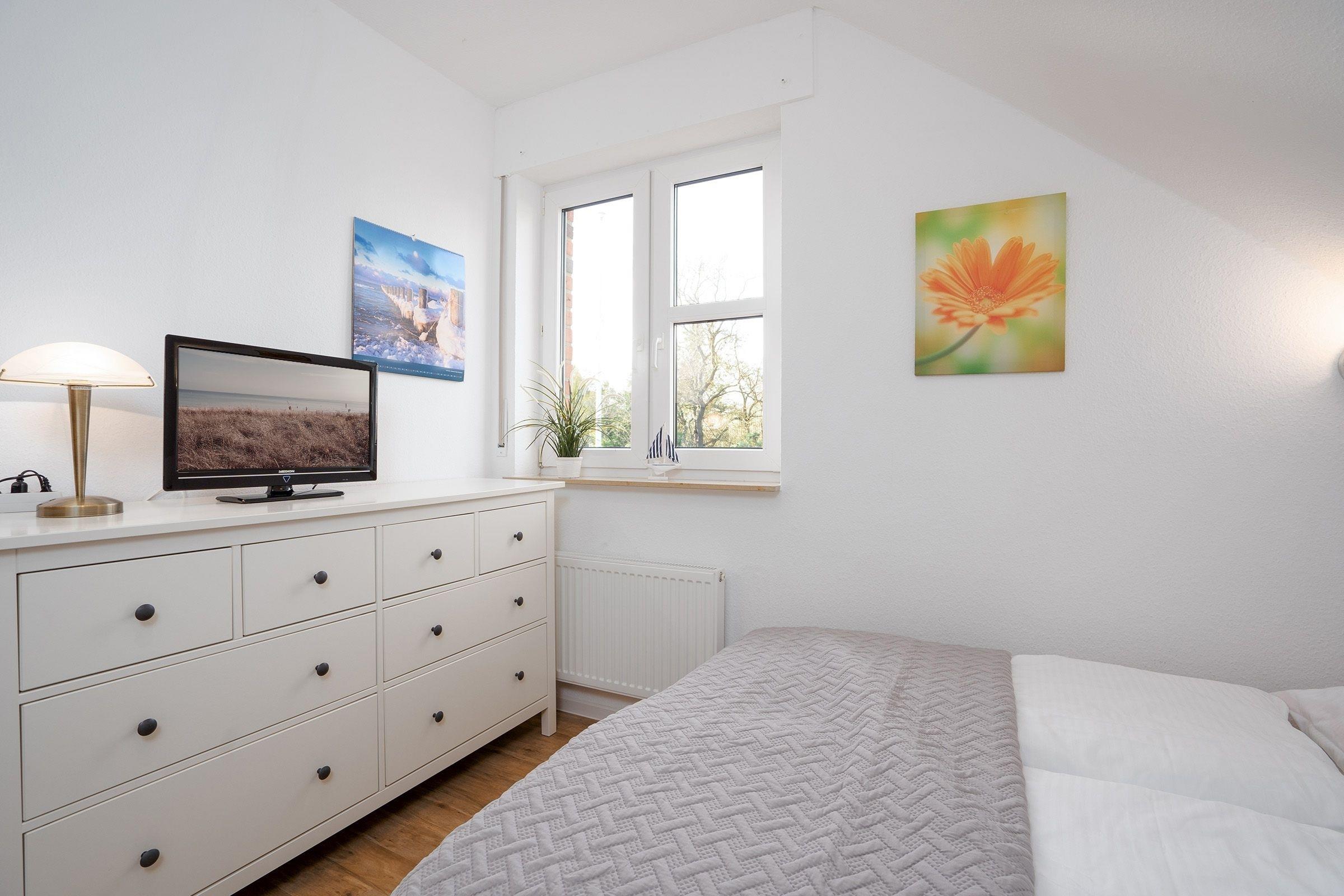 Schlafzimmer 2: 1 Einzelbett (90x200 cm), 1 kleines Doppelbett (140x200 cm), TV, Verdunkelung (Außenrollo)