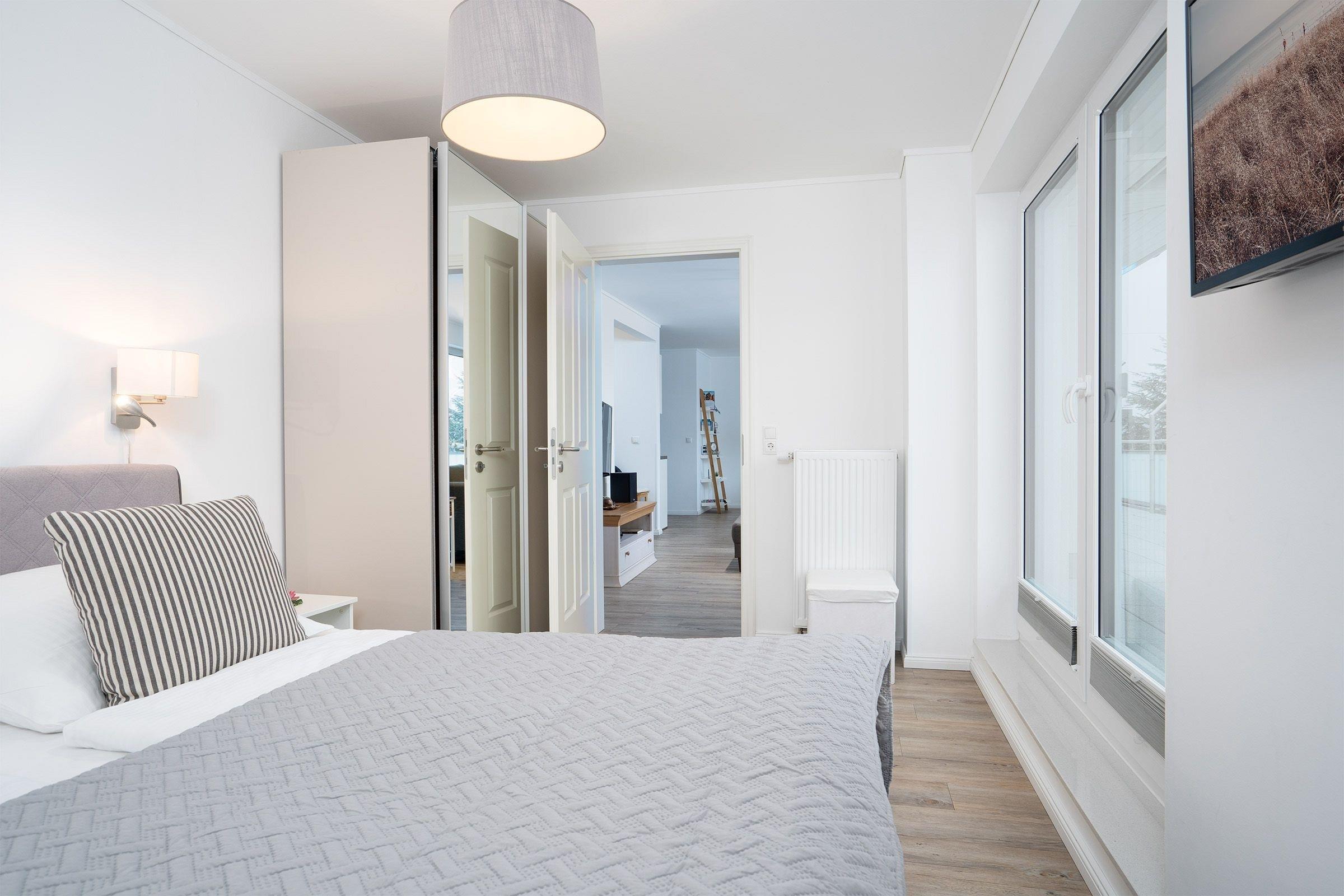 Es begrüßen Sie ein geschmackvoll eingerichtetes Wohn- und Esszimmer mit einer integrierten, voll ausgestatteten Küchenzeile. Zwei separate Schlafräume (1 komfortables Boxspring-Doppelbett 190x200 cm, 2 Einzelbetten mit je 90x200 cm) sowie ein Wohlfühlbad mit ebenerdiger Dusche warten auf Sie. Sowohl im Wohn- als auch in den Schlafräumen befindet sich je ein Smart-TV. Verdunkelungsplissees sorgen im in den Schlafzimmern für erholsame Nächte. Im Hauswirtschaftsraum steht Ihnen ein Waschtrockner zur Verfügung. Von allen Zimmern gelangen Sie auf die ca. 35 m² große Dachterrasse. Genießen Sie Ihr Frühstück im Strandkorb oder lassen Sie den Tag mit einem Grill-Abend ausklingen. Zusätzlich steht Ihnen ein Gemeinschaftsgarten mit Kinderspielplatz zur Verfügung. Ein Elektrogrill, ein Kinderhochstuhl, ein Kinderreisebett sowie der WLAN-Anschluss sind für Sie inklusive.