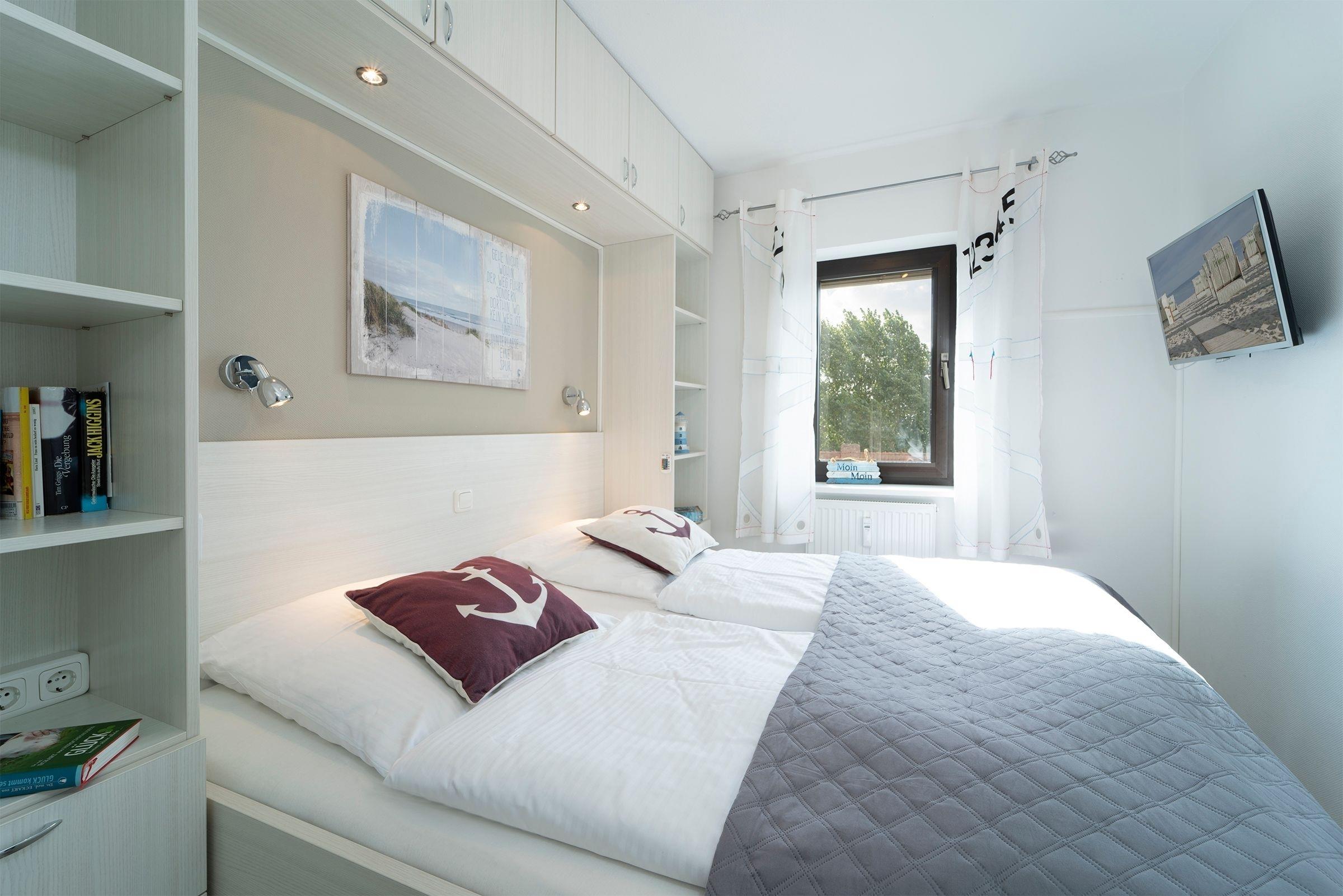 Schlafzimmer: 1 Doppelbett (180x200 cm), TV, Kleiderschrank, Verdunkelung (Außenrollo)